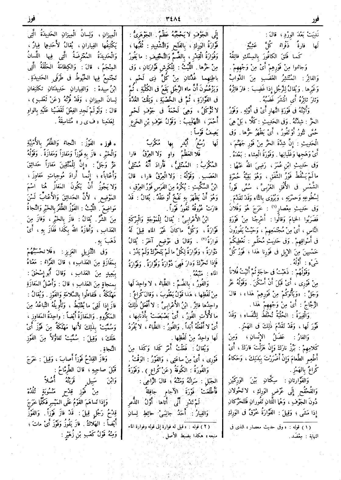 وقال في موضع آخر يقال دَوَّارة وفَوَّارة لكل ما لم يتحرّك ولم يدر فإِذا تحرّك ودار فهي دُوارة وفُوارة وفَوَّارة الماء مَنْبَعُه والفُورُ بالضم الظباء لا واحد لها من لفظها هذا قول يعقوب وقال كراع واحدها فائر ابن الأَعرابي لا أَفعل ذلك ما لأْلأَتِ الفُورُ أَي بَصْبصَت بأَذنابها أَي لا أَفعله أَبداً والفُورُ الظباء لا يفرد لها واحد من لفظها ويقال فعلتُ أَمرَ كذا وكذا من فَوْري أَي من ساعتي والفَوْرُ الوقت والفُورةُ الكُوفة عن كراع وفَوْرة الجبل سَراتُه ومَتْنُه قال الراعي فأَطْلَعَتْ فَوْرَةَ الآجامِ جافِلةً لم تَدْرِ أَنَّى أَتاها أَوَّلُ الذُّعرِ والفِيارُ أَحد جانبي حائط لسان الميزان ولسان الميزان الحديدة التي يكتنفها الفِيارانِ يقال لأَحدهما فِيارٌ والحديدةُ المعترِضة التي فيها اللسان المِنْجَمُ قال والكِظامَةُ الحَلْقة التي تجمع فيها الخيوط في طرفي الحديدة ابن سيده والفِيارانِ حديدتان تكتنفان لسان الميزان وقد فُرْتُه عن ثعلب قال ولو لم نجد الفعل لقضينا عليه بالواو ولعدمنا « ف ي ر » متناسقة ( فوز ) الفَوْزُ النَّجاءُ والظَّفَرُ بالأُمْنِيَّة والخيرِ فازَ به فَوْزاً ومَفازاً ومَفازَةَ وقوله عز وجل إِن للمتقين مَفازاً حَدائِقَ وأَعْناباً إِنما أَراد مُوجِبات مَفاوِز ولا يجوز أَن يكون المَفازُ هنا اسْمَ الموضع لأَن الحدائق والأَعناب لسن مواضع الليث الفَوْزُ الظَّفَرُ بالخير والنَّجاةُ من الشر يقال فازَ بالخير وفازَ من العذاب وأَفازَهُ الله بكذا ففازَ به أَي ذهب به وفي التنزيل العزيز فلا تَحْسَبَنَّهُمْ بِمَفَازةٍ من العذاب قال الفراء معناه ببعيد من العذاب وقال أَبو إِسحق بمنْجاةٍ من العذاب قال وأَصل المَفازَةِ مَهْلَكَةٌ فتفاءلوا بالسلامة والفَوْزِ ويقال فازَ إِذا لَقِيَ ما يُغْتَبَطُ وتأْويله التباعد من المكروه والمَفازَةُ أَيضاً واحدةُ المفاوِزِ وسميت بذلك لأَنها مَهْلَكة من فَوَّزَ أَي هَلَكَ وقيل سميت تفاؤلاً من الفَوْزِ النَّجاةِ وفازَ القِدْحُ فَوْزاً أَصابَ وقيل خرج قبل صاحبه قال الطرماح وابْن سَبِيلٍ قَرَيْتُه أُصُلاً من فَوْزِ قِدْحٍ مَنْسُوبَةٍ تُلُدُهْ وإِذا تساهم القوم على المَيْسِرِ فكلما خرج قِدْح رجل قيل قد فازَ فَوْزاً والفَوْزُ أَيضاً الهلاك فازَ يَفُوزُ وفَوَّزَ أَي مات ومنه قول كعب بن زهير