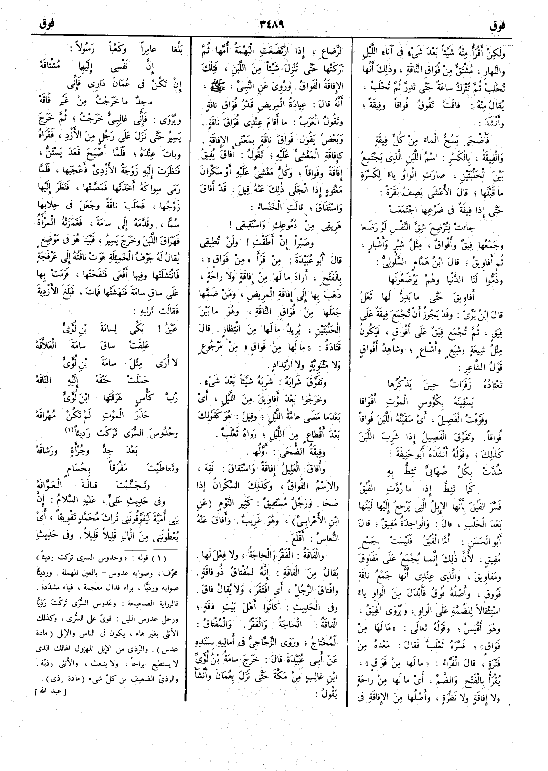 قال أبو عبيدة من قرأ من فَوَاقٍ بالفتح أراد ما لها من إفاقةٍ ولا راحة ذهب بها إلى إفاقة المريض ومن ضمها جعلها من فُوَاق الناقة وهو ما بين الحلبتين يريد ما لها من انتظار قال قتادة ما لها من فواق من مرجوع ولا مَثْنَوِيّةٍ ولا ارتداد وتَفَوَّقَ شرابَهُ شربه شيئاً بعد شيء وخرجوا بعد أفاوِيق من الليل أي بعدما مضى عامة الليل وقيل هو كقولك بعد أقطاع من الليل رواه ثعلب وفِيقةُ الضحى أوَّلها وأفاق العليلُ إفاقة واسْتَفاقَ نَقِه والاسم الفُواقَ وكذلك السكران إذا صحا ورجل مْستَفيق كثير النوم عن ابن الأعرابي وهو غريب وأفاقَ عنه النعاسُ أقلع والفَاقةُ الفقر والحاجة ولا فعل لها يقال من القافَةِ إنه لمُفْتاقٌ ذو فاقةٍ وافتاق الرجلُ أي افتقر ولا يقال فاق وفي الحديث كانوا أهل بيت فاقةٍ الفاقةُ الحاجة والفقر والمُفْتاق المحتاج وروى الزجاجي في أماليه بسنده عن أبي عبيدة قال خرج سامة بن لؤَي بن غالب من مكة حتى نزل بعُمَان وأنشأَ يقول بَلِّغا عامِراً وكَعْباً رسولاً إنْ نَفْسي إليهما مُشْتاقَةْ إن تكنْ في عُمَانَ دَاري فإني ماجدٌ ما خرجْتُ من غير فَاقَهْ ويروى فإني غالبيّ خرجت ثم خرج يسير حتى نزل على رجل من الأزْدِ فَقَرَاهُ وبات عنده فلما أصبح قعد يَسْتَنُّ فنظرت إليه زوجة الأزدي فأعجبها فلما رمى سواكه أخذتها فمصتها فنظر إليه زوجها فحلب ناقة وجعل في حلابها سمّاً وقدمه إلى سامة فغمزته المرأة فَهَراقَ اللبنَ وخرج يسير فيينا هو في موضع يقال له جوف الخَمِيلةِ هَوَتْ ناقته إلى عَرْفَجةٍ فانْتَشَلَتْها وفيها أفْعى فنفَحَتْها فرمت بها على ساق سامة فنهشتها فمات فبلغ الأزدية فقالت ترثيه عينُ بَكِّي لسامةَ بنِ لُؤيٍّ علِقَتْ ساقَ سامةَ العَلاَّقَة لا أرَى مثلَ سامةَ بن لُؤيٍّ حَمَلَتْ حَتْفَهُ إليه النّاقَة رُبَّ كأسٍ هَرَقْتَها ابنَ لؤيٍّ حَذَرَ الموت لم تكن مُهراقَةْ وحُدُوسَ السُّرى تَرَكْت رديئاً بعد جِدٍّ وجُرْأةٍ ورَشاقَة وتعاطيت مَفْرَقاً بحُسَامٍ وتَجَنَّبْتَ قالة العَوّاقَةْ وفي حديث علي عليه السلام إن بني أمية ليُفَوَّقونني تُراثَ محمد تَفْوْيِقاً أي يعطونني من المال قليلاً قليلاً وفي حديث