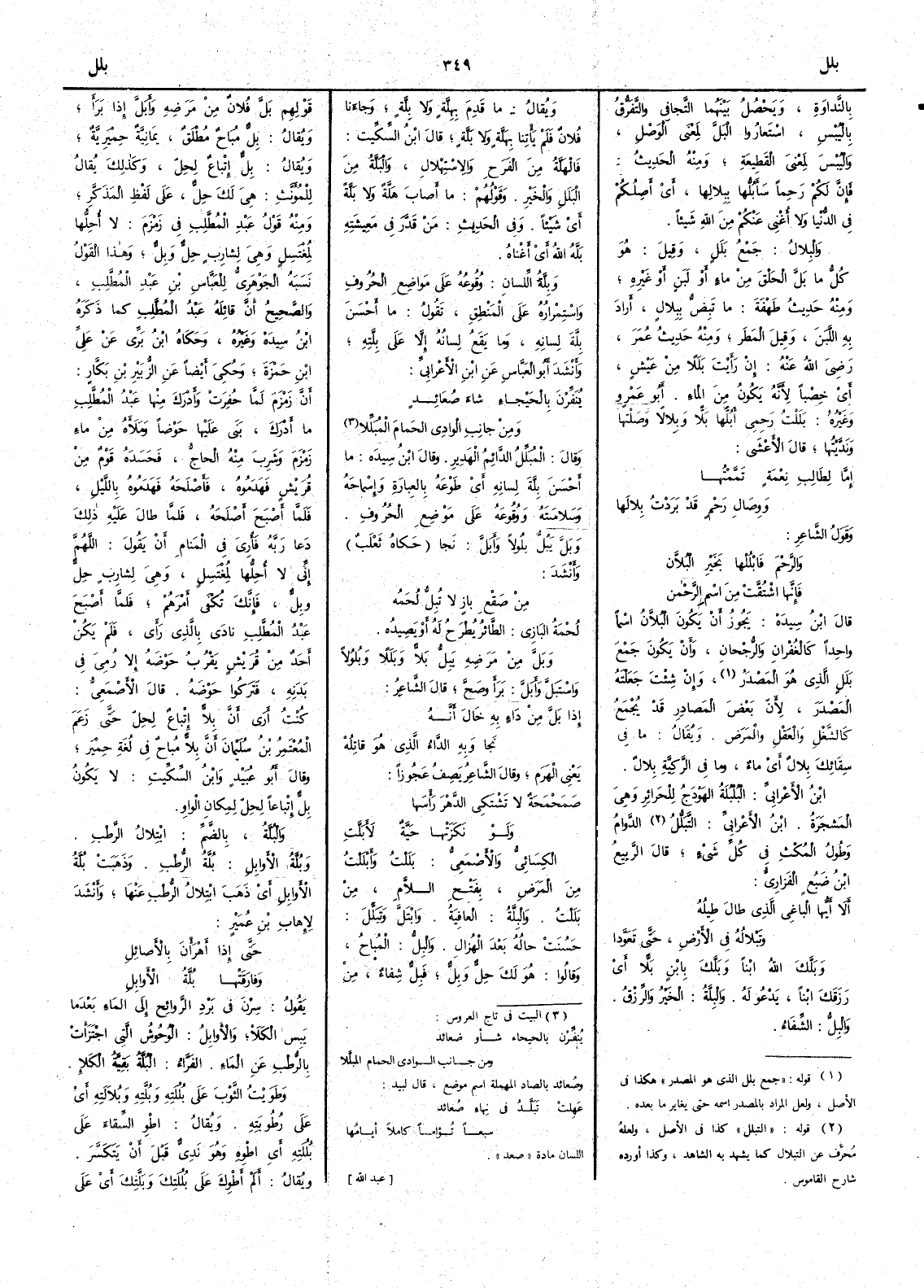 الدوام وطول المكث في كل شيء قال الربيع بن ضَبُع الفزاري أَلا أَيُّها الباغي الذي طالَ طِيلُه وتَبْلالُهُ في الأَرض حتى تَعَوَّدا وبَلَّك اللهُ ابْناً وبَلَّك بابْنٍ بَلاًّ أَي رَزَقَك ابناً يدعو له والبِلَّة الخَيْر والرزق والبِلُّ الشِّفَاء ويقال ما قَدِمَ بِهِلَّة ولا بِلَّة وجاءنا فلان فلم يأْتنا بِهَلَّة ولا بَلَّة قال ابن السكيت فالهَلَّة من الفرح والاستهلال والبَلَّة من البَلل والخير وقولهم ما أَصاب هَلَّة ولا بَلَّة أَي شيئاً وفي الحديث من قَدَّر في مَعِيشته بَلَّه الله أَي أَغناه وبِلَّة اللسان وقوعُه على مواضع الحروف واستمرارُه على المنطق تقول ما أَحسن بِلَّة لسانه وما يقع لسانه إِلا على بِلَّتِه وأَنشد أَبو العباس عن ابن الأَعرابي يُنَفِّرْنَ بالحيجاء شاءَ صُعَائد ومن جانب الوادي الحَمام المُبَلِّلا وقال المبَلِّل الدائم الهَدِير وقال ابن سيده ما أَحسن بِلَّة لسانه أَي طَوْعَه بالعبارة وإِسْماحَه وسَلاسَته ووقوعَه على موضع الحروف وبَلَّ يَبُلُّ بُلولاً وأَبَلَّ نجا حكاه ثعلب وأَنشد من صَقْع بازٍ لا تُبِلُّ لُحَمُه لُحْمَة البَازِي الطائرُ يُطْرَح له أَو يَصِيده وبَلَّ من مرضه يَبِلُّ بَلاًّ وبَلَلاً وبُلولاً واسْتَبَلَّ وأَبَلَّ برَأَ وصَحَّ قال الشاعر إِذا بَلَّ من دَاءٍ به خَالَ أَنه نَجا وبه الداء الذي هو قاتِله يعني الهَرَم وقال الشاعر يصف عجوزاً صَمَحْمَحة لا تشْتكي الدَّهرَ رأْسَها ولو نَكَزَتْها حَيَّةٌ لأَبَلَّتِ الكسائي والأَصمعي بَلَلْت وأَبْلَلْت من المرض بفتح اللام من بَلَلْت والبِلَّة العافية وابْتَلَّ وتَبَلَّل حَسُنت حاله بعد الهُزال والبِلُّ المُباحُ وقالوا هو لك حِلٌّ وبِلٌّ فَبِلٌّ شفاء من قولهم بَلَّ فلان من مَرَضه وأَبَلَّ إِذا بَرَأَ ويقال بِلٌّ مُبَاح مُطْلَق يمانِيَة حِمْيَريَّة ويقال بِلٌّ إِتباع لحِلّ وكذلك يقال للمؤنث هي لك حِلٌّ على لفظ المذكر ومنه قول عبد المطلب في زمزم لا أُحِلُّها لمغتسل وهي لشارب حِلٌّ وبِلٌّ وهذا القول نسبه الجوهري للعباس بن عبد المطلب والصحيح أَن قائله عبد المطلب كما ذكره ابن سيده وغيره وحكاه ابن بري عن علي بن حمزة وحكي أَيضاً عن الزبير بن بَكَّار أَن زمزم لما حُفِرَتْ وأَدرك منها عبد المطلب ما أَدرك بنى عليها حوضاً وملأَه من ماء زمزم وشرب منه الحاجُّ فحسده قوم من قريش فهدموه فأَصلحه فهدموه بالليل فلما أَصبح أَصلحه فلما طال عليه ذلك دعا ربه فأُرِيَ في المنام أَن يقول اللهم إِني لا أُحِلُّها لمغتسل وهي لشارب حِلٌّ وبِلٌّ فإِنك تكفي أَمْرَهم فلما أَصبح عبد المطلب نادى بالذي رأَى فلم يكن أَحد من قريش يقرب حوضه إِلا رُميَ في بَدَنه فتركوا حوضه قال الأَصمعي كنت أَرى أَن بِلاًّ إِتباع لحِلّ حتى زعم المعتمر بن سليمان أَن بِلاًّ مباح في لغة حِمْيَر وقال أَبو عبيد وابن السكيت لا يكون بِلٌّ إِتباعاً لحِلّ لمكان الواو والبُلَّة بالضم ابتلال الرُّطْب وبُلَّة الأَوابل بُلَّة الرُّطْب وذهبت بُلَّة الأَوابل أَي ذهب ابتلال الرُّطْب عنها وأَنشد لإِهاب ابن عُمَيْر حتى إِذا أَهْرَأْنَ بالأَصائل وفارَقَتْها بُلَّة الأَوابل يقول سِرْنَ في بَرْدِ الروائح إِلى الماء بعدما يَبِسَ الكَلأ والأَوابل الوحوش التي اجتزأَت بالرُّطْب عن الماء الفراء البُلَّة بقية الكَلإِ وطويت الثوب على بُلُلَته وبُلَّته وبُلالته أَي على رطوبته ويقال اطْوِ السِّقاء على بُلُلَته أَي اطوه وهو نديّ قبل أَن يتكسر ويقال أَلم أَطْوك على بُلُلَتِك وبَلَّتِك أَي على