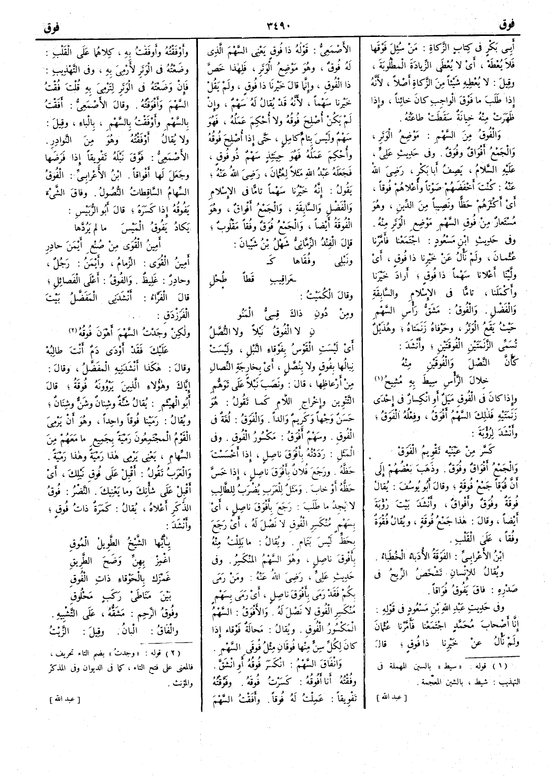 أبي بكر في كتاب الزكاة من سئل فَوقَها فلا يعطه أي لا يعطي الزيادة المطلوبة وقيل لا يعطيه شيئاً من الزكاة أصلاً لأنه إذا طلب ما فوق الواجب كان خائناً وإذا ظهرت منه خيانة سقطت طاعته والفُوقُ من السهم موضع الوَتَر والجمع أفْوَاق وفُوَقٌ وفي حديث علي عليه السلام يصف أبا بكر رضي الله عنه كنتَ أخفضهم صوتاً وأعلاهم فُوقاً أي أكثرهم حظّاً ونصيباً من الدين وهو مستعار من فُوقِ السهم موضع الوَتَر منه وفي حديث ابن مسعود اجتمعنا فأمّرْنا عثمان ولم نَألُ عن خيرنا ذا فُوقٍ أي ولَّيْنَا أعلانا سهماً ذا فُوقٍ أراد خيرنا وأكملنا تامّاً في الإسلام والسابقة والفضل والفُوق مَشَقُّ رأس السهم حيث يقع الوَتَر وحرفاة زَنَمتَاهُ وهذيل تسمي الزَّنَمَتَينِ الفُوقَتَينِ وأنشد كأنَّ النَّصْلَ والفُوقَيْنِ منه خلالَ الرأًس سِيطَ به مُشِيحُ وإذا كان في الفُوقِ مَيَل أو انكِسَارٌ في إحدى زَنَمتَيْه فذلك السهم أفْوَق وفعله الفَوَقُ وأنشد لرؤبة كَسَّر من عَيْنَيْه تقويم الفَوَقْ والجمع أفْوَاقٌ وفُوَق وذهب بعضهم إلى أن فُوَقاً جمع فُوقةٍ وقال أبو يوسف يقال فُوقَةٌ وفُوَقٌ وأفْوَاق وأنشد بيت رؤبة أيضاً وقال هذا جمع فُوقَةٍ ويقال فُقْوَة وفُقاً على القلب ابن الأعرابي الفَوَقَةُ الأدباءُ الخطباء ويقال للإنسان تشخص الريح في صدره فاقَ يَفُوقُ فُوَاقاً وفي حديث عبد الله بن مسعود في قوله إنَّا أصحابَ محمد اجتمعنا فأمَّرْنا عثمان ولم نَألُ عن خيرنا ذا فُوقٍ قال الأصعمي قوله ذا فُوقٍ يعني السهم الذي له فُوقٌ وهو موضع الوَتَرِ فلهذا خصَّ ذا الفُوقَ وإنما قال خيرنا ذا فُوقٍ ولم يقل خيرنا سَهْماً لأنه قد يقال له سهمٌ وإن لم يكن أُصْلِح فُوقُه ولا أُحْكِمَ عملهُ فهو سهم وليس بتامّ كاملٍ حتى إذا أُصْلِح فُوقُه وأُحْكِمَ عملهُ فهو حينئذ سهم ذو فُوقٍ فجعله عبد الله مثلاً لعثمان رضي الله عنه يقول إنه خيرنا سهماً تامّاً في الإسلام والفضل والسابقة والجمع أفْواقٌ وهو الفُوقَةُ أيضاً والجمع فُوَقٌ وفُقاً مقلوب قال الفِنْدْ الزِّمَّانيّ شَهْلُ بن شَيْبان ونَبْلي وفُقَاها كَ مَراقِيبِ قَطاً طُحْلِ وقال الكميت ومن دُونِ ذاكَ قِسِيُّ المَنُو نِ لا الفُوقُ نَبْلاً ولا النُّصَّل أي ليست القوس بفَوْقاءِ النَّ بْل وليست نِبالُها بفُوقٍ ولا بِنُصَّلٍ أي بخارجة النصال من أرعاظها قال ونصب نبلاً على توهم التنوين وإخراج اللام كما تقول هو حسنٌ وَجْهاً وكريمٌ والداً والفَوَق لغة في الفُوق وسهم أفْوَقُ مكسور الفُوقِ وفي المثل رددته بأفْوَقَ ناصلٍ إذا أخْسَسْتَ حظه ورجع فلان بأفْوَقَ ناصلٍ إذا خس حظه أو خاب ومثَل للعرب يضرب للطالب لا يجد ما طلب رجع بأفْوَقَ ناصلٍ أي بسهم منكسر الفُوقِ لا نصل له أي رجع بحَظٍّ ليس بتمام ويقال ما بَلِلْتُ منه بأفْوقَ ناصلٍ وهو السهم المنكسر وفي حديث عليّ رضي الله عنه ومَن رَمى بكم فقد رَمى بأفْوَقَ ناصلٍ أي رمى بسهم منكسر الفُوقِ لا نصل له والأفْوَقُ السهم المكسور الفُوقِ ويقال مَحالةٌ فَوْقاءُ إذا كان لكل سِنٍّ منها فُوقَانِ مثل فُوقَيِ السهم وانْفَاقَ السهمُ انكسر فُوقُه أو انشق وفُقْتُه أنا أفُوقُه كسرت فُوقَه وفَوَّقْتُه تَفْوِيقاً عملت له فُوقاً وأفَقْتُ السهم وأوفَقْتُه وأوفَقْتُ به كلاهما على القلب وضعته في الوَتَر لأرْمي به وفي التهذيب فإن وضعته في الوتر لترمي به قلت فُقْتُ السهم وأفْوَقْتهُ وقال الأصمعي أفَقْتُ بالسهم وأوْفَقْتُ بالسهم بالباء وقيل ولا يقال أوْفَقُتُه وهو من النوادر الأصمعي فَوَّق نبله تَفْويقاً إذا فرضها وجعل لها أفْواقاً ابن الأعرابي الفُوقُ السهام الساقطات النُّصُول وفاق الشيءَ يفُوقُه إذا كسره قال أبو الربيس يكاد يَفُوقِ المَيْسَ ما لم يَرُدّها أمينُ القوَى من صُنْعِ أيْمَنَ حادر أمين القوى الزمام وأيْمَنُ رجل وحادر غليظ والفُوق أعلى الفصائل قال الفراء أنشدني المفضل بيت الفرزدق ولكن وجَدْتُ السهمَ أهْوَنَ فُوقُهُ عليكَ فَقَدْ أوْد