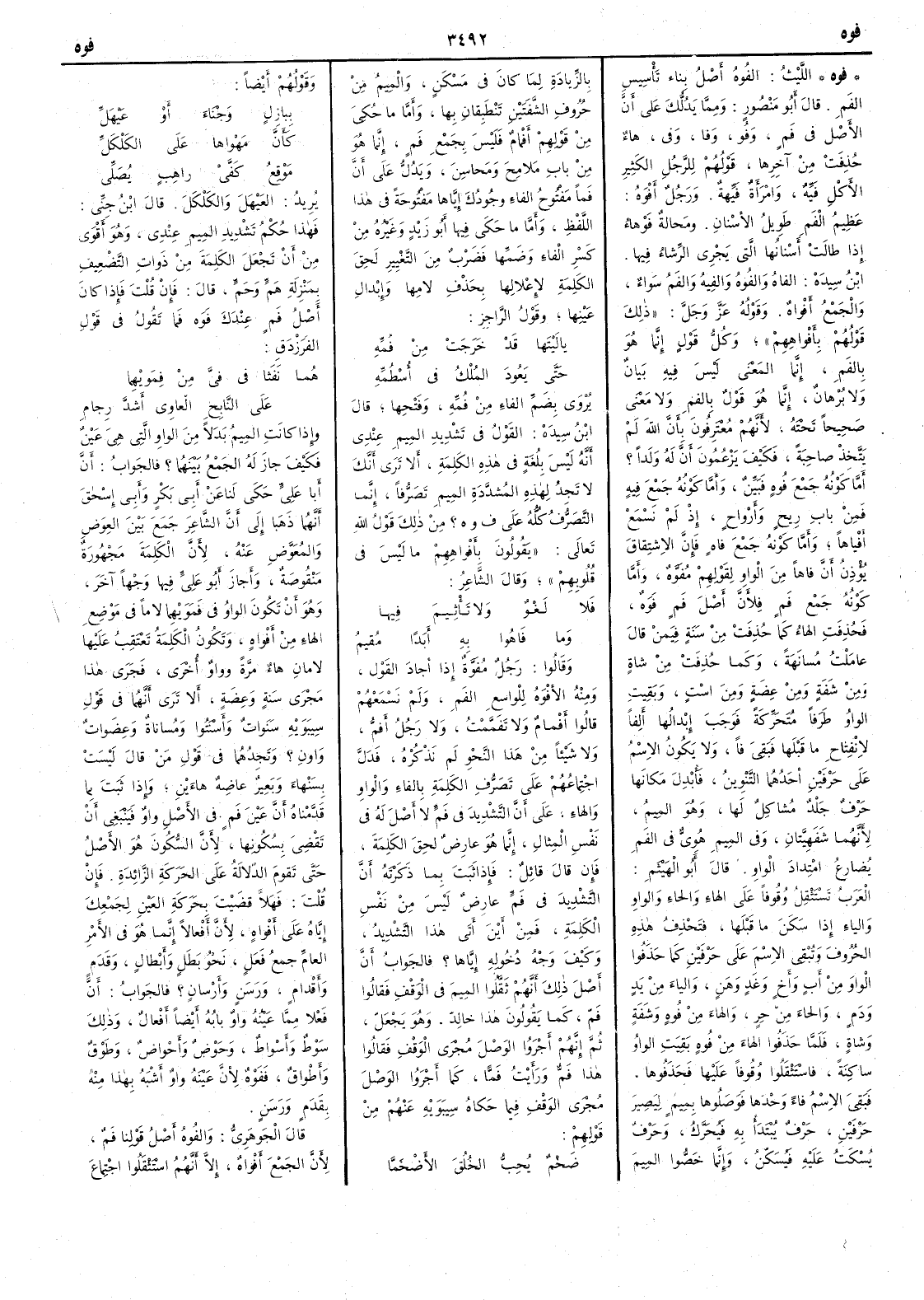 ( فوه ) الليث الفُوهُ أَصلُ بناء تأْسِيسِ الفمِ قال أَبو منصور ومما يَدُّلُّك على أَن الأَصل في فمٍ وفُو وفا وفي هاءٌ حُذِفَت من آخرها قولُهم للرجل الكثيرِ الأَكلِ فَيِّهٌ وامرأَة فَيِّهةٌ ورجل أَفْوَهُ عظيمُ الفَم طويلُ الاسنان ومَحالةٌ فَوْهاء إذا طالت أَسنانها التي يَجْري الرِّشاءُ فيها ابن سيده الفاهُ والفُوهُ والفِيهُ والفَمُ سواءٌ والجمعُ أَفواهٌ وقوله عزَّ وجل ذلك قولُهم بأَفْواهِهم وكلُّ قولٍ إنما هو بالفم إنما المعنى ليس فيه بيانٌ ولا بُرْهانٌ إنما هو قولٌ بالفمِ ولا معنى صحيحاً تَحْتَه لأَنهم معترفون بأَنّ اللهَ لم يتَّخِذْ صاحبةً فكيف يَزْعُمون أَنَّ له ولداً ؟ أَما كونُه جمعَ فُوهٍ فبَيِّنٌ وأَما كونه جمع فِيهٍ فَمِنْ باب ريحٍ وأَرْواحٍ إذ لم نسْمَعْ أَفْياهاً وأَما كونُه جمعَ فاهٍ فإن الاشتقاق يؤْذن أَن فاهاً من الواو لقولهم مُفَوَّةٌ وأَما كونه جمع فِمٍ فلأَنَّ أَصلَ فَمٍ فَوَهٌ فحُذِفت الهاء كما حذفت مِنْ سَنةٍ فيمن قال عامَلْتُ مُسانَهةً وكما حُذِفت من شاةٍ ومن شَفَةٍ ومن عِضَةٍ ومن اسْتٍ وبقيت الواو طرفاً متحركة فوجب إبدالُها أَلفاً لانفتاح ما قبلها فبقي فاً ولا يكون الاسم على حرفين أَحدُهما التنوينُ فأُبْدل مكانَها حرفٌ جَلْدٌ مُشاكِلٌ لها وهو الميمُ لأَنهما شَفَهِيَّتان وفي الميم هُوِيٌّ في الفَمِ يُضارِعُ امتدادَ الواوِ قال أَبو الهيثم العربُ تستثقل وُقوفاً على الهاءِ والحاءِ والواوِ والياءِ إذا سَكَنَ ما قبلَها فتَحْذِفُ هذه الحروفَ وتُبْقي الاسمَ على حرفين كما حذفوا الواوَ من أَبٍ وأَخٍ وغَدٍ وهَنٍ والياءَ من يَدٍ ودَمٍ والحاءَ من حِرٍ والهاءَ من فُوهٍ وشَفةٍ وشاةٍ فلما حذفوا الهاءَ من فُوهٍ بقيت الواو ساكنة فاستثقلوا وقوفاً عليها فحذفوها فبقي الاسم فاءً وحدها فوصلوها بميم ليصيرَ حرفين حرفٌ يُبْتَدأُ به فيُحرَّك وحرفٌ يُسْكَت عليه فيُسَكِّن وإنما خَصُّوا الميم بالزيادة لِمَا كان في مَسْكَنٍ والميمُ من حروف الشَّفَتين تنطبقان بها وأَما ما حكي من قولهم أَفْمامٌ فليس بجمع فَمٍ إنما هو من باب مَلامِحَ ومَحاسِنَ ويدل على أَن فَماً مفتوحُ الفاء وُجُودك إياها مفتوحةً في هذا اللفظ وأَما ما حكى فيها أَبو زيد وغيرهُ من كسْرِ الفاء وضمِّها فضرْبٌ من التغيير لَحِقَ الكلمةَ لإعْلالِها بحذف لامِها وإبدال عيْنِها وأَما قول الراجز يا لَيْتَها قد خَرَجَتْ مِنْ فُمِّهِ حتى يَعودَ المُلْك في أُسْطُمِّهِ يُرْوَى بضم الفاء من فُمِّه وفتحِها قال ابن سيده القول في تشديد الميم عندي أَنه ليس بلغة في هذه الكلمة أَلا ترى أَنك لا تجد لهذه المُشدِّدةِ الميمِ تصَرُّفاً إنما التصرُّفُ كله على ف و ه ؟ من ذلك قولُ الله تعالى يقولون بأَفْواهِهم ما ليْسَ في قُلوبِهم وقال الشاعر فلا لَغْوٌ ولا تأْثِيمَ فيها وما فاهُوا به أَبداً مُقِيمُ وقالوا رجلٌ مُفَوَّه إذا أَجادَ القولَ ومنه الأفْوَهُ للواسعِ الفمِ ولم نسْمَعْهم قالوا أَفْمام ولا تفَمَّمت ولا رجل أَفَمّ ولا شيئاً من هذا النحو لم نذكره فدل اجتماعهم على تصَرُّفِ الكلمة بالفاء والواو والهاء على أَن التشديد في فَمٍّ لا أَصل له في نفس المثال إنما هو عارضٌ لَحِقَ الكلمة فإن قال قائل فإذا ثبت بما ذَكَرْتَه أَن التشديد في فَمٍّ عارض ليس من نفس الكلمة فمِنْ أَيْنَ أَتَى هذا التشديد وكيف وجهُ دخولهِ إياها ؟ فالجواب أَن أَصل ذلك أَنهم ثَقَّلوا الميمَ في الوقف فقالوا فَمّ كما يقولون هذا خالِدّ وهو يَجْعَلّ ثم إنهم أَجْرَوُا الوصل مُجْرَى الوقف فقالوا هذا فَمٌّ ورأَيت فَمّاً كما أَجْرَوُا الوصلَ مُجْرَى الوقف فيما حكاه سيبويه عنهم من قولهم ضَخْمٌ يُحِبُّ الخُلُقَ الأَضْخَمَّا وقولهم أَيضاً ببازِلٍ وَجْنَاءَ أَو عَيْهَلِّ كأَنَّ مَهْواها على الكَلْكَلِّ مَوْقِعُ كَفِّيْ راهِبٍ يُصَلِّي يريد العَيْهَلَ والكَلْكَلَ قال ابن جني فهذا حكم تشديد الميم عندي وهو أَقوى من أَن تَجْعَل الكلمةَ من ذوا
