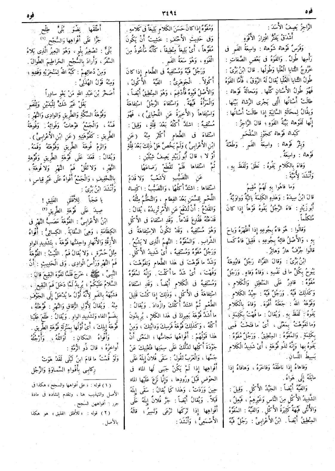 الراجز يصف الأَسد أَشْدَق يَفْتَرُّ افْتِرارَ الأَفْوَهَِ وفرس فَوْهاءِ شَوْهاء واسعة الفم في رأْسها طُولٌ والفَوَهُ في بعض الصفات خروجُ الثَّنايا العُلْيا وطولُها قال ابن بري طول الثنايا العليا يقال له الرَّوَقُ فأَما الفَوَهُ فهو طول الأَسنانِ كلِّها ومَحالةٌ فَوْهاء طالت أَسنانُها التي يَجْري الرِّشاءُ بينها ويقال لمحالة السانِيةِ إذا طالت أَسْنانُها إنها لَفَوْهاءُ بيِّنة الفَوَهِ قال الراجز كَبْداء فَوْهاء كجَوْزِ المُقْحَم وبئر فَوْهاء واسَعةُ الفمِ وطَعْنةٌ فَوْهاءُ واسعةٌ وفاهَ بالكلام يَفُوهُ نَطَقَ ولَفَظَ به وأَنشد لأُمَيَّةَ وما فاهُوا به لَهُمُ مُقيمُ قال ابن سيده وهذه الكلمة يائيَّة وواويَّة أَبو زيد فاهَ الرجل يَفُوه فَوْهاً إذا كان مُتكلِّماً وقالوا هو فاهٌ بجُوعِه إذا أَظْهَرَه وباحَ به والأَصل فائِهٌ بجُوعِه فقيل فاهٌ كما قالوا جُرُفٌ هارٌ وهائرٌ ابن بري وقال الفراء رجل فاوُوهةٌ يَبُوح بكلِّ ما في نفسه وفاهٌ وفاهٍ ورجل مُفَوَّهٌ قادرٌ على المَنْطِق والكلام وكذلك فَيِّهٌ ورجلٌ فَيِّهٌ جَيِّدُ الكلامِ وفَوهَه اللهُ جعَلَه أَفْوََِهَ وفاهَ بالكلام يَفُوه لَفَظَ به ويقال ما فُهْتُ بكلمةٍ وما تَفَوَّهْتُ بمعنى أَي ما فتَحْتُ فمِي بكلمة والمُفَوَّهُ المِنْطِيقُ ورجل مُفَوَّهُ بها وإِنه لذُو فُوَّهةٍ أَي شديدُ الكلامِ بَسِيطُ اللِّسان وفاهاهُ إذا ناطَقَه وفاخَرَه وهافاهُ إذا مايَلَه إلى هَواه والفَيِّهُ أَيضاً الجيِّدُ الأَكلِ وقيل الشديدُ الأَكلِ من الناس وغيرهم فَيْعِل والأُنثى فَيِّهةٌ كثيرةُ الأَكل والفَيِّهُ المُفَوَّهُ المِنْطِيقُ أَيضاً ابن الأَعرابي رجل فَيِّهٌ ومُفَوَّهٌ إذا كان حسَنَ الكلامِ بليغاً في كلامه وفي حديث الأَحْنَفِ خَشِيت أَن يكون مُفَوَّهاً أَي بليغاً مِنْطِيقاً كأنه مأْخوذ من الفَوَهِ وهو سَعةُ الفمِ ورجل فَيِّهٌ ومُسْتَفِيهٌ في الطعام إذا كان أَكُولاً الجوهري الفَيِّهُ الأَكولُ والأَصْلُ فَيْوِهٌ فأُدْغم وهو المِنْطيقُ أَيضاً والمرأَةُ فَيِّهةٌ واستَفاهَ الرجلُ اسْتِفاهةً واسْتِفاهاً الأَخيرة عن اللحياني فهو مُسْتَفِيهٌ اشتَدَّ أَكْلُه بعد قِلَّة وقيل اسْتَفاهَ في الطعام أَكثَرَ منه عن ابن الأَعرابي ولم يخصَّ هل ذلك بعدَ قلَّةٍ أَم لا قال أَبو زبيد يصف شِبْلَيْن ثم اسْتَفاها فلمْ تَقْطَعْ رَضاعَهما عن التَّصَبُّب لا شَعْبٌ ولا قَدْعُ اسْتَفاها اشتَدَّ أَكْلِهما والتَّصَبُّبُ اكْتساءُ اللحمِ للسِّمَنِ بعد الفِطامِ والتَّحلُّم مثلُه والقَدْعُ أَن تُدْفَعَ عن الأَمر تُريدُه يقال قَدَعْتُه فقُدِعَ قَدْعاً وقد اسْتَفاهَ في الأَكل وهو مُسْتَفِيهٌ وقد تكون الاسْتِفاهةُ في الشَّرابِ والمُفَوَّهُ النَّهِمُ الذي لا يَشْبَع ورجل مُفَوَّهٌ ومُسْتَفِيهٌ أَي شديدُ الأَكلِ وشَدَّ ما فَوَّهْتَ في هذا الطعام وتفَوَّهْتَ وفُهْتَ أَي شَدَّ ما أَكَلْتَ وإِنه لمُفَوَّه ومُسْتَفِيهٌ في الكلام أَيضاً وقد اسْتَفاهَ اسْتِفاهةً في الأَكل وذلك إذا كنت قليلَ الطَّعْم ثم اشتَدَّ أَكْلُك وازْدادَ ويقال ما أَشَدَّ فُوَّهَةَ بعيرِك في هذا الكَلإ يريدون أَكْلَه وكذلك فُوّهة فرَسِك ودابَّتِك ومن هذا قولهم أَفْواهُها مَجاسُّها المعنى أَن جَوْدةَ أَكْلِها تَدُلك على سِمَنِها فتُغْنيك عن جَسِّها والعرب تقول سَقَى فلانٌ إِبلَه على أَفْواهِها إذا لم يكن جَبَي لها الماءَ في الحوض قبل ورُودِها وإِنما نزَعَ عليها الماءَ حين وَرَدَتْ وهذا كما يقال سَقَى إبلَه قَبَلاً ويقال أَيضاً جَرَّ فلانٌ إبلَه على أَفْواهِها إذا تركها تَرْعَى وتسِير قاله الأَصمعي وأَنشد أَطْلَقَها نِضْوَ بُلَيٍّ طِلْحِ جَرّاً على أَفْواهِها والسُّجْحِ