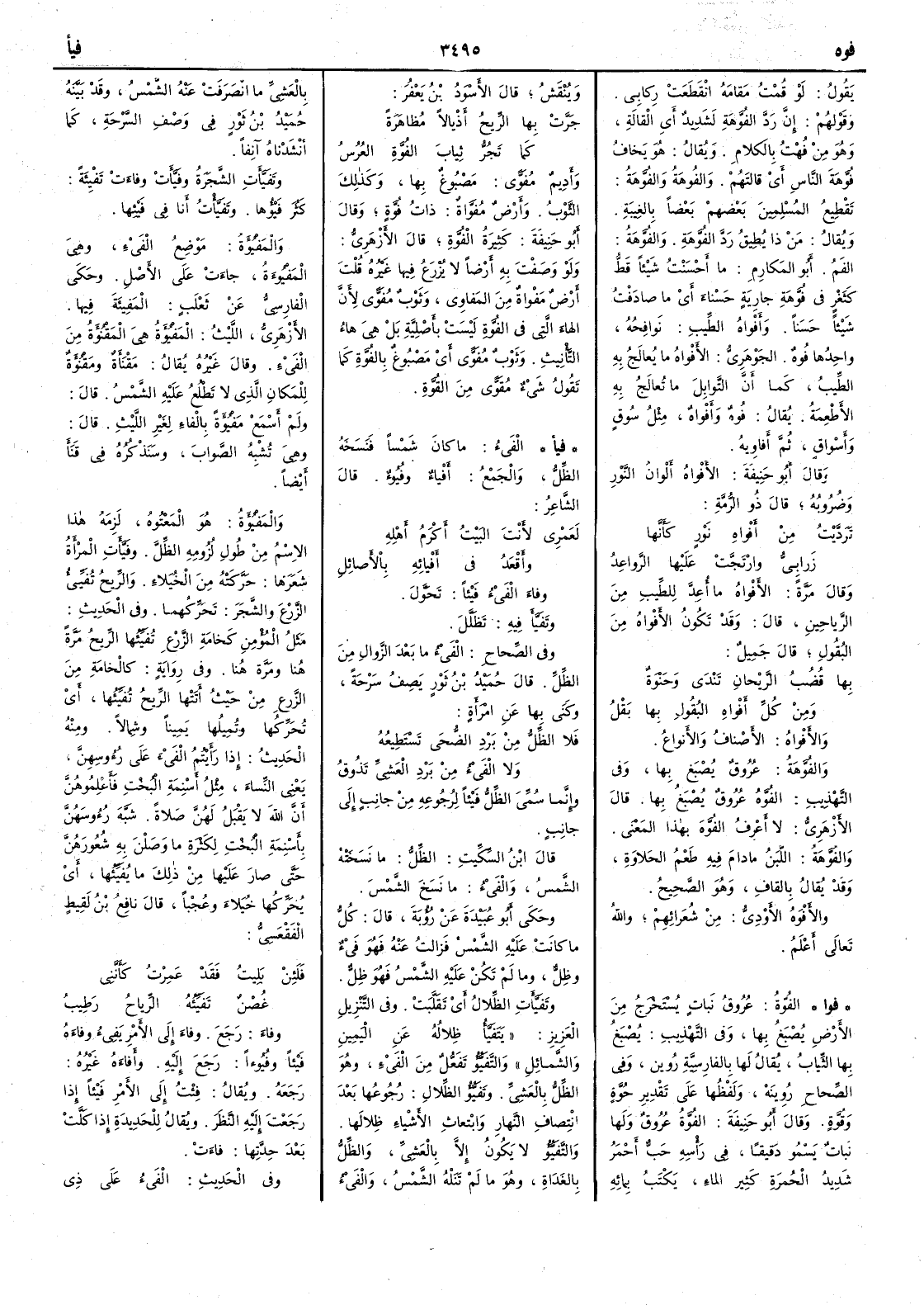( فوا ) الفُوّةُ عُروق نبات يستخرج من الأَرض يُصبغ بها وفي التهذيب يصبغ بها الثياب يقال لها بالفارسية رُوين وفي الصحاح رُوِينَه ولفظها على تقدير حُوّة وقُوّة وقال أَبو حنيفة الفُوّة عروق ولها نبات يسمو دقيقاً في رأْسه حَب أَحمر شديد الحمرة كثير الماء يكتب بمائه وينقش قال الأَسود ابن يعفر جَرَّتْ بها الرِّيحُ أَذْيالاً مُظاهَرةً كما تَجُرُّ ثِيابَ الفُوّةِ العُرُسُ وأَدِيمٌ مُفَوىً مصبوغ بها وكذلك الثوب وأرض مُفَوَّاة ذاتُ فُوّة وقال أَبو حنيفة كثيرة الفُوَّة قال الأَزهري ولو وصفت به أَرضاً لا يزرع فيها غيره قلت أَرضٌ مَفْواة من المَفاوِي وثوب مُفَوًّى لأَن الهاء التي في الفُوَّة ليست بأَصلية بل هي هاء التأْنيث وثوب مُفَوًّى أَي مصبوغ بالفُوَّة كما تقول شيء مُقَوًّى من القُوَّة ( فيأ ) الفَيْءُ ما كان شمساً فَنَسَخَه الظِّلُّ والجمع أَفْياءٌ وفُيُوءٌ قال الشاعر