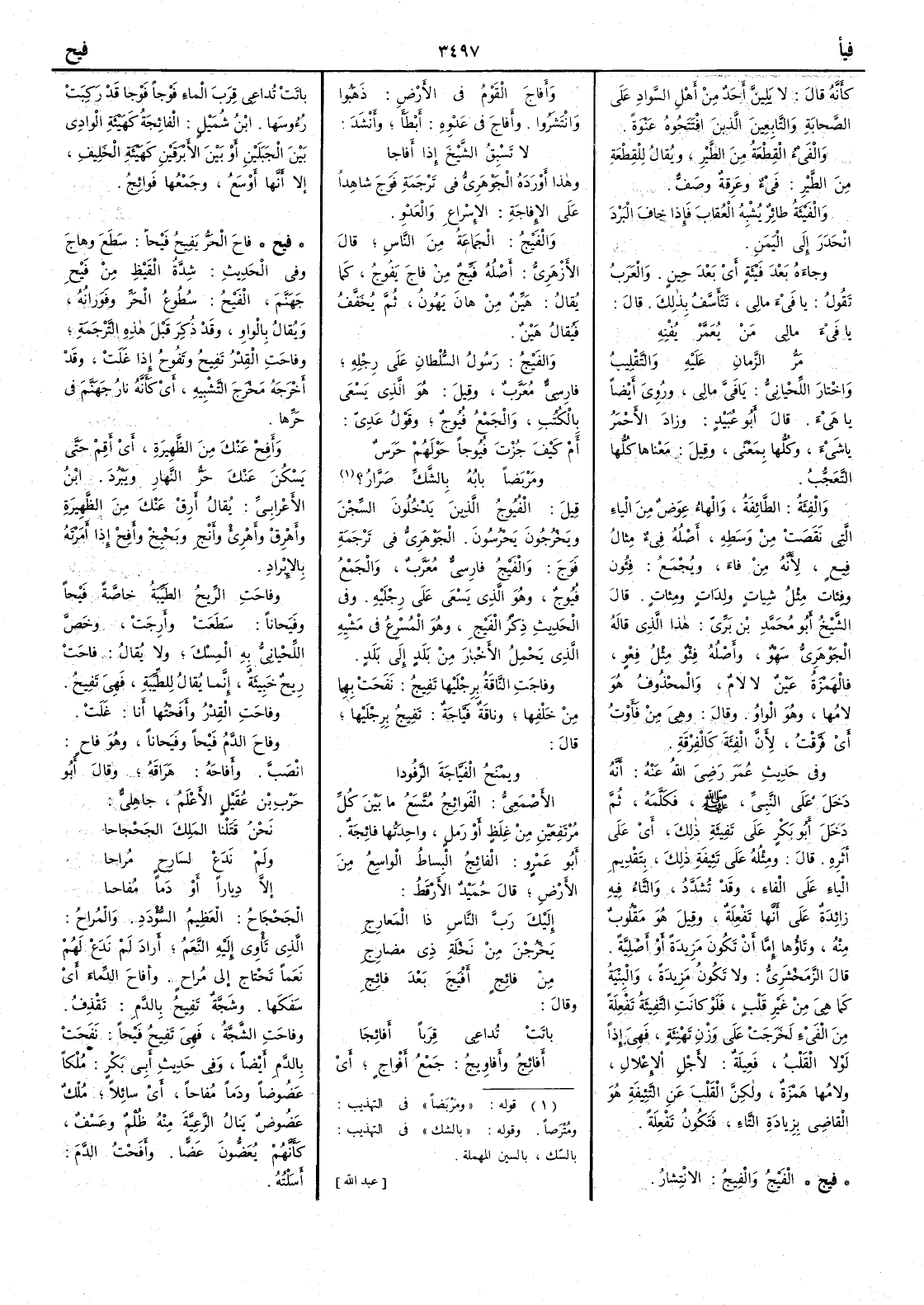 واختار اللِّحياني يا فَيَّ مالي ورُوي أَيضاً يا هَيْءَ قال أَبو عبيد وزاد الأَحمر يا شيْءَ وكلها بمعنى وقيل معناها كلها التَّعَجُّب والفِئةُ الطائفةُ والهاء عوض من الياء التي نقصت من وسطه أَصله فِيءٌ مثال فِيعٍ لأَنه من فاءَ ويجمع على فِئون وفِئاتٍ مثل شِياتٍ ولِداتٍ ومِئاتٍ قال الشيخ أَبو محمد بن بري هذا الذي قاله الجوهري سهو وأَصله فِئْوٌ مثل فِعْوٍ فالهمزة عين لا لام والمحذوف هو لامها وهو الواو وقال وهي من فَأَوْتُ أَي فَرَّقْت لأَن الفِئة كَالفرقةِ وفي حديث عمر رضي اللّه عنه أَنه دخل على النبي صلى اللّه عليه وسلم فكلَّمه ثم دخل أَبو بكر على تَفِيئةِ ذلك أَي على أَثَرِه قال ومثله على تَئِيفةِ ذلك بتقديم الياءِ على الفاءِ وقد تشدَّد والتاءُ فيه زائدة على أَنها تَفْعِلة وقيل هو مقلوب منه وتاؤها إِما أَن تكون مزيدة أَو أَصلية قال الزمخشري ولا تكون مزيدة والبِنْيةُ كما هي من غير قلب فلو كانت التَّفِيئَةُ تَفْعِلةً من الفَيْءِ لخرجت على وزن تَهْنِئة فهي إِذاً لولا القلبُ فَعِيلةٌ لأَجل الإِعلال ولامها همزة ولكن القلب عن التَّئِيفة هو القاضي بزيادة التاءِ فتكون تَفْعِلةً ( فيج ) الفَيْجُ والفِيجُ الانْتِشارُ وأَفاجَ القومُ في الأَرض ذَهَبُوا وانْتَشَرُوا وأَفاجَ في عَدْوِه أَبطأَ وأَنشد لا تَسْبِقُ الشيْخَ إِذا أَفاجا وهذا أَورده الجوهري في ترجمة فوج شاهداً على الإِفاجة الإِسْراعِ والعَدْوِ والفَيْجُ الجماعة من الناس قال الأَزهري أَصله فَيِّجٌ من فاجَ يَفُوجُ كما يقال هَيِّنٌ من هانَ يَهُونُ ثم يخفف فيقال هَيْنٌ والفَيْجُ رسول السلطان على رِجْلِه فارسي مُعَرَّبٌ وقيل هو الذي يسعى بالكتب والجمع فُيُوجٌ وقول عدي أَمْ كَيْفَ جُزْتَ فُيُوجاً حَوْلَهُمْ حَرَسٌ ومَرْبَضاً بابُه بالشَّكِّ صَرَّارُ ؟ قيل الفُيُوجُ الذين يدخلون السجن ويخرجون يَحْرُسونَ الجوهري في ترجمة فوج والفَيْجُ فارسي معرَّب والجمع فُيُوجٌ وهو الذي يَسْعَى على رجليه وفي الحديث ذكر الفَيْجِ وهو المُسْرعُ في مَشْيِه الذي يحمل الأَخبار من بلد إِلى بلد وفاجَتِ الناقةُ برجليها تَفِيجُ نَفَحَتْ بهما من خَلْفِها وناقة فَيَّاجةٌ تَفِيجُ برجليها قال ويَمْنَحُ الفَيَّاجَةَ الرَّفُودا الأَصمعي الفوائِجُ مُتَّسَعُ ما بين كلِّ مرتفعين من غِلَظٍ أَو رمْلٍ واحدتها فائِجةٌ أَبو عمرو الفائِجُ البِساطُ الواسِعُ من الأَرض قال حميد الأَرقط إِلَيْكَ رَبّ الناسِ ذِي المَعارِجِ يَخْرُجْنَ مِنْ نَخْلة ذِي مَضارِجِ من فائِجٍ أَفْيَجَ بَعْدَ فائِجِ وقال باتَتْت تُداعي قِرَباً أَفائِجَا أَفائِجُ وأَفاوِيجُ جمع أَفْواجٍ أَي باتَتْ تُداعِي قِرَب الماءِ فَوْجاً فوجاً قد رَكِبَتْ رُؤوسها ابن شميل الفائجة كهيئة الوادي بين الجبلين أَو بين الأَبْرَقَينِ كهيئة الخَلِيفِ إِلاّ أَنها أَوسَعُ وجمعها فَوائِجُ