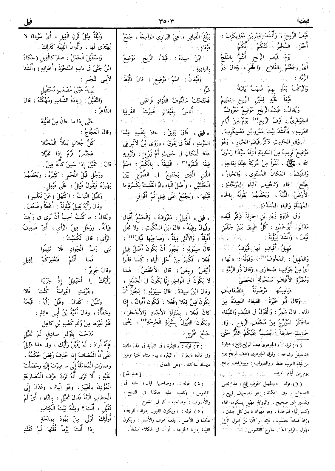 يعني جمع خُرْج وليلة مثل لون الفِيل أَي سَوْداء لا يهتدي لها وأَلوان الفِيَلة كذلك واسْتَفْيَل الجملُ صار كالفِيل حكاه ابن جني في باب اسْتَحْوذ وأَخواته وأَنشد لأَبي النجم يريد عَينَيْ مُصْعَب مُسْتَفْيِل والتفيُّل زيادة الشباب ومُهْكَته قال الشاعر حتى إِذا ما حانَ من تَفَيُّله وقال العجاج كلّ جُلالٍ يَمْلأُ المُحَبَّلا عجَنَّس قَرْم إِذا تَفَيَّلا قال تفيَّل إِذا سمن كأَنه فِيل ورجل فَيِّل اللحم كثيرة وبعضهم يهمزه فيقول فَيْئِل على فَيْعِل وتفيَّل النبات اكْتَهَل عن ثعلب وفَال رأْيُه يَفِيل فَيْلولة أَخْطأَ وضَعُف ويقال ما كنت أُحب أَن يرى في رأْيك فِيَالة ورجل فِيلُ الرأْي أَي ضعيف الرأْي قال الكميت بني رَبِّ الجَواد فلا تَفِيلوا فما أَنتم فنَعْذِرَكُم لفِيل وقال جرير رأَيتُك يا أُخَيْطِل إِذْ جَرَيْنا وجُرِّبَتِ الفِراسَةُ كنتَ فَالا وتفيَّل كَفال وفَيَّل رأْيَه قبَّحه وخطَّأَه وقال أُمية بن أَبي عائذ فَلَوْ غَيْرَها من وُلْد كَعْب بن كاهِلِ مدحْتَ بقول صادق لم تُفَيَّلِ فإِنه أَراد لم يفيَّل رأْيُك وفي هذا دليل على أَن المضاف إِذا حذف رِفِض حكمه وصارت المعاملة إِلى ما صرت إِليه وحصلت عليه أَلا ترى أَنه ترك حرف المضارعة المؤذن بالغَيْبة وهو الياء وعدل إِلى الخطاب البتة فقال تُفَيَّل بالتاء أَي لم تفيَّل أَنت ؟ ومثله بيت الكتاب أَولئك أَولَى من يَهودَ بِمِدْحَة إِذا أَنتَ يوماً قلتَها لم تُفَنَّد