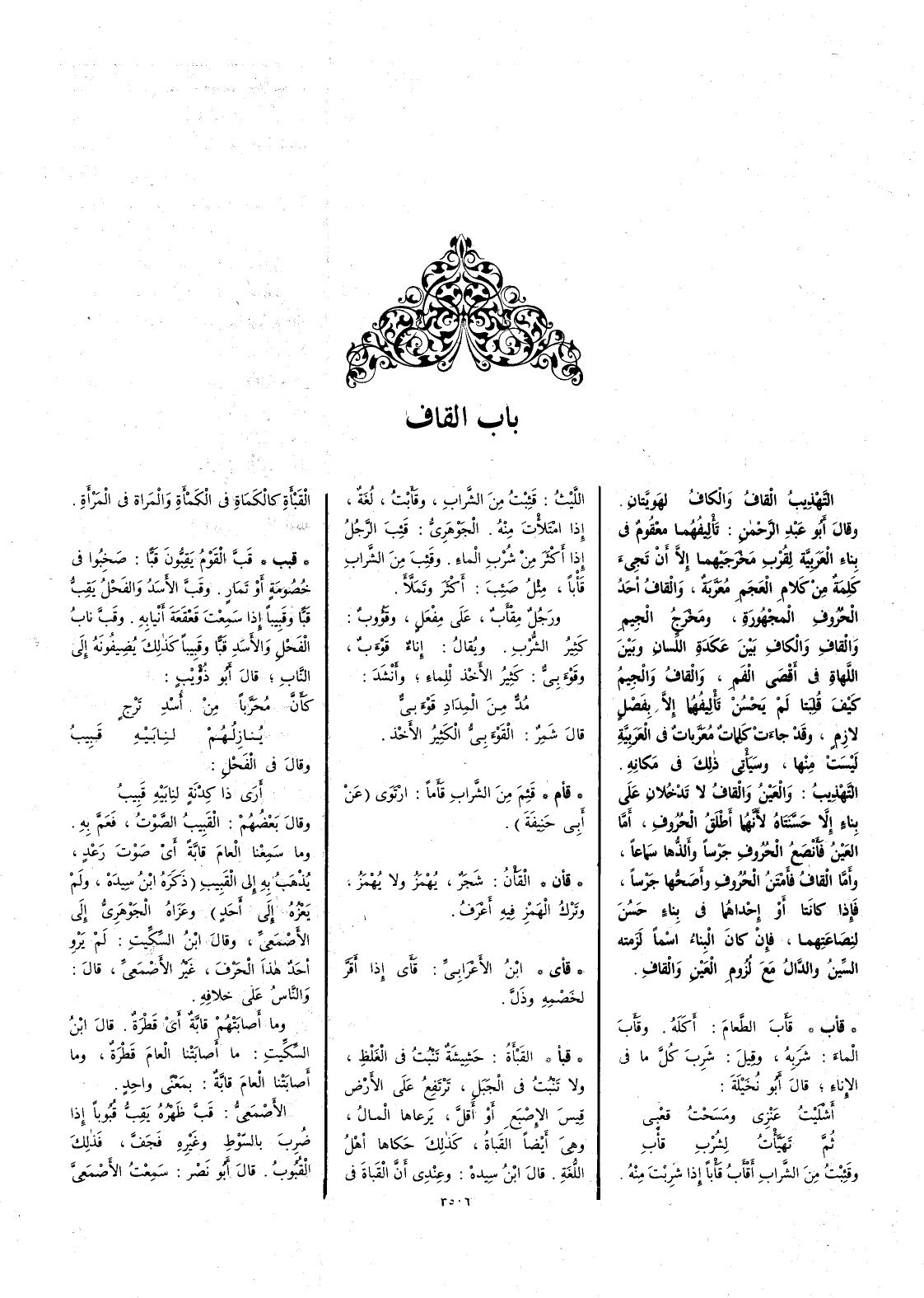 التهذيب القاف والكاف لَهَويَّتان وقال أَبو عبد الرحمن تأْليفهما معقوم في بناءِ العربية لقرب مخرجيهما إلاَّ أَن تجيءَ كلمة من كلام العجم معرَّبة والقاف أَحد الحروف المجهورة ومخرج الجيم والقاف والكاف بين عَكَدة اللسان وبين اللَّهاة في أَقصى الفم والقاف والجيم كيف قلبتا لم يحسن تأْليفهما إلاَّ بفصل لازم وقد جاءَت كلمات معرَّبات في العربية ليست منها وسيأّْتي ذلك في مكانه التهذيب والعين والقاف لا تدخلان على بناءٍ إلاَّ حسَّنتاه لأَنهما أَطلق الحروف أَما العين فأَنصع الحروف جَرْساً وأَلذها سماعاً وأَما القاف فأَمتن الحروف وأَصحها جرساً فإذا كانتا أَو إحداهما في بناءٍ حسُن لنَصاعتهما فإن كان البناءُ اسماً لزمته السين والدال مع لزوم العين والقاف (قأب) قَأَب الطعامَ أَكَله وقَأَبَ الماءَ شَرِبه وقيل شَرِبَ كلَّ ما في الإِناء قال أَبو نُخَيْلَة