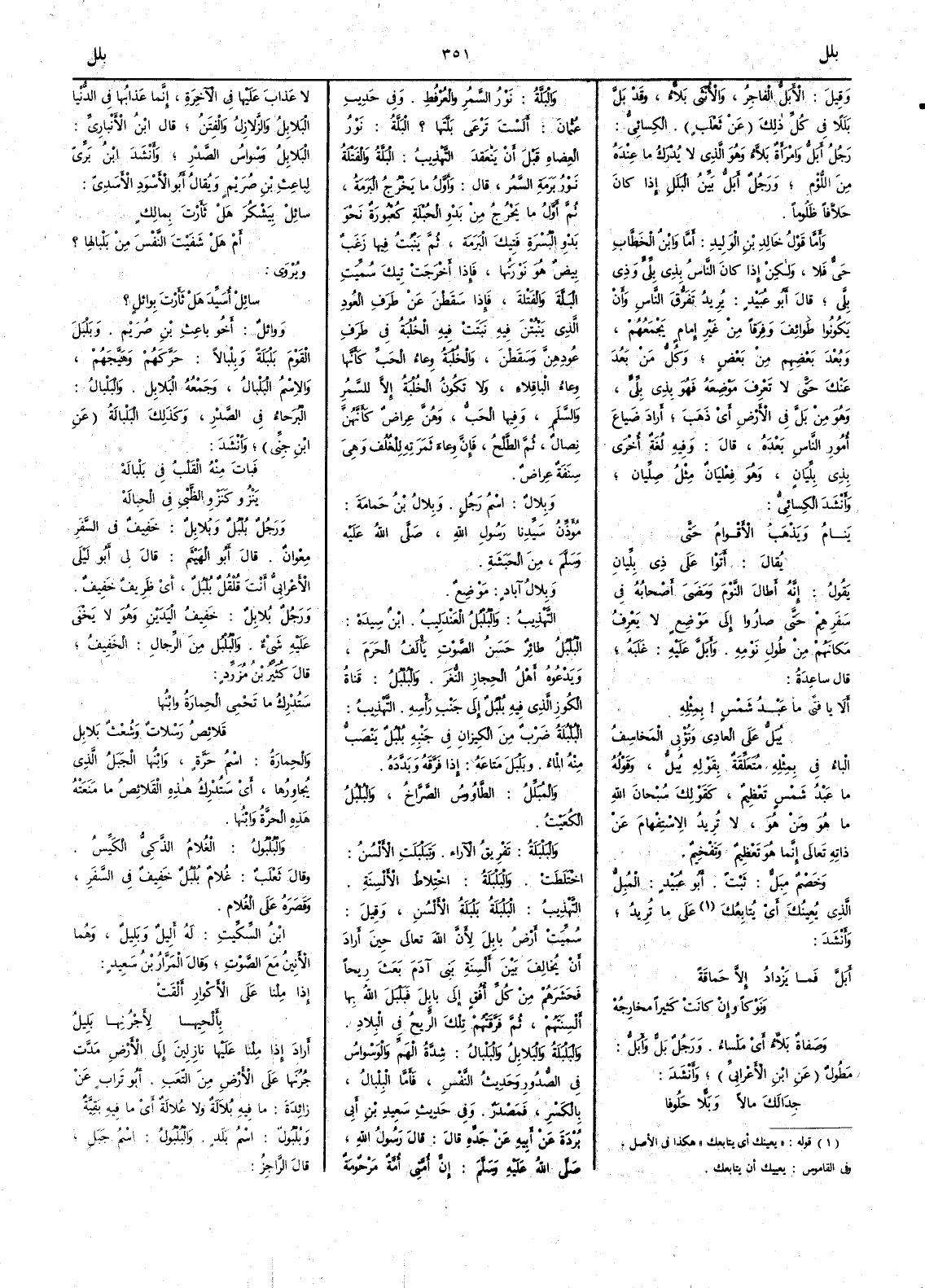 ( * قوله « يعينك اي يتابعك » هكذا في الأصل وفي القاموس يعييك ان يتابعك ) على ما تريد وأَنشد أَبَلَّ فما يَزْداد إِلاَّ حَماقَةً ونَوْكاً وإِن كانت كثيراً مخارجُه وصَفاة بَلاَّء أَي مَلْساء ورجل بَلٌّ وأَبَلُّ مَطول عن ابن الأَعرابي وأَنشد جِدَالَكَ مالاً وبَلاًّ حَلُوفا والبَلَّة نَوْرُ السَّمُر والعُرْفُط وفي حديث عثمان أَلَسْتَ تَرْعى بَلَّتَها ؟ البَلَّة نَوْرُ العِضاهِ قبل أَن ينعقد التهذيب البَلَّة والفَتْلة نَوْرُ بَرَمة السَّمُر قال وأَول ما يَخْرُج البرَمة ثم أَول ما يخرج من بَدْو الحُبْلَة كُعْبورةٌ نحو بَدْو البُسْرة فَتِيك البَرَمة ثم ينبت فيها زَغَبٌ بِيضٌ هو نورتها فإِذا أَخرجت تيك سُمِّيت البَلَّة والفَتْلة فإِذا سقطن عنن طَرَف العُود الذي يَنْبُتْنَ فيه نبتت فيه الخُلْبة في طرف عودهن وسقطن والخُلْبة وعاء الحَب كأَنها وعاء الباقِلاء ولا تكون الخُلْبة إِلاَّ للسَّمُر والسَّلَم وفيها الحب وهن عِراض كأَنهم نِصال ثم الطَّلْح فإِن وعاء ثمرته للغُلُف وهي سِنَفة عِراض وبِلال اسم رجل وبِلال بن حمامة مؤذن سيدنا رسول الله صلى الله عليه وسلم من الحبشة وبِلال آباد موضع التهذيب والبُلْبُل العَنْدَليب ابن سيده البُلْبُل طائر حَسَن الصوت يأْلف الحَرَم ويدعوه أَهل الحجاز النُّغَر والبُلْبُل قَناةُ الكوز الذي فيه بُلْبُل إِلى جنب رأْسه التهذيب البُلْبلة ضرب من الكيزان في جنبه بُلْبُل يَنْصَبُّ منه الماء وبَلْبَل متاعَه إِذا فرَّقه وبدَّده والمُبَلِّل الطاووس الصَّرَّاخ والبُلْبُل الكُعَيْت والبَلْبلة تفريق الآراء وتَبَلْبَلت الأَلسن اختلطت والبَلْبَلة اختلاط الأَلسنة التهذيب البَلْبلة بَلْبلة الأَلسن وقيل سميت أَرض بابِل لأَن الله تعالى حين أَراد أَن يخالف بين أَلسنة بني آدم بَعَث ريحاً فحشرهم من كل أُفق إِلى بابل فبَلْبَل الله بها أَلسنتهم ثم فَرَّقتهم تلك الريح في البلاد والبَلْبلة والبَلابل والبَلْبال شدَّة الهم والوَسْواس في الصدور وحديث النفس فأَما البِلْبال بالكسر فمصدر وفي حديث سعيد بن أَبي بردة عن أَبيه عن جده قال قال رسول الله صلى الله عليه وسلم إِن أُمتي أُمة مرحومة لا عذابٍ عليها في الآخرة إِنما عذابها في الدنيا البلابل والزلازل والفتن قال ابن الأَنباري البلابل وسواس الصدر وأَنشد ابن بري لباعث بن صُرَيم ويقال أَبو الأَسود الأَسدي سائلُ بيَشْكُرَ هل ثَأَرْتَ بمالك أَم هل شَفَيْت النفسَ من بَلْبالها ؟ ويروى سائِلْ أُسَيِّدَ هل ثَأَرْتَ بِوائلٍ ؟ ووائل أَخو باعث بن صُرَيم وبَلْبَل القومَ بَلْبلة وبِلْبالاً حَرَّكهم وهَيَّجهم والاسم البَلْبال وجمعه البَلابِل والبَلْبال البُرَحاء في الصَّدر وكذلك البَلْبالة عن ابن جني وأَنشد فبات منه القَلْبُ في بَلْبالَه يَنْزُو كَنَزْوِ الظَّبْيِ في الحِباله ورجل بُلْبُلٌ وبُلابِل خَفِيف في السَّفَر معْوان قال أَبو الهيثم قال لي أَبو ليلى الأَعرابي أَنت قُلْقُل بُلْبُل أَي ظَريف خَفيف ورجل بُلابِل خفيف اليدين وهو لا يَخْفى عليه شيء والبُلْبُل من الرجال الخَفِيفُ قال كثير بن مُزَرِّد سَتُدْرِك ما تَحْمي الحِمارة وابْنُها قَلائِصُ رَسْلاتٌ وشُعْثٌ بَلابِل والحِمارة اسم حَرَّة وابنُها الجَبَل الذي يجاورها أَي ستدرك هذه القلائص ما منعته هذه الحَرَّة وابنُها والبُلْبول الغلام الذَّكِيُّ الكَيِّس وقال ثعلب غلام بُلْبُل خفيف في السَّفَر وقَصَره على الغلام ابن السكيت له أَلِيلٌ وبَلِيلٌ وهما الأَنين مع الصوت وقال المَرَّار بن سعيد إِذا مِلْنا على الأَكْوار أَلْقَتْ بأَلْحِيها لأجْرُنِها بَليل أَراد إِذا مِلْنا عليها نازلين إِلى الأَرض مَدَّت جُرُنَها على الأَرض من التعب أَبو تراب عن زائدة ما فيه بُلالة ولا عُلالة أَي ما فيه بَقِيَّة وبُلْبُول اسم بلد والبُلْبُول اسم جَبَل قال الراجز