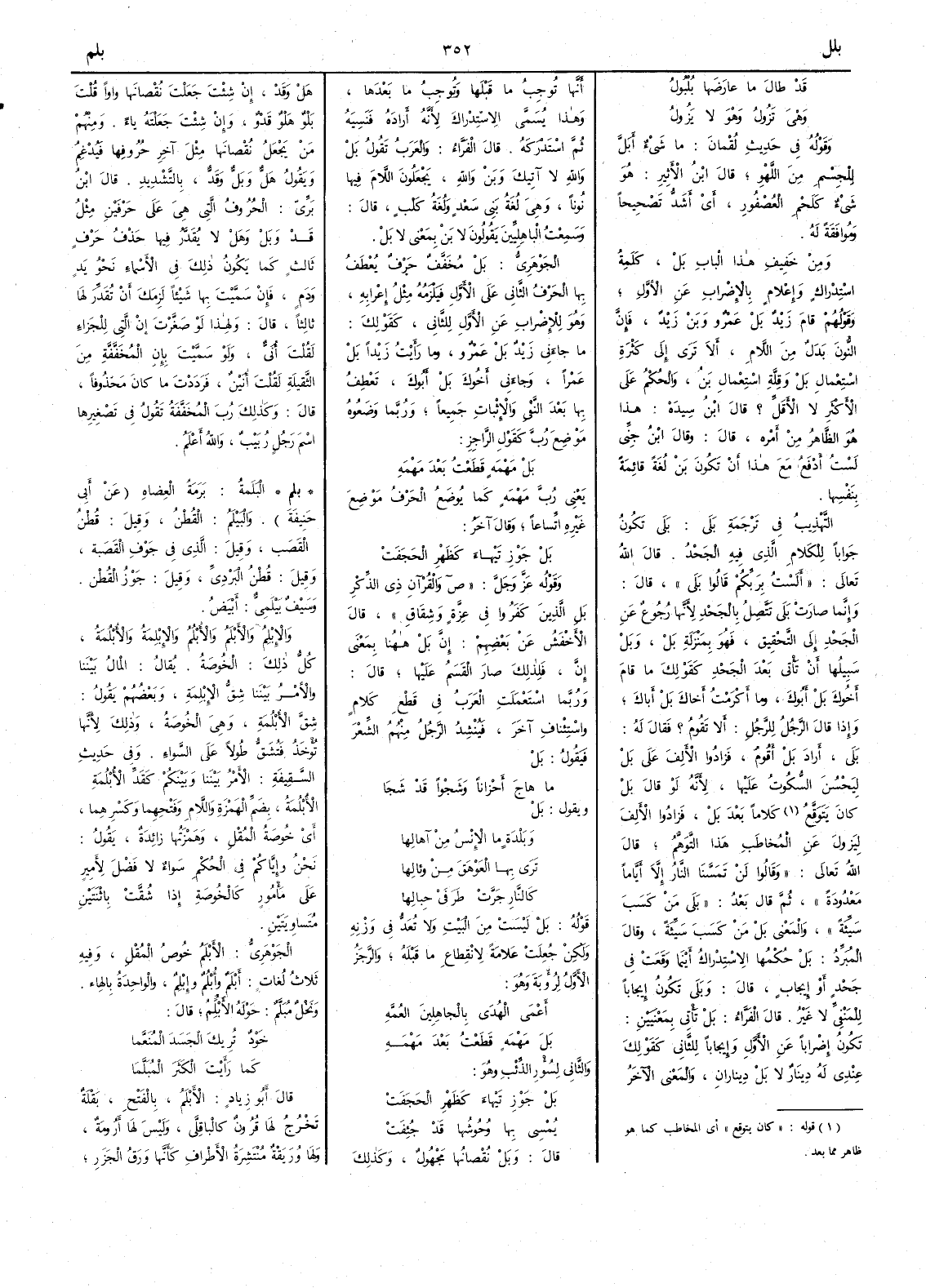 ( * قوله « كان يتوقع » اي المخاطب كما هو ظاهر مما بعد ) كلاماً بعد بلْ فزادوا الأَلف ليزول عن المخاطب هذا التوهم قال الله تعالى وقالوا لن تمسنا النار إِلا أَياماً معدودة ثم قال بَعْدُ بَلى من كسب سيئة والمعنى بَلْ من كسب سيئة وقال المبرد بل حكمها الاستدراك أَينما وقعت في جَحْد أَو إِيجاب قال وبَلى تكون إِيجاباً للمَنْفِيِّ لا غيرُ قال الفراء بَلْ تأْتي بمعنيين تكون إِضراباً عن الأَول وإِيجاباً للثاني كقولك عندي له دينار لا بَلْ ديناران والمعنى الآخر أَنها توجب ما قبلها وتوجب ما بعدها وهذا يسمى الاستدراك لأَنه أَراده فنسيه ثم استدركه قال الفراء والعرب تقول بَلْ والله لا آتيك وبَنْ والله يجعلون اللام فيها نوناً وهي لغة بني سعد ولغة كلب قال وسمعت الباهليين يقولون لا بَنْ بمعنى لا بَلْ الجوهري بَلْ مُخَفَّفٌ حرفٌ يعطف بها الحرف الثاني على الأَول فيلزمه مثْلُ إعرابه فهو للإضراب عن الأَول للثاني كقولك ما جاءَني زيد بَلْ عمرو وما رأَيت زيداً بَلْ عمراً وجاءني أَخوك بَلْ أَبوك تعطف بها بعد النفي والإِثبات جميعاً وربما وضعوه موضع رُبَّ كقول الراجز بَلْ مَهْمَهٍ قَطَعْتُ بَعْدَ مَهْمَهِ يعني رُبَّ مَهْمَهٍ كما يوضع غيره اتساعاً وقال آخر بَلْ جَوْزِ تَيْهاء كظَهْرِ الحَجَفَتْ وقوله عز وجل ص والقرآن ذي الذكر بل الذين كفروا في عِزَّةٍ وشقاق قال الأَخفش عن بعضهم إِن بَلْ ههنا بمعنى إِن فلذلك صار القَسَم عليها قال وربما استعملت العرب في قَطْع كلام واستئناف آخر فيُنْشد الرجل منهم الشعر فيقول بل ما هاجَ أَحْزاناً وشَجْواً قَدْ شَجا ويقول بل وبَلْدَةٍ ما الإِنْسُ من آهالِها تَرى بها العَوْهَقَ من وِئالِها كالنار جَرَّتْ طَرَفي حِبالِها قوله بَلْ ليست من البيت ولا تعدّ في وزنه ولكن جعلت علامة لانقطاع ما قبله والرجز الأَول لرؤبة وهو أَعْمَى الهُدَى بالجاهِلِينَ العُمَّهِ بَلْ مَهْمَهٍ قَطَعْتُ بَعْدَ مَهْمَهِ والثاني لسُؤْرِ الذِّئْبِ وهو بَلْ جَوْزِتَيْهاءَ كَظَهْرِ الحَجَفَتْ يُمْسي بها وُحُوشُها قد جُئِفَتْ قال وبَلْ نُقْصانها مجهول وكذلك هَلْ وَقَدْ إِن شئت جعلت نقصانها واواً قلت بَلْوٌ هَلْوٌ قَدْوٌ وإِن شئت جعلته ياء ومنهم من يجعل نقصانها مثل آخر حروفها فيُدْغم ويقول هَلٌّ وبَلٌّ وقَدٌّ بالتشديد قال ابن بري الحروف التي هي على حرفين مثل قَدْ وبَلْ وهَلْ لا يقدّر فيها حذف حرف ثالث كما يكون ذلك في الأَسماء نحو يَدٍ ودَمٍ فإِن سميت بها شيئاً لزمك أَن تقدر لها ثالثاً قال ولهذا لو صَغَّرْتَ إِن التي للجزاء لقلت أُنَيٌّ ولو سَمَّيت بإِن المخففة من الثقيلة لقلت أُنَيْنٌ فرددت ما كان محذوفاً قال وكذلك رُبَ المخففة تقول في تصغيرها اسمَ رجل رُبَيْبٌ والله أَعلم