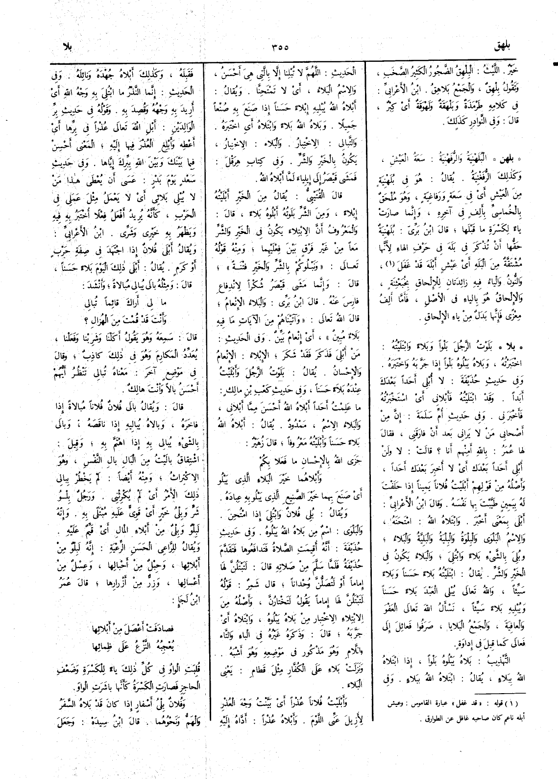 ( بلا ) بَلَوْتُ الرجلَ بَلْواً وبَلاءً وابْتَلَيْته اخْتَبَرْته وبَلاهُ يَبْلُوه بَلْواً إذا جَرَّبَه واخْتَبَره وفي حديث حذيفة لا أُبْلي أَحداً بَعْدَك أَبداً وقد ابْتَلَيْتُه فأَبْلاني أَي اسْتَخْبَرْتُه فأَخْبَرني وفي حديث أُم سلمة إنَّ مِنْ أَصْحابي مَنْ لا يَراني بَعدَ أَن فارَقَني فقال لها عمر بالله أَمِنْهم أَنا ؟ قالت لا ولن أُبْلِيَ أَحداً بعدَكَ أَي لا أُخبِر بعدَك أَحداً وأَصله من قولهم أَبْلَيتُ فُلاناً يميناً إذا حلفتَ له بيمين طَيَّبْتَ بها نفسه وقال ابن الأَعرابي أَبْلى بمعنى أَخْبَر وابْتَلاه الله امْتَحَنَه والاسم البَلْوَى والبِلْوَةُ والبِلْيَةُ والبَلِيَّةُ والبَلاءُ وبُلِيَ بالشيء بَلاءً وابْتُلِيَ والبَلاءُ يكون في الخير والشر يقال ابْتَلَيته بلاءً حسناً وبَلاءً سيِّئاً والله تعالى يُبْلي العبدَ بَلاءً حسناً ويُبْلِيه بلاءً سيِّئاً نسأَل الله تعالى العفو والعافية والجمع البَلايا صَرَفُوا فَعائِلَ إلى فَعالى كما قيل في إداوة التهذيب بَلاه يَبْلُوه بَلْواً إذا ابتَلاه الله ببَلاء يقال ابْتَلاه الله ببَلاء وفي الحديث اللهم لا تُبْلنا إلاّ بالتي هي أَحسن والاسم البَلاء أَي لا تَمْتَحِنَّا ويقال أَبْلاه الله يُبْلِيه إبْلاءً حسناً إذا صنع به صُنْعاً جميلاً وبَلاه اللهُ بَلاء وابْتَلاه أَي اختَبره والتَّبالي الاختبار والبَلاء الاختبار يكون بالخير والشر وفي كتاب هرقل فَمَشى قَيْصر إلى إيلِياء لمَّا أَبْلاهُ الله قال القتيبي يقال من الخير أَبْلَيْته إبْلاء ومن الشر بَلَوْته أَبْلُوه بَلاءً قال والمعروف أَن الابتلاء يكون في الخير والشر معاً من غير فرق بين فعليهما ومنه قوله تعالى ونَبْلُوكم بالشر والخير فتنة قال وإنما مشى قيصر شكراً لاندفاع فارس عنه قال ابن بري والبَلاء الإنعام قال الله تعالى وآتيناهم من الآيات ما فيه بَلاء مبين أَي إنعام بَيِّن وفي الحديث مَنْ أُبْليَ فَذَكَرَ فَقَد شَكَرَ الإبلاء الإنعام والإحسان يقال بَلَوْت الرجلَ وأَبْلَيْت عندَه بَلاء حسناً وفي حديث كعب بن مالك ما عَلِمْتُ أَحداً أَبْلاه الله أَحسنَ مِمَّا أَبْلاني والبَلاءُ الاسم ممدودٌ يقال أَبْلاه اللهُ بَلاءً حسناً وأَبْلَيْته معروفاً قال زهير جَزَى اللهُ بالإحسانِ ما فَعَلا بِكُمْ وأَبْلاهما خيرَ البَلاء الَّذي يَبْلُو أَي صَنَع بهما خيرَ الصَّنِيع الذي يَبْلُو به عباده ويقال بُلِيَ فلانٌ وابْتُلِيَ إذا امْتُحِنَ والبلوَى اسم من بَلاه الله يَبْلُوه وفي حديث حذيفة أَنه أُقِيمَتِ الصلاةُ فَتَدافَعوها فَتَقدَّمَ حذيفة فلما سَلَّم من صلاته قال لتَبْتَلُنَّ لَها إماماً أَو لَتُصَلُّنَّ وُحْداناً قال شمر قوله لتَبْتَلُنَّ لها إماماً يقول لتَخْتارُنَّ وأَصله من الابتلاء الاختبار من بلاه يبلوه وابتلاه أَي جَرَّبه قال وذكره غيره في الباء والتاء واللام وهو مذكور في موضعه وهو أشبه ونزلت بلاءِ على الكفار مثل قَطامِ يعني البلاءَ وأَبْلَيْت فلاناً عُذراً أَي بَيَّنت وجه العذر لأُزيل عني اللوم وأَبْلاه عُذراً أَدَّاه إليه فقبله وكذلك أَبْلاه جُهْدَه ونائِلَه وفي الحديث إنما النذْرُ ما ابْتُلِيَ به وجه الله أَي أُريد به وجههُ وقُصِدَ به وقوله في حديث برّ الوالدين أَبْلِ الله تعالى عُذْراً في بِرِّها أَي أَعْطِه وأَبْلِغ العُذرَ فيها إليه المعنى أَحسن فيما بينك وبين الله ببرك إياها وفي حديث سعد يوم بدر عَسَى أَن يُعْطَى هذا مَن لا يُبْلي بَلائي أَي يعملُ مثلَ عملي في الحرب كأَنه يريد أَفعل فعلاً أُخْتَبَر به فيه ويظهر به خيري وشري ابن الأَعرابي ويقال أَبْلَى فلان إذا اجتهد في صفة حرب أَو كرم يقال أَبْلَى ذلك اليومَ بَلاءً حسناً قال ومثله بالَى يُبالي مُبالاةً وأَنشد ما لي أَراكَ قائماً تُبالي وأَنتَ قد قُمْتَ من الهُزالِ ؟ قال سمعه وهو يقول أَكلْنا وشربْنا وفعَلْنا يُعَدِّد المكارمَ وهو في ذلك كاذب وقال في موضع آخر معناه تبالي تن