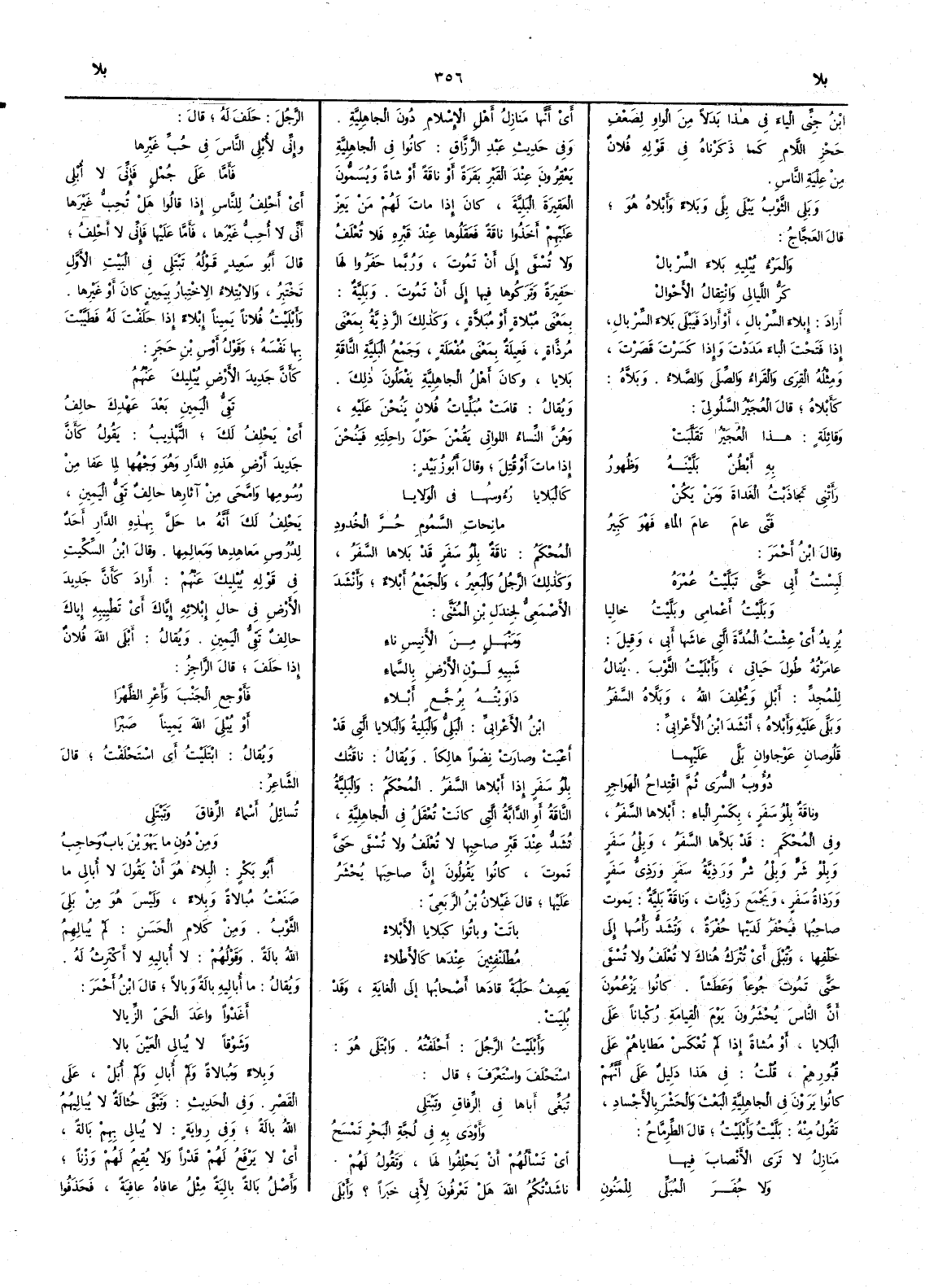 ابن جني الياء في هذا بدلاً من الواو لضعف حجز اللام كما ذكرناه في قوله فلان من عِلْيَةِ الناس وبَلِيَ الثوبُ يَبْلَى بِلًى وبَلاء وأَبْلاه هو قال العجاج والمَرْءُ يُبْلِيهِ بَلاءَ السِّربالْ كرُّ الليالي وانْتِقالُ الأَحوالْ أَراد إبلاء السربال أَو أَراد فيَبْلى بَلاء السِّربال إذا فَتَحتَ الباء مَدَدْتَ وإذا كَسرْتَ قَصَرْتَ ومثله القِرى والقَراءُ والصِّلى والصَّلاءُ وبَلاَّه كأَبْلاهُ قال العُجَير السلولي وقائِلَةٍ هذا العُجَيْرُ تَقَلَّبَتْ به أَبْطُنٌ بَلَّيْنَهُ وظُهور رَأَتْني تجاذَبْتُ الغَداةَ ومَن يَكُنْ فَتًى عامَ عامَ الماء فَهْوَ كَبير وقال ابن أَحمر لَبِسْتُ أَبي حتى تَبَلَّيْتُ عُمْرَه وبَلَّيْتُ أَعْمامِي وبَلَّيْتُ خالِيا يريد أَي عشت المدة التي عاشها أَبي وقيل عامَرتُه طُول حياتي وأَبْلَيْتُ الثَّوبَ يقال للمُجِدِّ أَبْلِ ويُخْلِفُ الله وبَلاَّهُ السَّفَرُ وبَلَّى عليه وأَبْلاه أَنشد ابن الأَعرابي قَلُوصانِ عَوْجاوانِ بَلَّى عَليهِما دُؤوبُ السُّرَى ثم اقْتِداحُ الهَواجِر وناقَةٌ بِلْوُ سفرٍ بكسر الباء أَبلاها السفر وفي المحكم قد بَلاَّها السفر وبِلْيُ سَفَر وبِلْوُ شَرّ وبِلْيُ شرّ ورَذِيَّةُ سَفَرٍ ورَذِيُّ سَفَر ورَذاةُ سَفَرٍ ويجمع رَذِيَّات وناقة بَلِيَّة يموت صاحبها فيحفر لديها حفرة وتشدّ رأْسها إلى خلْفها وتُبْلَى أَي تترك هناك لا تعلف ولا تسقى حتى تموت جوعاً وعطشاً كانوا يزعمون أَن الناس يحشرون يوم القيامة ركباناً على البلايا أَو مُشاة إذا لم تُعْكسَ مَطاياهم على قبورهم قلت في هذا دليل على أَنهم كانوا يرون في الجاهلية البعث والحشر بالأَجساد تقول منه بَلَّيتُ وأَبْلَيْت قال الطرماح مَنازِل لا تَرَى الأَنْصابَ فيها ولا حُفَرَ المُبَلّي لِلمَنون أَي أَنها منازل أَهل الإسلام دون الجاهلية وفي حديث عبد الرزاق كانوا في الجاهلية يَعْقِرُون عندَ القبر بَقَرة أَو ناقة أَو شاةً ويُسمُّون العَقِيرَة البَلِيَّة كان إذا مات لهم من يَعِزّ عليهم أَخذوا ناقة فعقلوها عند قبره فلا تعلف ولا تسقى إلى أَن تموت وربما حفروا لها حفيرة وتركوها فيها إلى أَن تموت وبَلِيَّة بمعنى مُبْلاةٍ أَو مُبَلاَّة وكذلك الرَّذِيَّة بمعنى مُرَذَّاة فعِيلة بمعنى مُفْعَلة وجمعُ البَلِيَّةِ الناقةِ بَلايا وكان أَهل الجاهلية يفعلون ذلك ويقال قامت مُبَلِّيات فلان يَنُحْنَ عليه وهن النساء اللواتي يقمن حول راحلته فيَنُحْنَ إذا مات أَو قُتل وقال أَبو زُبيد كالبَلايا رُؤُوسُها في الوَلايا مانِحاتِ السَّمومِ حُرَّ الخُدود المحكم ناقة بِلْوُ سفر قد بلاها السفر وكذلك الرجل والبعير والجمع أَبلاءٌ وأَنشد الأَصمعي لجَندَل بن المثنى ومَنْهَلٍ من الأَنيس ناء شَبيهِ لَوْنِ الأَرْضِ بالسَّماءِ داوَيْتُه بِرُجَّعٍ أَبْلاءِ ابن الأَعرابي البَلِيُّ والبَلِيَّةُ والبَلايا التي قد أَعْيت وصارت نِضْواً هالكاً ويقال فاقتك بِلْوُ سفر إذا أَبلاها السفر المحكم والبَلِيَّة الناقة أَو الدابة التي كانت تُعْقَلُ في الجاهلية تُشدّ عند قبر صاحبها لا تعلف ولا تسقى حتى تموت كانوا يقولون إن صاحبها يحشر عليها قال غَيْلان بن الرَّبعِي باتَتْ وباتُوا كَبَلايا الأَبْلاءُ مُطْلَنْفِئِينَ عِندَها كالأَطْلاءْ يصف حَلْبة قادها أَصحابها إلى الغاية وقد بُلِيت وأَبْلَيْت الرجلَ أَحلفته وابْتَلَى هو استَحْلف واستَعْرَف قال تُبَغّي أَباها في الرِّفاقِ وتَبْتَلي وأَوْدَى به في لُجَّةِ البَحرِ تمسَحُ أَي تسأَلهم أَن يحلفوا لها وتقول لهم ناشدتكم الله هل تعرفون لأَبي خبراً ؟ وأَبْلى الرجلَ حَلَف له قال وإني لأُبْلي الناسَ في حُبّ غَيْرها فأَمَّا على جُمْلٍ فإنَي لا أُبْلي أَي أَحلف للناس إذا قالوا هل تحب غيرها أَني لا أُحب غيرها فأَما عليها فإني لا أَحلف قال أَبو سعيد قوله تبتلي في البيت الأَول تختبر والابتلاء الاختبار بيمين كان أَو غيرها وأَبلَيْت فلاناً يميناً 