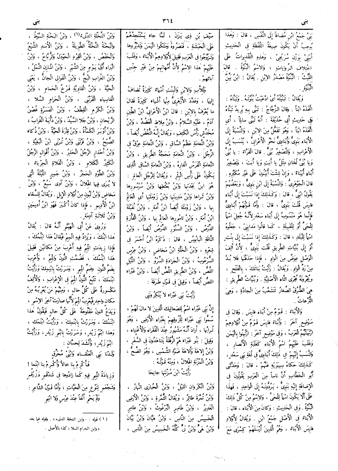 ( * قوله وهذه التقديرات على اختلاف الروايات يشعر ان في الكلام سقطاً ) والاسم البُنُوَّةُ قال الليث البُنُوَّةُ مصدر الابن يقال ابنٌ بَيّنُ البُنُوَّة ويقال تَبَنيْتُه أَي ادَّعيت بُنُوَّتَه وتَبَنَّاه اتخذه ابناً وقال الزجاج تَبَنَّى به يريد تَبَنَّاه وفي حديث أَبي حذيفة أَنه تَبَنَّى سالماً أَي اتخذه ابناً وهو تَفَعُّلٌ من الابْن والنسبة إلى الأَبناء بَنَوِيٌّ وأَبناوِيٌّ نحو الأَعرابيِّ ينسب إلى الأَعراب والتصغير بُنَيٌّ قال الفراء يا بُنيِّ ويا بُنَيَّ لغتان مثل يا أَبتِ ويا أبَتَ وتصغير أَبْناء أُبَيْناء وإن شئت أُبَيْنونَ على غير مكبره قال الجوهري والنسبة إلى ابْنٍ بَنَوِيّ وبعضهم يقول ابْنِيّ قال وكذلك إذا نسبت إلى أَبْناء فارس قلت بَنَوِيّ قال وأَما قولهم أَبْناوِيّ فإنما هو منسوب إلى أَبناء سعد لأَنه جعل اسماً للحي أَو للقبيلة كما قالوا مَدايِنِيٌّ جعلوه اسماً للبلد قال وكذلك إذا نسبت إلى بِنْت أَو إلى بُنَيّاتِ الطَّريق قلت بَنَوِيّ لأَن أَلف الوصل عوض من الواو فإذا حذفتها فلا بد من رد الواو ويقال رأَيت بَناتَك بالفتح ويُجرونه مُجْرَى التاء الأَصلية وبُنَيَّاتُ الطريق هي الطُّرُق الصغار تتشعب من الجادَّة وهي التُّرَّهاتُ والأَبناء قوم من أَبناء فارس وقال في موضع آخر وأَبناء فارس قوم من أَولادهم ارتهنتهم العرب وفي موضع آخر ارْتُهِنُوا باليمن وغلب عليهم اسم الأَبناء كغلبة الأَنصار والنسب إليهم على ذلك أَبْناوِيٌّ في لغة بني سعد كذلك حكاه سيبويه عنهم قال وحدثني أَبو الخطاب أَن ناساً من العرب يقولون في الإضافة إليه بَنَوِيٌّ يَرُدّونه إلى الواحد فهذا على أَن لا يكون اسماً للحي والاسم من كل ذلك البُنُوَّةُ وفي الحديث وكان من الأَبْناء قال الأَبْناء في الأَصل جمع ابْنٍ ويقال لأَولاد فارس الأَبْناء وهم الذين أَرسلهم كِسرى مع سَيْفِ بنِ ذيِ يَزَنَ لما جاء يستنجدهم على الحَبَشة فنصروه وملكوا اليمن وتَدَيَّرُوها وتزوّجوا في العرب فقيل لأَولادهم الأَبناء وغلب عليهم هذا الاسم لأَن أُمهاتهم من غير جنس آبائهم وللأَب والابن والبنت أَسماء كثيرة تضاف إليها وعَدَّدَ الأَزهري منها أَشياء كثيرة فقال ما يعرف بالابن قال ابن الأَعرابي ابْنُ الطِّينِ آدمُ عليه السلام وابن مِلاطٍ العَضُدُ وابْنُ مُخدِّشٍ رأْسُ الكَتِفِ ويقال إنه النُّغْضُ أَيضاً وابن النَّعامة عظم الساقِ وابن النَّعامة عِرْق في الرِّجْل وابنُ النَّعامة مَحَجَّة الطريق وابن النَّعامة الفرَس الفاره وابن النَّعامة الساقي الذي يكون على رأْس البئر ويقال للرجل العالم هو ابنُ بَجْدَتِها وابن بُعْثُطِها وابن سُرْسُورها وابنُ ثَراها وابن مَدينتها وابن زَوْمَلَتِها أَي العالم بها وابن زَوْمَلَة أَيضاً ابن أَمة وابن نُفَيْلَة ابن أَمة وابن تامُورها العالم بها وابنُ الفأْرة الدَّرْصُ وابن السِّنَّورِ الدِّرْصُ أَيضاً وابن الناقةِ البابُوس قال ذكره ابن أحمر في شعره وابن الخَلَّة ابن مَخاضٍ وابن عِرْسٍ السُّرْعُوبُ وابنُ الجَرادةِ السِّرْو وابن اللَّيلِ اللِّصُّ وابن الطريق اللِّصُّ أيضاً وابن غَبْراء اللص أَيضاً وقيل في قول طرفة رأَيْتُ بني غَبْراءَ لا يُنْكرُونَني إن بني غَبْراء اسم للصَّعاليك الذين لا مال لهم سُمُّوا بني غَبْراء للزُوقهم بغَبْراء الأَرض وهو ترابها أَراد أَنه مشهور عند الفقراء والأَغنياء وقيل بنو غبراء هم الرُّفْقَةُ يَتَناهَدُون في السفر وابن إلاهَةَ وأَلاهَةَ ضَوْءُ الشمس وهو الضِّحُّ وابن المُزْنةِ الهلالُ ومنه قوله رأَيتُ ابنَ مُزْنَتِها جانِحَا وابن الكَرَوانِ الليلُ وابن الحُبارَى النهارُ وابن تُمَّرةَ طائر ويقال التُّمَّرةِ وابنُ الأَرضِ الغَديرُ وابن طامِرٍ البُرْغُوث وابنُ طامِرٍ الخَسِيسُ من الناس وابن هَيَّانَ وابن بَيَّانَ وابن هَيٍّ وابن بَيٍّ كُلُّه الخَسِيسُ من الناس وابن النخلة الدَّنيء