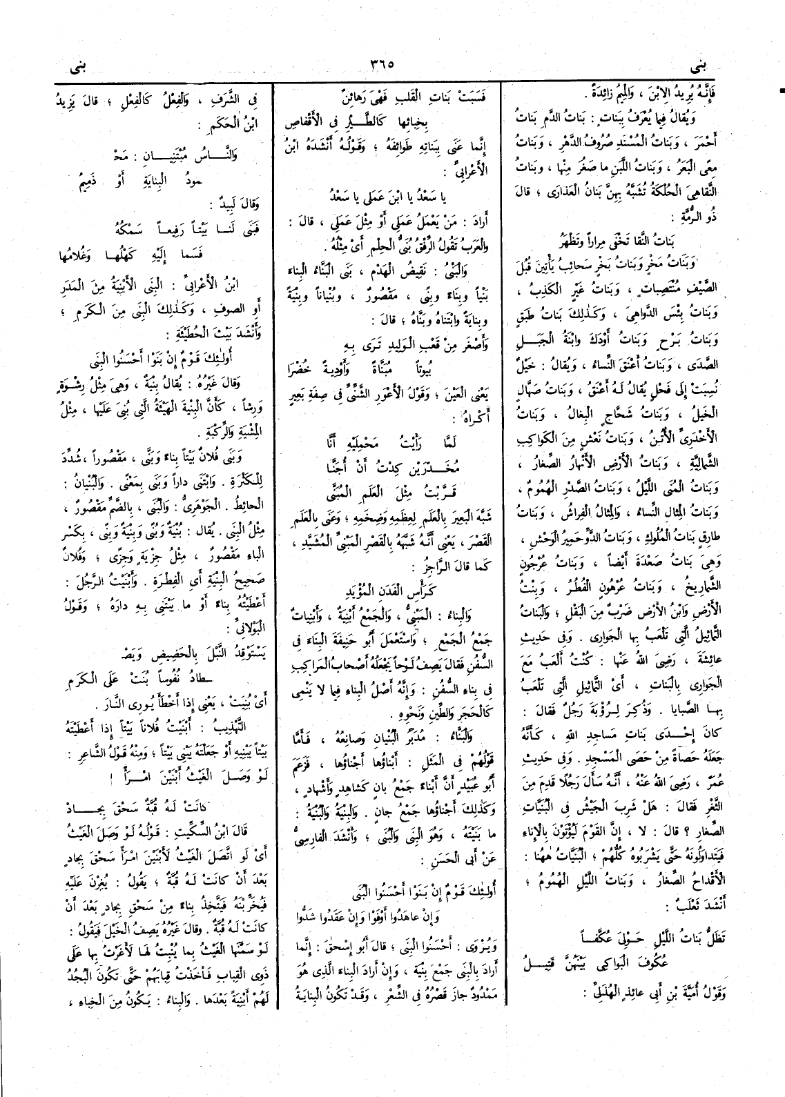 فإنه يريد الابن والميم زائدة ويقال فيما يعرف ببنات بناتُ الدَّمِ بنات أَحْمَرَ وبناتُ المُسْنَدِ صُروفُ الدَّهْر وبناتُ معًى البَعَرُ وبناتُ اللَّبَن ما صَغرَ منها وبناتُ النَّقا هي الحُلْكة تُشبَّهُ بِهنَّ بَنانُ العَذارَى قال ذو الرمة بناتُ النَّقا تَخْفَى مِراراً وتَظْهَرُ وبنات مَخْرٍ وبناتُ بَخْرٍ سحائبُ يأْتين قُبُلَ الصَّيْفِ مُنْتَصباتٍ وبناتُ غَيرٍ الكَذِبُ وبناتُ بِئْسَ الدواهي وكذلك بناتُ طَبَقٍ وبناتُ بَرْحٍ وبناتُ أَوْدَكَ وابْنةُ الجَبَل الصَّدَى وبناتُ أَعْنَقَ النساءُ ويقال خيل نسبت إلى فَحل يقال له أَعنَقُ وبناتُ صَهَّالٍ الخَيلُ وبنات شَحَّاجٍ البِغالُ وبناتُ الأَخْدَرِيّ الأُتُنُ وبناتُ نَعْش من الكواكب الشَّمالِيَّة وبناتُ الأَرض الأَنهارُ الصِّغارُ وبناتُ المُنى اللَّيْلُ وبناتُ الصَّدْر الهُموم وبناتُ المِثالِ النِّساء والمِثالُ الفِراش وبناتُ طارِقٍ بناتُ المُلوك وبنات الدَّوِّ حمير الوَحْشِ وهي بناتُ صَعْدَة أَيضاً وبناتُ عُرْجُونٍ الشَّماريخُ وبناتُ عُرْهُونٍ الفُطُرُ وبنتُ الأَرضِ وابنُ الأَرضِ ضَرْبٌ من البَقْلِ والبناتُ التَّماثيلُ التي تلعب بها الجَواري وفي حديث عائشة رضي الله عنها كنت أَلعب مع الجواري بالبَناتِ أَي التماثيل التي تَلْعَبُ بها الصبايا وذُكِرَ لرؤبة رجلٌ فقال كان إحدَى بَناتِ مَساجد الله كأَنه جعله حَصاةً من حَصَى المسجد وفي حديث عمر رضي الله عنه أَنه سأَل رجلاً قَدِمَ من الثَّغْر فقال هل شَرِبَ الجيشُ في البُنَيَّاتِ الصِّغار ؟ قال لا إن القوم لَيُؤْتَوْنَ بالإناء فيَتَداولوه حتى يشربوه كلُّهم البُنَيَّاتُ ههنا الأَقْداح الصِّغار وبناتُ الليلِ الهُمومُ أَنشد ثعلب تَظَلُّ بَناتُ الليلِ حَوْليَ عُكَّفاً عُكُوفَ البَواكي بينَهُنَّ قَتِيلُ وقول أُمَيَّة بن أَبي عائذ الهُذَليّ فسَبَتْ بَناتِ القَلْبِ فهي رَهائِنٌ بِخِبائِها كالطَّيْر في الأَقْفاصِ إنما عنى ببناته طوائفه وقوله أَنشده ابن الأَعرابي يا سَعْدُ يا ابنَ عمَلي يا سَعْدُ أَراد من يَعْملُ عَمَلي أَو مِثْلَ عمَلي قال والعرب تقول الرِّفْقُ بُنَيُّ الحِلْمِ أَي مثله والبَنْيُ نَقيضُ الهَدْم بَنى البَنَّاءُ البِناءَ بَنْياً وبِنَاءً وبِنًى مقصور وبُنياناً وبِنْيَةً وبِنايةً وابتَناه وبَنَّاه قال وأَصْغَر من قَعْبِ الوَليدِ تَرَى به بُيوتاً مُبَنَّاةً وأَودِيةً خُضْرا يعني العين وقول الأَعْوَرِ الشَّنِّيِّ في صفة بعير أَكراه لما رَأَيْتُ مَحْمِلَيْهِ أَنَّا مُخَدَّرَيْنِ كِدْتُ أَن أُجَنَّا قَرَّبْتُ مِثْلَ العَلَمِ المُبَنَّى شبه البعير بالعَلَمِ لعِظَمِه وضِخَمِه وعَنى بالعَلَمِ القَصْرَ يعني أَنه شبهه بالقصر المَبْنيّ المُشيَّدِ كما قال الراجز كَرأْسِ الفَدَنِ المُؤْيَدِ والبِناءُ المَبْنيُّ والجمع أَبْنِيةٌ وأَبْنِياتٌ جمعُ الجمع واستعمل أَبو حنيفة البِنَاءَ في السُّفُنِ فقال يصف لوحاً يجعله أَصحاب المراكب في بناء السُّفُن وإنه أَصلُ البِناء فيما لا ينمي كالحجر والطين ونحوه والبَنَّاءُ مُدَبِّرُ البُنْيان وصانعه فأَما قولهم في المثل أَبناؤُها أَجْناؤُها فزعم أَبو عبيد أَن أَبْناءً جمع بانٍ كشاهدٍ وأَشهاد وكذلك أَجْناؤُها جمع جانٍ والبِنْيَةُ والبُنْيَةُ ما بَنَيْتَهُ وهو البِنَى والبُنَى وأَنشد الفارسي عن أَبي الحسن أُولئك قومٌ إن بَنَوْا أَحْسَنُوا البُنى وإن عاهَدُوا أَوْفَوْا وإن عَقَدُوا شَدُّوا ويروى أَحْسَنُوا البِنَى قال أَبو إسحق إنما أَراد بالبِنى جمع بِنْيَةٍ وإن أَراد البِناءَ الذي هو ممدود جاز قصره في الشعر وقد تكون البِنايةُ في الشَّرَف والفعل كالفعل قال يَزيدُ بن الحَكَم والناسُ مُبْتَنيانِ مَحْ مودُ البِنايَةِ أَو ذَمِيمُ وقال لبيد فبَنى لنا بَيْتاً رفيعاً سَمْكُه فَسَما إليه كَهْلُها وغُلامُها ابن الأَعرابي البِنى الأَبْنِيةُ من المَدَر أَو الصوف وكذلك البِنى من ا