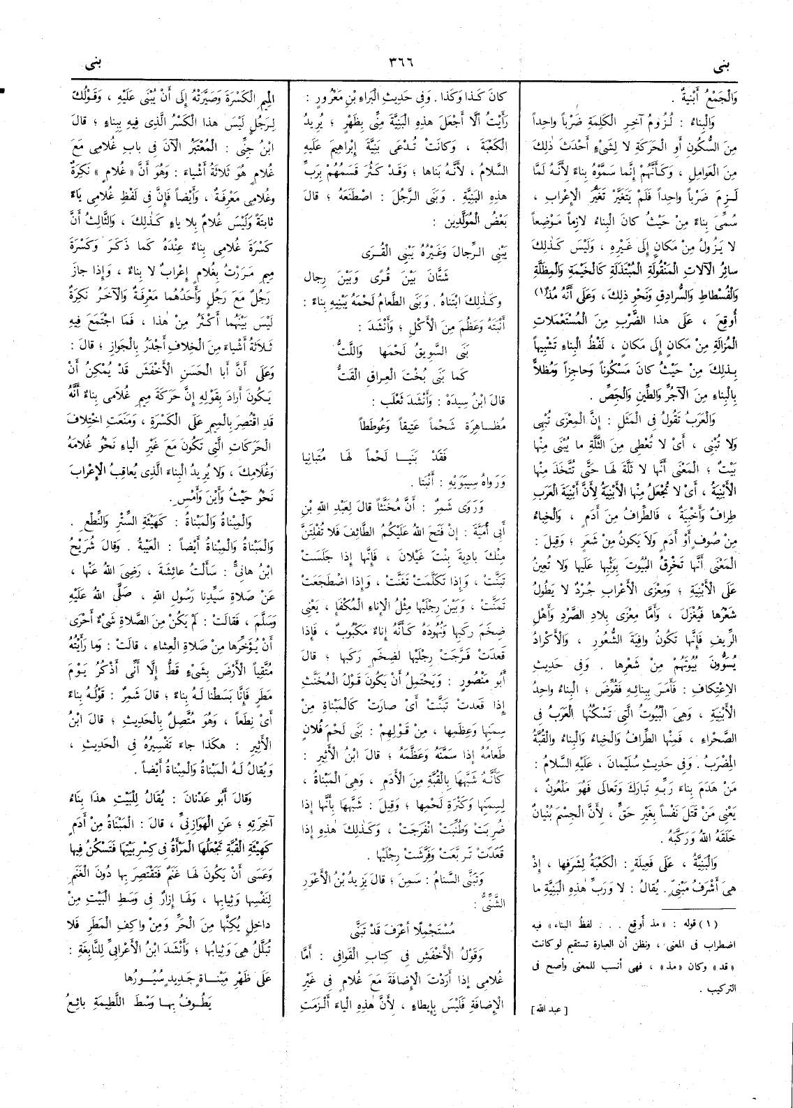 والجمع أَبْنيةٌ والبِناءُ لزوم آخر الكلمة ضرباً واحداً من السكون أَو الحركة لا لشيء أَحدث ذلك من العوامل وكأَنهم إنما سموه بناء لأَنه لما لزم ضرباً واحداً فلم يتغير تغير الإعراب سمي بناء من حيث كان البناء لازماً موضعاً لا يزول من مكان إلى غيره وليس كذلك سائر الآلات المنقولة المبتذلة كالخَيْمة والمِظَلَّة والفُسْطاطِ والسُّرادِقِ ونحو ذلك وعلى أَنه مذ أَوقِع على هذا الضرب من المستعملات المُزالة من مكان إلى مكان لفظُ البناء تشبيهاً بذلك من حيث كان مسكوناً وحاجزاً ومظلاًّ بالبناء من الآجر والطين والجص والعرب تقول في المَثَل إنَّ المِعْزى تُبْهي ولا تُبْنى أَي لا تُعْطِي من الثَّلَّة ما يُبْنى منها بَيْتٌ المعنى أَنها لا ثَلَّة لها حتى تُتَّخذ منها الأَبنيةُ أَي لا تجعل منها الأَبنية لأَن أَبينة العرب طِرافٌ وأَخْبيَةٌ فالطِّرافُ من أَدَم والخِباءُ من صوف أَو أَدَمٍ ولا يكون من شَعَر وقيل المعنى أَنها تَخْرِق البيوت بوَثْبِها عليها ولا تُعينُ على الأَبنيةِ ومِعزَى الأَعراب جُرْدٌ لا يطُول شعرها فيُغْزَلَ وأَما مِعْزَى بلاد الصَّرْدِ وأَهل الريف فإنها تكون وافية الشُّعور والأَكْرادُ يُسَوُّون بيوتَهم من شعرها وفي حديث الاعتكاف فأَمَر ببنائه فقُوِّضَ البناءُ واحد الأَبنية وهي البيوت التي تسكنها العرب في الصحراء فمنها الطِّراف والخِباء والبناءُ والقُبَّة المِضْرَبُ وفي حديث سليمان عليه السلام من هَدَمَ بِناءَ ربِّه تبارك وتعالى فهو ملعون يعني من قتل نفساً بغير حق لأَن الجسم بُنْيانٌ خلقه الله وركَّبه والبَنِيَّةُ على فَعِيلة الكعْبة لشرفها إذ هي أَشرف مبْنِيٍّ يقال لا وربِّ هذه البَنِيَّة ما كان كذا وكذا وفي حديث البراء بن مَعْرورٍ رأَيتُ أَن لا أَجْعَلَ هذه البَنِيَّة مني بظَهْرٍ يريد الكعبة وكانت تُدْعَى بَنيَّةَ إبراهيم عليه السلام لأَنه بناها وقد كثر قَسَمُهم برب هذه البَنِيَّة وبَنَى الرجلَ اصْطَنَعَه قال بعض المُوَلَّدين يَبْني الرجالَ وغيرهُ يَبْني القُرَى شَتَّانَ بين قُرًى وبينَ رِجالِ وكذلك ابْتناه وبَنَى الطعامُ لَحْمَه يَبنِيه بِناءً أَنْبَتَه وعَظُمَ من الأَكل وأَنشد بَنَى السَّوِيقُ لَحْمَها واللَّتُّ كما بَنَى بُخْتَ العِراقِ القَتُّ قال ابن سيده وأَنشد ثعلب مُظاهِرة شَحْماً عَتِيقاً وعُوطَطاً فقد بَنَيا لحماً لها مُتبانِيا ورواه سيبويه أَنْبَتا وروى شَمِر أَن مُخَنثاً قال لعبد الله بن أَبي أَميَّةَ إن فتح الله عليكم الطائفَ فلا تُفْلِتَنَّ منك باديةُ بنتُ غَيْلانَ فإنها إذا جلستْ تَبَنَّتْ وإذا تكلمت تَغَنَّتْ وإذا اضطجعت تَمنَّتْ وبَيْنَ رجلَيها مثلُ الإناء المُكْفَإ يعني ضِخَم رَكَبِها ونُهُودَه كأَنه إناء مكبوب فإذا قعدت فرّجت رجليها لضِخَم رَكَبها قال أَبو منصور ويحتمل أَن يكون قول المخنث إذا قعدت تَبَنَّتْ أَي صارت كالمَبْناةِ من سمنها وعظمها من قولهم بَنَى لَحْمَ فلان طعامُه إذا سمَّنه وعَظَّمه قال ابن الأَثير كأَنه شبهها بالقُبَّة من الأدَم وهي المَبْناة لسمنها وكثرة لحمها وقيل شبهها بأَنها إذا ضُرِبَتْ وطُنِّبَت انْفَرَجَتْ وكذلك هذه إذا قعدت تربعت وفرشت رجليها وتَبَنَّى السَّنامُ سَمِنَ قال يزيد بن الأَعْوَر الشَّنِّيُّ مُسْتَجمِلاً أَعْرَفَ قد تَبَنَّى وقول الأَخفش في كتاب القوافي أَما غُلامي إذا أَردتَ الإضافة مع غلامٍ في غير الإضافة فليس بإيطاء لأَن هذه الياء أَلزمت الميم الكسرة وصيرته إلى أَن يُبْنَى عليه وقولُك لرجل ليس هذا الكسر الذي فيه ببناء قال ابن جني المعتبر الآن في باب غلامي مع غلام هو ثلاثة أَشياء وهو أَن غلام نكرة وغلامي معرفة وأَيضاً فإن في لفظ غلامي ياء ثابتة وليس غلام بلا ياء كذلك والثالث أَن كسرة غلامي بناء عنده كما ذكر وكسرة ميم مررت بغلام إعراب لا بناء وإذا جاز رجل مع رجل وأَحدهما معرفة والآخر نكرة ليس بينهما أَكثر من هذا فما اجتمع فيه ثلاثة أَشياء من الخلاف أَجْدَرُ بال
