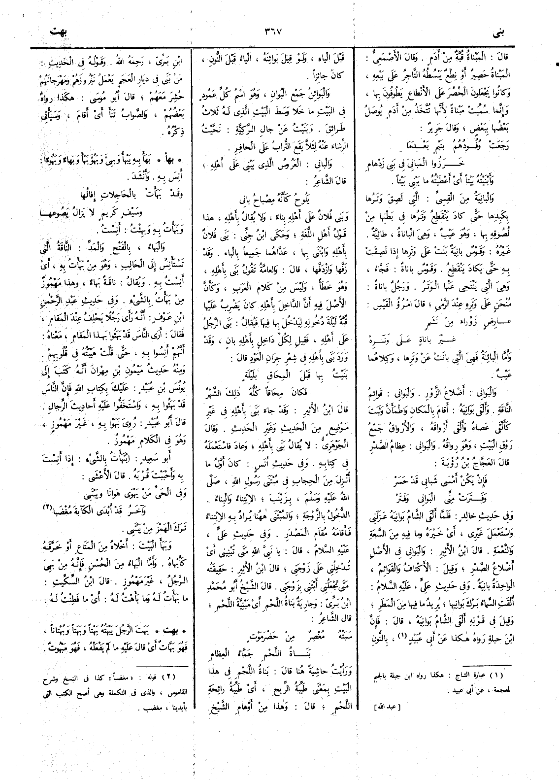 ( * قوله « ابن حبلة » هو هكذا في الأصل ) رواه هكذا عن أَبي عبيد بالنون قبل الياء ولو قيل بَوائنه الياء قبل النون كان جائزاً والبَوائِنُ جمع البُوانِ وهو اسم كل عمود في البيت ما خَلا وَسَط البيت الذي له ثلاث طَرائق وبَنَيتُ عن حالِ الرّكِيَّة نَحَّيْتُ الرِّشاء عنه لئلا يقع الترابُ على الحافر والباني العَرُوس الذي يَبْني على أَهله قال الشاعر يَلُوحُ كأَنه مِصْباحُ باني وبَنَى فلانٌ على أَهله بِناءً ولا يقال بأَهله هذا قول أَهل اللغة وحكى ابن جني بَنى فلان بأَهله وابْتَنَى بها عَدَّاهما جميعاً بالباء وقد زَفَّها وازْدَفَّها قال والعامة تقول بَنَى بأَهله وهو خطأٌ وليس من كلام العرب وكأَنَّ الأَصلَ فيه أَن الداخل بأَهله كان يضرب عليها قبة ليلة دخوله ليدخل بها فيها فيقال بَنَى الرجلُ على أَهله فقيل لكل داخل بأَهله بانٍ وقد ورد بَنَى بأَهله في شعر جِرَانِ العَوْدِ قال بَنَيْتُ بها قَبْلَ المِحَاقِ بليلةٍ فكانَ مِحَاقاً كُلُّه ذلك الشَّهْرُ قال ابن الأَثير وقد جاءَ بَنى بأَهله في غير موضع من الحديث وغير الحديث وقال الجوهري لا يقال بني بأَهله وعادَ فاستعمله في كتابه وفي حديث أَنس كان أَوَّلُ ما أُنْزِلَ من الحجاب في مُبْتَنى رسول الله صلى الله عليه وسلم بزينب الابْتِناءُ والبِناء الدخولُ بالزَّوْجةِ والمُبْتَنَى ههنا يُراد به الابْتِناءُ فأَقامه مُقَام المصدر وفي حديث عليّ عليه السلام قال يا نبيّ الله مَتَى تُبْنِيني أَي تُدْخِلُني على زوجتي قال ابن الأَثير حقيقته متى تجعلني أَبْتَني بزوجتي قال الشيخ أَبو محمد بن بري وجاريةٌ بَناةُ اللَّحْمِ أَي مَبْنِيَّةُ اللحم قال الشاعر سَبَتْه مُعْصِرٌ من حَضْرَمَوْتٍ بَنَاةُ اللحمِ جَمَّاءُ العِظامِ ورأَيت حاشية هنا قال بَناةُ اللحم في هذا البيت بمعنى طَيِّبةُ الريح أَي طيبة رائحة اللحم قال وهذا من أَوهام الشيخ ابن بري رحمه الله وقوله في الحديث من بَنَى في دِيارِ العَجَمِ يَعْمَلُ نَيْرُوزَهُمْ ومَهْرَجانَهم حُشِرَ معهم قال أَبو موسى هكذا رواه بعضهم والصواب تَنَأ أَي أَقام وسيأْتي ذكره