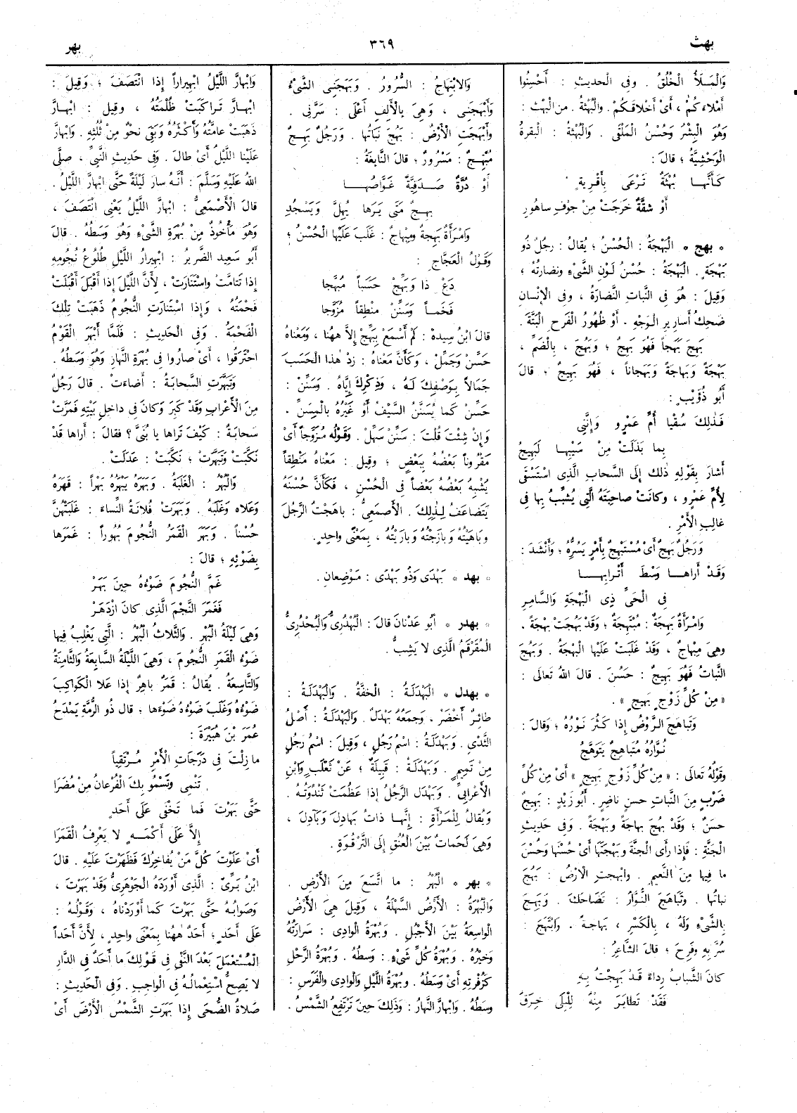 ( بهج ) البَهْجَةُ الحُسْنُ يقال رجل ذو بَهْجَةٍ البَهْجَةُ حُسْنُ لون الشيء ونَضَارَتُه وقيل هو في النبات النَّضارَةُ وفي الإِنسان ضَحِكُ أَسارير الوجه أَو ظهورُ الفَرَحِ البتة بَهِجَ بَهَجاً فهو بَهِجٌ وبَهُجَ بالضم بَهْجَةً وبَهاجَةً وبَهَجاناً فهو بَهِيجٌ قال أَبو ذؤَيب فذَلك سُقْيا أُمِّ عَمْرٍو وإِنَّني بما بَذَلَتْ من سَيْبها لبَهِيجُ أَشار بقوله ذلك إِلى السحاب الذي استسقى لأُم عمرو وكانت صاحبته التي يشبب بها في غالب الأَمر ورجلٌ بَهِجٌ أَي مُسْتَبْهِجٌ بأمرٍ يَسُّرُّه وأَنشد وقد أَراها وَسْطَ أَتْرابِها في الحَيِّ ذي البَهْجَةِ والسَّامِرِ وامرأَةٌ بَهِجَةٌ مبتهجةٌ وقد بَهُجَتْ بَهْجَةً وهي مِبْهاجٌ وقد غَلَبَتْ عليها البهجةُ وبَهُجَ النباتُ فهو بَهيجٌ حَسُنَ قال الله تعالى من كُلِّ زَوْجٍ بهيج وتباهَجَ الرَّوْضُ إِذا كَثُرَ نَوْرُه وقال نُوَّارُهُ مُتَباهجٌ يَتَوَهَّجُ وقوله من كل زوج بَهِيج أَي من كل ضَرْب من النبات حَسَنٍ ناضر أَبو زيد بَهيج حسنٌ وقج بَهُجَ بَهاجةً وبَهْجَةً وفي حديث الجنة فإِذا رأَى الجنةَ وبَهْجَتَها أَي حُسْنَها وحُسْنَ ما فيها من النعيم وأَبهجتِ الأَرضُ بَهُجَ نباتُها وتباهَجَ النُّوَّارُ تضاحك وبهِج بالشيء وله بالكسر بَهاجةً وابتَهَج سُرَّ به وفَرح قال الشاعر كانَ الشبابُ رِداءً قد بَهِجْتُ به فقد تطايَرَ منه لِلبِلَى خِرَقُ والابتهاجُ السُّرور وبَهَجَني الشيءُ وأَبْهَجَني وهي بالأَلف أَعلى سَرَّني وأَبْهَجَت الأَرضُ بَهُجَ نباتُها ورجلٌ بَهِجٌ مُبتهج مسرورٌ قال النابغة أَو دُرَّةٌ صَدَفِيَّةٌ غَوَّاصُها بَهِجٌ متى يَرَها يُهِلَّ ويَسْجُدِ وامرأَةٌ بهِجةٌ ومِبْهاجٌ غلب عليها الحُسْنُ وقول العجاج دَعْ ذا وبَهِّجْ حَسَباً مُبَهَّجا فَخْماً وسَنِّنْ مَنْطِقاً مُزَوَّجا قال ابن سيده لم أَسمع ببَهْجْ إِلاَّ ههنا ومعناه حَسِّنْ وجَمِّلْ وكأَنَّ معناه زِدْ هذا الحَسَبَ جمالاً بوصفك له وذكرك إِياه وسَنِّنْ حَسِّنْ كما يُسَنَّنُ السيفُ أَو غيرُه بالمِسَنِّ وإِن شئت قلت سَنِّنْ سَهِّلْ وقوله مُزَوِّجاً أَي مقروناً بعضُه ببعض وقيل معناه مَنْطِقاً يُشْبه بعضُه بعضاً في الحُسْنِ فكأَنَّ حُسْنَهُ يتضاعف لذلك الأَصمعي باهَجْتُ الرجلَ وباهيته وبازَجْتُه وبارَيْتُه بمعنى واحد