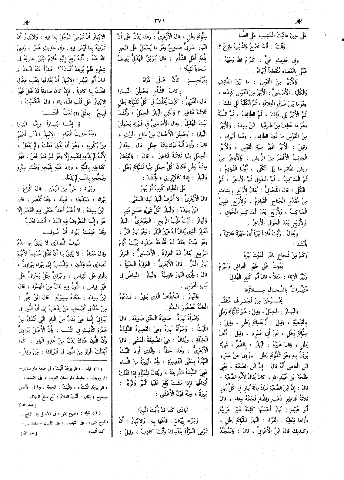 على حِينَ عاتبتُ المَشيبَ عَلى الصِّبا وقلتُ أَلمَّا تَصْحُ والشَّيْبُ وازِعُ ؟ وفي حديث علي كرم الله وجهه فيُلْقى بالفضاء منقطعاً أَبْهَراهُ والأَبْهَرُ من القوس ما بين الطائف والكُلْية الأَصمعي الأَبهر من القوس كبدها وهو ما بين طرفي العِلاقَةِ ثم الكلية تلي ذلك ثم الأَبهر يلي ذلك ثم الطائف ثم السِّيَةُ وهو ما عطف من طرفيها ابن سيده والأَبهر من القوس ما دون الطائف وهما أَبهِران وقيل الأَبهر ظهر سية القوس والأَبهر الجانب الأَقصر من الريش والأَباهر من ريش الطائر ما يلي الكُلَى أَوّلها القَوادِمُ ثم المَنَاكِبُ ثم الخَوافي ثم الأَباهِرُ ثم الكلى قال اللحياني يقال لأَربع ريشات من مقدّم الجناح القوادم ولأَربع تليهن المناكب ولأَربع بعد المناكب الخوافي ولأَربع بعد الخوافي الأَباهر ويقال رأَيت فلاناً بَهْرَةً أَي جَهْرَةً علانية وأَنشد وكَمْ مِنْ شُجاع بادَرَ المَوْتَ بَهْرَةً يَمُوتُ على ظَهْرِ الفِراشِ ويَهْرَمُ وتَبَهَّر الإِناءُ امْتَلأَ قال أَبو كبير الهذلي مُتَبَهّراتٌ بالسِّجالِ مِلاؤُها يَخْرُجْنَ مِنْ لَجَفٍ لهَا مُتَلَقَّمِ والبُهار الحِمْلُ وقيل هو ثلثماه رطل بالقبطية وقيل أَربعمائة رطل وقيل ستمائة رطل عن أَبي عمرو وقيل أَلف رطل وقال غيره البهار بالضم شيء يوزن به وهو ثلثمائة رطل وروي عن عمرو بن العاص أَنه قال إِنّ ابن الصَّعْبَةِ يعني طلحة ابن عبيد الله كان يقال لأُمه الصعبة قال إِنّ ابن الصعبة ترك مائة بُهار في كل بُهار ثلاثة قناطير ذهب وفضة فجعله وعاء قال أَبو عبيد بُهار أَحسبها كلمة غير عربية وأُراها قبطية الفرّاء البُهارُ ثلثمائة رطل وكذلك قال ابن الأَعرابي قال والمُجَلَّدُ ستمائة رطل قال الأَزهري وهذا يدل على أَن البُهار عربي صحيح وهو ما يحمل على البعير بلغة أَهل الشأْم قال بُرَيْقٌ الهُذَليّ يصف سحاباً ثقيلاً بِمُرْتَجِزٍ كَأَنَّ على ذُرَاهُ رِكاب الشَّأْمِ يَحْمِلْنَ البُهارا قال القتيبي كيف يُخْلفُ في كل ثلثمائة رطل ثلاثة قناطير ؟ ولكن البُهار الحِمْلُ وأَنشد بيت الهذلي وقال الأَصمعي في قوله يحملن البهارا يحملن الأَحمال من متاع البيت قال وأَراد أَنه ترك مائة حمل قال مقدار الحمل منها ثلاثة قناطير قال والقنطار مائة رطل فكان كل حمل منها ثلثمائة رطل والبُهارُ إِناءٌ كالإِبْريق وأَنشد على العَلْياءِ كُوبٌ أَو بُهارُ قال الأَزهري لا أَعرف البُهارَ بهذا المعنى ابن سيده والبَهارُ كُلُّ شيء حَسَنٍ مُنِيرٍ والبَهارُ نبت طيب الريح الجوهري البَهارُ العَرارُ الذي يقال له عين البقر وهو بَهارُ البَرْ وهو نبت جَعْدٌ له فُقَّاحَةٌ صفراء بنبت أَيام الربيع يقال له العرارة الأَصمعي العَرارُ بَهارُ البر قال الأَزهري العرارة الحَنْوَةُ قال وأُرى البَهار فارسية والبَهارُ البياض في لبب الفرس والبُهارُ الخُطَّاف الذي يطير تدعوه العامّة عصفور الجنة وامرأَة بَهِيرَةٌ صغيرة الخَلْقِ ضعيفة قال الليث وامرأَةٌ بَهِيرَةٌ وهي القصيرة الذليلة الخلقة ويقال هي الضعيفة المشي قال الأَزهري وهذا خطأٌ والذي أَراد الليث البُهْتُرَةُ بمعنى القصيرة وأَما البَهِيرَةُ من النساء فهي السيدة الشريفة ويقال للمرأَة إِذا ثقلت أَردافها فإِذا مشت وقع عليها البَهْرُ والرَّبْوُ بَهِيرَةٌ ومنه قول الأَعشى تَهادَى كما قد رأَيتَ البَهِيرَا وبَهَرَها بِبُهْتانٍ قذفها به والابتهار أَن ترمي المرأَة بنفسك وأَنت كاذب وقيل الابْتِهارُ أَن ترمي الرجل بما فيه والابْتِيارُ أَن ترميه بما ليس فيه وفي حديث عمر رضي الله عنه أَنه رفع إِليه غلام ابْتَهَرَ جارية في شعره فلم يُوجَدِ الثِّبَتُ فدرأَ عنه الحدّ قال أَبو عبيد الابتهار أَن يقذفها بنفسه فيقول فعلت بها كاذباً فإِن كان صادقاً قد فعل فهو الإِبتيار على قلب الهاء ياء قال الكميت قَبيحٌ بِمِثْلِيَ نَعْتُ الفَتَا ة إِمَّا ابْتِهاراً وإِمَّا ابْتِيارَا ومنه حديث العوّام الابتهار بالذنب أَعظم من ركوبه وهو أَن يقول فعل