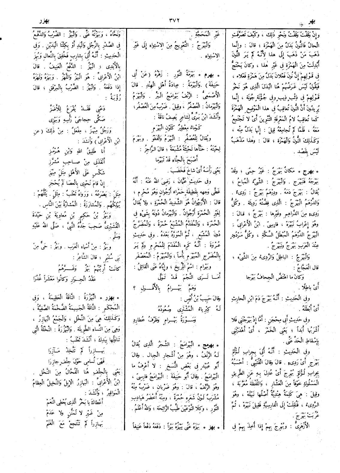 ( بهزر ) البُهْزُرَةُ الناقة العظيمة وفي المحكم الناقةُ الجسيمةُ الضَّخْمة الصَّفِيَّة وكذلك هي من النخلِ والجمع البَهازِر وهي من النساء الطويلة والبُهْزُرَةُ النخلة التي تَناوَلُها بيدِكَ أَنشد ثعلب بَهازِراً لم تَتَّخِذْ مآزِرا فهي تُسامي حَوْلَ جِلْفٍ جازِرا يعني بالجلْفِ هنا الفُحَّال من النخل ابن الأَعرابي البَهازِرُ الإِبل والنخيل العظام المَواقِيرُ وأَنشد أَعْطاكَ يا بَحْرُ الذي يُعطي النَّعَمْ من غيرِ لا تَمَنُّنٍ ولا عَدَمْ بَهازِراً لم تَنْتَجِعْ مع الغَنَمْ