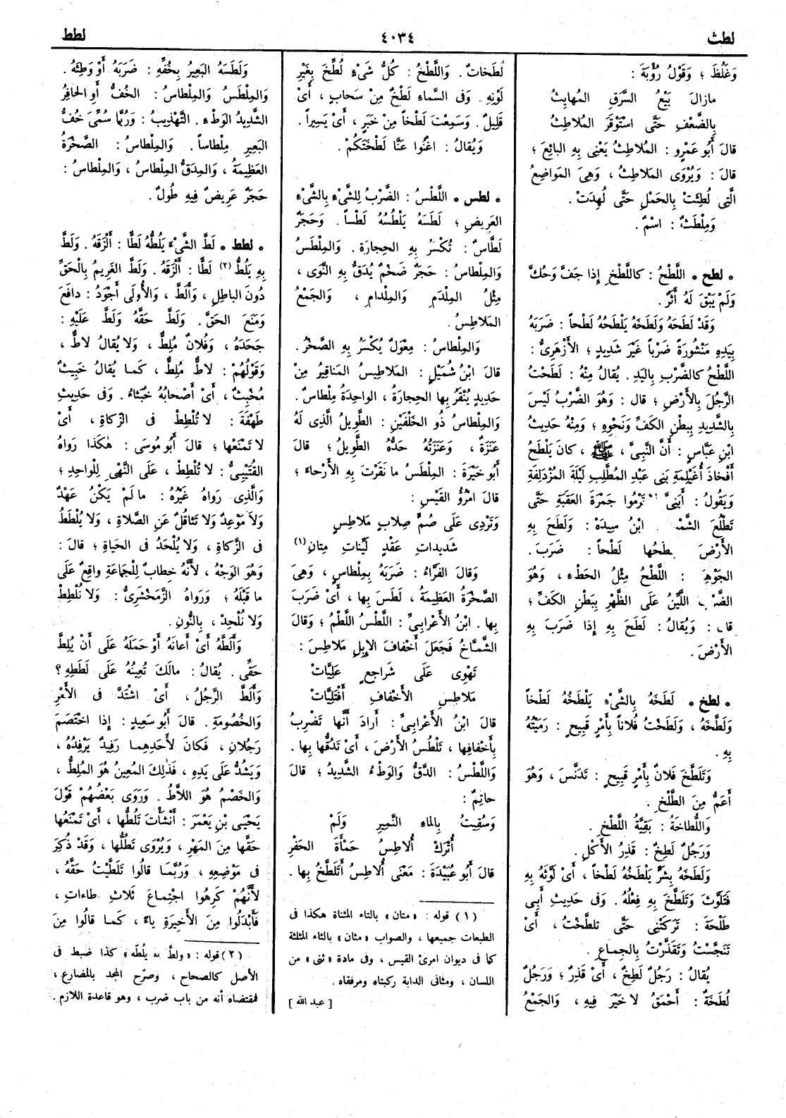 ( لطخ ) لطخه بالشيء يَلْطَخه لطخاً ولطَّخه ولطختُ فلاناً بأَمر قبيح رميته به وتلطَّخ فلان بأَمر قبيح تدنس وهو أَعم من الطَّلْخ واللُّطاخَة بقية اللَّطْخ ورجل لَطِخٌ قذر الأَكل ولَطَخَه بشرٍّ يلطَخُه لطْخاً أَي لوَّثه به فتلوَّث وتلطخ به فعله وفي حديث أَبي طلحة تركتْني حتى تلطَّخْت أَي تنجست وتقذرت بالجماع يقال رجل لَطِخ أَي قذر ورجل لُطَخَة أَحمق لا خير فيه والجمع لطَخات واللَّطخ كل شيءٍ لُطِّخ بغير لونه وفي السماء لَطْخٌ من سحاب أَي قليل وسمعت لَطْخاً من خَبَرٍ أَي يسيراً ويقال اغنُوا لَطْختكم ( لطس ) اللَّطْس الضَّرْب للشيء بالشيء العَريض لَطَسه يَلْطُسُه لَطْساً وحجرٌ لَطَّاس تُكْسَر به الحجارة والمِلْطَسُ والمِلْطاس حَجَرٌ ضخْم يُدَقُّ به النَّوى مثل المِلْدَم والمِلْدام والجمع المَلاطِس والمِلْطاس مِعْوَل يكسَر به الصخر قال ابن شميل المَلاطِيس المَناقِير من حديد يُنْقَر بها الحجارة الواحدة مِلْطاس والمِلْطاس ذو الخَلْفَين الطويل الذي له عَنَزَة وعَنَزَتُه حدُّه الطويلُ قال أَبو خيرة المِلْطَس ما نَقَرْتَ به الأَرجاء قال امرؤْ القيس وتَرْدي على صُمٍّ صِلاب مَلاطِس شَديدات عَقْد لَيِّنات مِتان وقال الفرّاء ضربه بِمِلْطاس وهي الصخرة العظيمة لَطَسَ بها أَي ضرَب بها ابن الأَعرابي اللَّطْسُ اللَّطْمُ وقال الشماخ فجعل أَخفاف الإِبل مَلاطِس تَهْوي على شَراجِعٍ عَلِيَّاتْ مَلاطِسِ الأَخْفافِ أَفْتَلِيَّاتْ قال ابن الأَعرابي أَراد أَنها تضرِب بأَخْفافِها تَلْطُسُ الأَرض أَي تَدُقُّها بها واللَّطْس الدَّقُّ والوَطءُ الشديد قال حاتم وسُقِيتُ بالماءِ النَّميرِ ولم أَُترَكْ أُلاطِسُ حَمْأَة الحَفْرِ قال أَبو عبيدة معنى أُلاطِسُ أَتَلَطَّخ بها ولَطَسه البعيرُ بخفِّه ضرَبه أَو وَطِئَه والمِلْطَس والمِلْطاس الخُفُّ أَو الحافر الشديد الوطء التهذيب وربما سمي خُفُّ البعير مِلْطاساً والمِلْطاس الصخرة العظيمة والمِدَقُّ المِلْطاس والمِلْطاس حجر عَريض فيه طُول