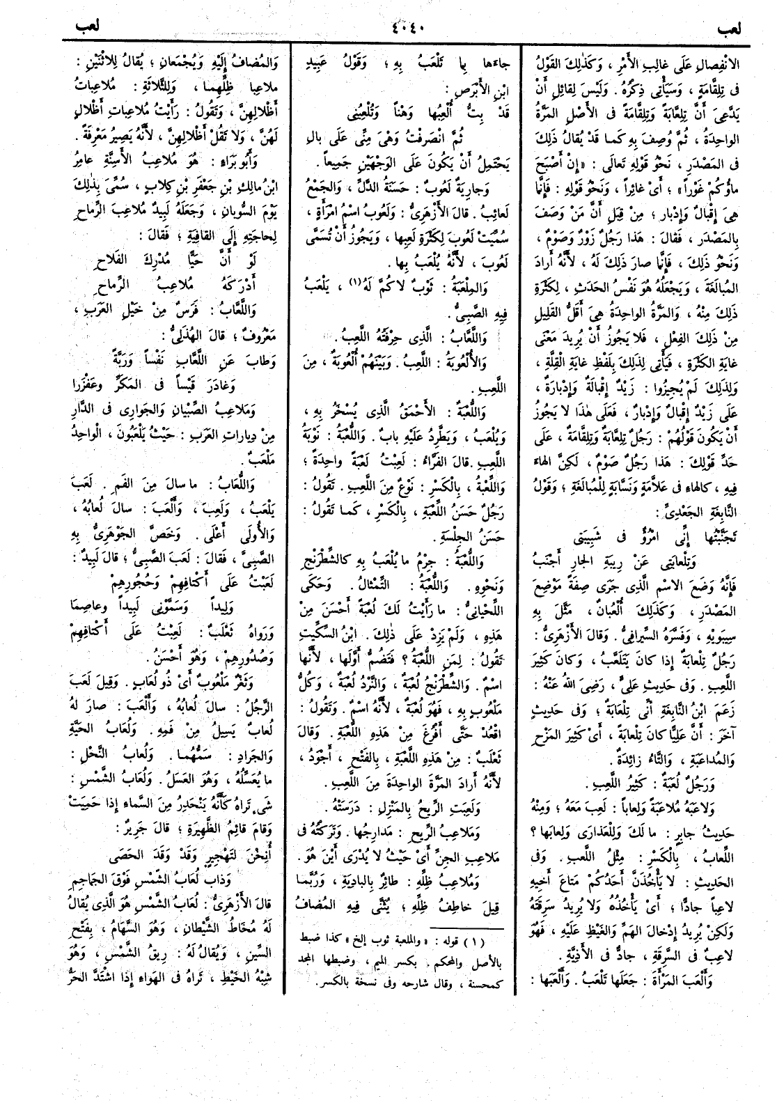 يَلْعَبُ فيه الصبيُّ واللَّعَّابُ الذي حِرْفَتُه اللَّعِبُ والأُلْعوبةُ اللَّعِبُ وبينهم أُلْعُوبة مِن اللَّعِبِ واللُّعْبةُ الأَحْمَق الذي يُسْخَرُ به ويُلْعَبُ ويَطَّرِدُ عليه بابٌ واللُّعْبةُ نَوْبةُ اللَّعِبِ وقال الفراء لَعِبْتُ لَعْبةً واحدةً واللِّعْبةُ بالكسر نوع من اللَّعِبِ تقول رجل حَسَنُ اللِّعْبة بالكسر كما تقول حسَنُ الجِلْسة واللُّعْبةُ جِرْم ما يُلْعَبُ به كالشِّطْرَنْج ونحوه واللُّعْبةُ التِّمْثالُ وحكى اللحياني ما رأَيت لكَ لُعْبةً أَحْسَنَ من هذه ولم يَزِدْ على ذلك ابن السكيت يقول لِمن اللُّعْبةُ ؟ فتضم أَوَّلَها لأَنها اسمٌ والشِّطْرَنْجُ لُعْبةٌ والنَّرْدُ لُعْبة وكلُّ مَلْعوب به فهو لُعْبة لأَنه اسم وتقول اقْعُدْ حتى أَفْرُغَ من هذه اللُّعْبةِ وقال ثعلب من هذه اللَّعْبةِ بالفتح أَجودُ لأَنه أَراد المرّة الواحدةَ من اللَّعِب ولَعِبَت الريحُ بالمنزل دَرَسَتْه ومَلاعِبُ الريح مَدارِجُها وتركتُه في مَلاعِب الجنّ أَي حيث لا يُدْرَى أَيْنَ هو ومُلاعِبُ ظِلِّه طائرٌ بالبادية وربما قيل خاطِفُ ظِلِّه يُثَنَّى فيه المضافُ والمضافُ إِليه ويُجْمَعانِ يقال للاثنين ملاعِبا ظِلِّهِما وللثلاثة مُلاعِباتُ أَظْلالِهِنّ وتقول رأَيتُ مُلاعِباتِ أَظْلالٍ لهُنَّ ولا تقل أَظْلالِهنّ لأَنه يصير معرفة وأَبو بَرَاء هو مُلاعِبُ الأَسِنَّةِ عامِرُ بن مالك بن جعفرِ بن كِلابٍ سُمي بذلك يوم السُّوبان وجعله لبيدٌ مُلاعِبَ الرِّماحِ لحاجته إِلى القافية فقال