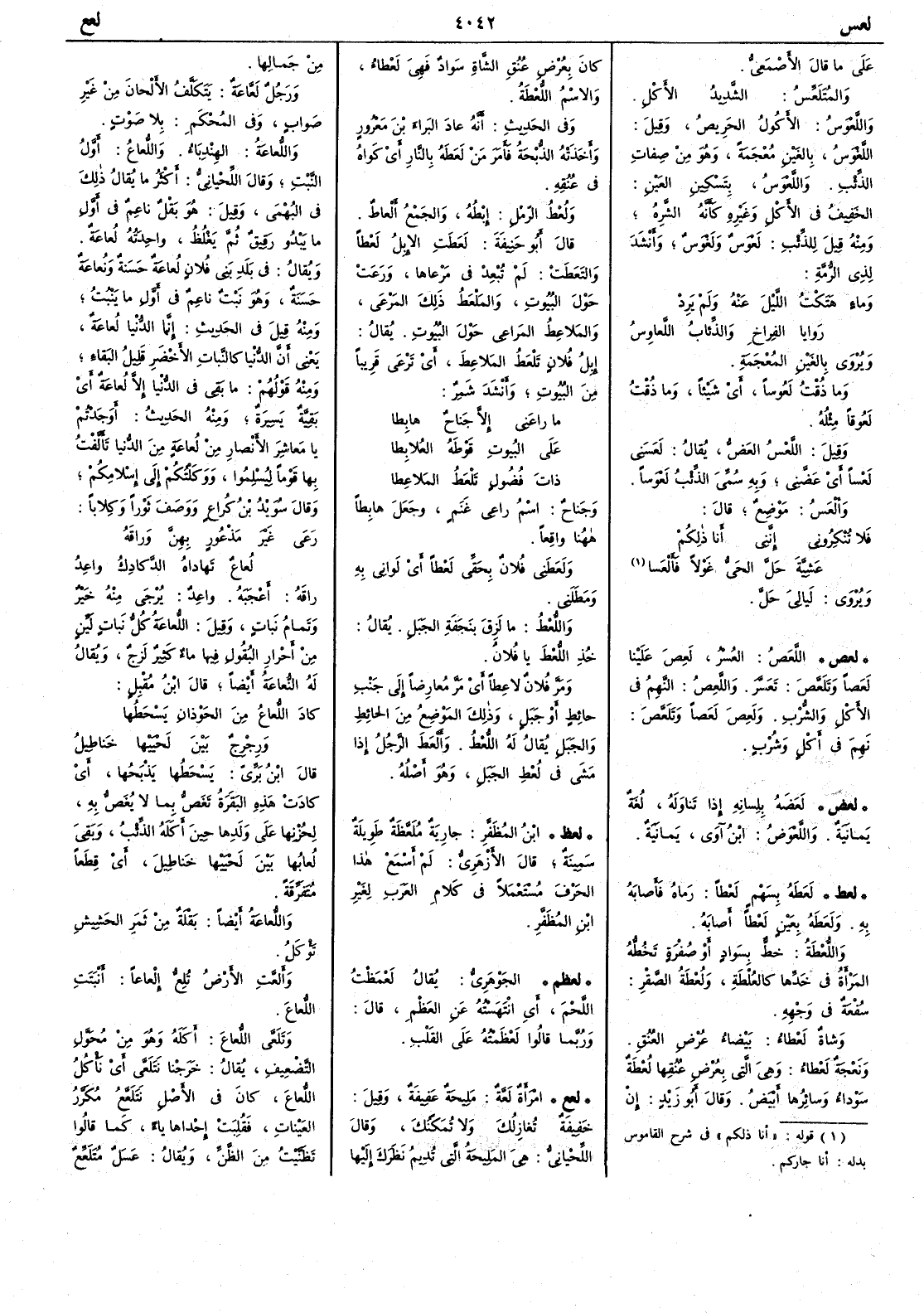 على ما قال الأَصمعي والمُتَلَعِّس الشديد الأَكل واللَّعْوَس الأَكُول الحَريص وقيل اللَّغْوَس بالغين معجمة وهو من صفات الذئب واللَّعْوس بتسكين العين الخفيف في الأَكل وغيره كأَنه الشَّرِه ومنه قيل للذئب لَعْوَس ولَغْوَس وأَنشد لذي الرُّمة وماءٍ هَتَكْتُ اللَّيْلَ عنه ولم يَرِدْ رَوايا الفِراخِ والذِّئابُ اللَّعاوِسُ ويروى بالغين المعجمة وما ذقت لَعُوساً أَي شيئاً وما ذُقْتُ لَعُوقاً مثله وقيل اللَّعْس العَضُّ يقال لَعَسَني لَعْساً أَي عَضَّني وبه سمي الذئب لَعْوَساً وأَلْعَسُ موضع قال فلا تُنْكِرُوني إِنَّني أَنا ذَلِكُمْ عَشِيَّةَ حَلَّ الحَيُّ غَوْلاً فأَلْعَسا ويروى لَياليَ حَلَّ ( لعص ) اللَّعَصُ العُسْرُ لَعِصَ علينا لَعَصاً وتَلعّص تعسّر واللَّعِصُ النَّهِمُ في الأَكل والشرب ولَعِصَ لَعَصاً وتلَعَّصَ نَهِمَ في أَكل وشرب ( لعض ) لعَضَه بلسانه إِذا تناوله لغة يمانية واللَّعْوَضُ ابن آوَى يمانية( لعط ) : لَعَطَه بسهم لَعْطاً : رماه فأَصابه به . و لَعَطه بعين لَعْطاً : أَصابه . و اللُّعْطةُ : خطٌّ بسواد أَو صفرة تَخُطُّه المرأَة في خدّها كالعُلْطة و لُعْطةُ الصَّقْر : سُفْعةٌ في وجهه . وشاة لَعْطاء بيضاء عُرْضِ العنق . ونعجة لَعْطاء : وهي التي بعُرضِ عُنقها لُعْطةٌ سَوْداء وسائرها أَبيض . وقال أَبو زيد : إِن كان بِعُرْضِ عنق الشاة سواد فهي لَعْطاء والاسم اللُّعْطة . وفي الحديث : أَنه عاد البَراءَ بن مَعْرُور وأَخذَتْه الذُّبْحةُ فأَمَرَ مَن لَعَطَه بالنّار أَي كَواه في عُنُقه . و لُعْط الرّمْلِ : إِبْطُه والجمع أَلعاط . قال أَبو حنيفة : لَعَطَتِ الإِبِلُ لَعْطاً و التَعَطَتْ لم تُبْعِدْ في مَرْعاها ورَعَتْ حَولَ البيوت و المَلْعَطُ ذلك المَرْعَى و المَلاعِطُ المَراعِي حول البيوت . يقال : إِبلُ فلانٍ تَلْعَطُ المَلاعِطَ أَي تَرعَى قريباً من البيوت وأَنشد شمر : ما راعَنِي إِلاَّ جَناحٌ هابِطا على البُيوتِ قَوْطه العُلابِطا ذاتَ فُضُولٍ تَلْعَطُ المَلاعِطا وجَناحٌ : اسم راعي غنم وجَعَل هابطاً ههنا واقِعاً . و لَعَطَنِي فلان بحقِّي لَعْطاً أَي لَوانِي به ومَطَلَنِي . و اللُّعْطُ : ما لَزِقَ بنَجَفةِ الجبل . يقال : خذ اللُّعْطَ يا فلان . ومَرّ فلان لاعطاً أَي مَرّ مُعارضاً إِلى جنب حائط أَو جبل وذلك الموضع من الحائط والجبَل يقال له اللُّعْطُ . و أَلْعَطَ الرّجلُ إِذا مشى في لُعْطِ الجبل وهو أَصله ( لعظ ) ابن المظفر جارية مُلَعَّظة طويلة سمينة قال الأَزهري لم أَسمع هذا الحرف مستعملاً في كلام العرب لغير ابن المظفر ( لعظم ) الجوهري يقال لَعْمَظْتُ اللحمَ أَي انتهَسْته عن العظم قال وربما قالوا لَعْظَمْتُه على القلب( لعع ) امرأة لَعَّةٌ ملِيحةٌ عفِيفةٌ وقيل خفيفة تُغازِلُكَ ولا تُمَكِّنكَ وقال اللحياني هي الملِيحةُ التي تُدِيمُ نَظَرَك إِليها من جَمالِها ورجل لَعَّاعة يَتَكَلَّف الأَلْحانَ من غير صواب وفي المحكم بلا صوْتٍ واللُّعاعةُ الهِنْدِبَاءُ واللُّعاعُ أَوَّل النَّبْتِ وقال اللحياني أَكثر ما يقال ذلك في البُهْمَى وقيل هو بقل ناعم في أَوَّلِ ما يَبْدُو رقِيقٌ ثم يَغْلُظ واحدته لُعاعةٌ ويقال في بلد بني فان لُعاعةٌ حسَنةٌ ونعاعة حسنة وهو نبت ناعِمٌ في أَوَّلِ ما ينبت ومنه قيل في الحديث إِنما الدنيا لُعاعةٌ يعني أَنَّ الدنيا كالنبات الأَخضرِ قَليل البقاء ومنه قولهم ما بقي في الدنيا إِلاَّ لُعاعةٌ أَي بقِيَّةٌ يسيرة ومنه الحديث أَوجَدْتُم يا معاشِرَ الأَنْصارِ من لُعاعةٍ من الدنيا تأَلَّفْتُ بها قوماً ليُسْلِمُوا ووَكَلْتُكم إِلى إِسْلامِكم وقال سويد بن كراع ووصف ثوراً وكلاباً رَعَى غيرَ مَذْعُورٍ بِهِنّ وراقَه لُعاعٌ تَهاداهُ الدَّكادِكُ واعِدُ راقَه أَعْجَبَه واعِدٌ يُرْجَى منه خَيْرٌ وتمامُ نباتٍ وقيل اللُّعاعةُ كل نبات ليِّن من أَحْرارِ البُقُولِ فيها ماءٌ كثير لَزِجٌ ويقال له النُّعاعةُ أَيضاً قال ابن مقبل كادَ اللُّعاعُ من الحَوْذان