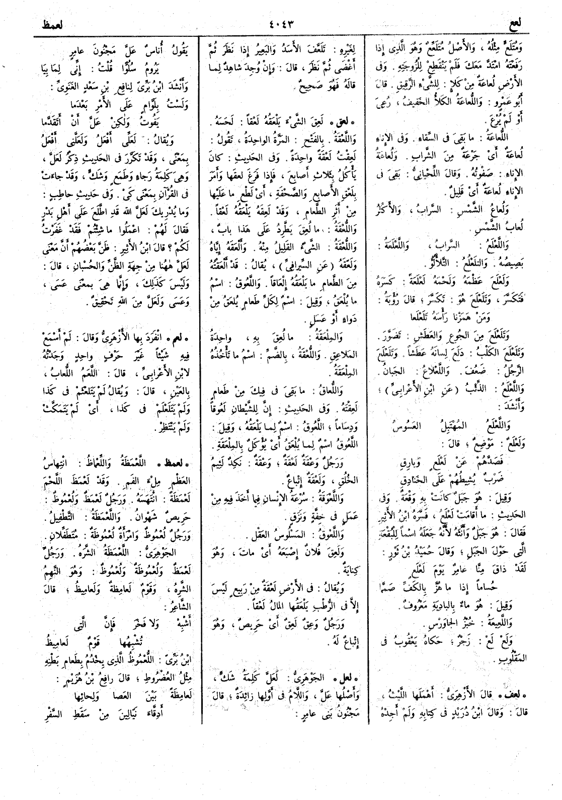 ومُتَلَعٍّ مثله والأَصل مُتَلَعِّعٌ وهو الذي إِذا رَفَعْتَه امتدَّ معك فلم ينقطع للزوجته وفي الأَرض لُعاعةٌ من كَلإٍ للشيءِ الرقيق قال أَبو عمرو واللُّعاعةُ الكَلأُ الخفيف رُعِيَ أَو لم يُرْعَ اللُّعاعةُ ما بقي في السقاء وفي الإِناءِ لُعاعةٌ أَي جَرْعةٌ من الشراب ولُعاعةُ الإِناء صَفْوتُه وقال اللحياني بَقِيَ في الإِناءِ لُعاعةٌ أَي قليل ولُعاعُ الشمس السرابُ والأَكثر لُعابُ الشمس واللَّعْلَع السرابُ واللَّعْلَعةُ بَصِيصُه والتلَعْلُعْ التَّلأْلُؤْ ولَعْلَع عظْمَه ولَحْمَه لَعْلَعةً كَسره فتكسَّر وتَلَعْلَع هو تكسر قال رؤْبة ومَنْ هَمَزْنا رأْسَه تَلَعْلَعا وتَلَعْلَعَ من الجُوعِ والعطش تَضَوَّر وتَلَعْلَعَ الكلب دلَعَ لسانَه عطَشاً وتَلَعْلَعَ الرجُل ضَعُفَ واللَّعْلاعُ الجبانُ واللَّعْلَعُ الذئب عن ابن الأَعرابي وأَنشد واللَّعْلَعُ المُهْتَبِلُ العَسُوسُ ولَعْلَعٌ موضع قال فَصَدَّهُم عن لَعْلَعٍ وبارِقِ ضَرْبٌ يُشِيطُهم على الخَنادِقِ وقيل هو جبل كانت به وقْعة وفي الحديث ما أَقامَتْ لَعْلَعُ فسره ابن الأَثير فقال هو جبل وأَنثه لأَنه جعله اسماً للبقعة التي حول الجبل وقال حميد بن ثور لقد ذاقَ مِنَّا عامِرٌ يومَ لَعْلَعٍ حُساماً إِذا ما هُزّ بالكَفِّ صَمَّما وقيل هو ماءٌ بالبادية معروف واللَّعِيعةُ خبز الجاوَرْسِ ولَعْ لَعْ زجر حكاه يعقوب في المقلوب ( لعف ) قال الأَزهري أَهملها الليث قال وقال ابن دريد في كتابه ولم أَجده لغيره تَلَعَّفَ الأَسدُ والبعير إذا نظَر ثم أَغضى ثم نظر قال وإن وجد شاهد لما قاله فهو صحيح( لعق ) لَعِقَ الشيءَ يَلْعَقُه لعْقاً لحسه واللَّعْقةُ بالفتح المرَّة الواحدة تقول لَعِقْتُ لَعْقَةً واحدة وفي الحديث كان يأكل بثلاث أصابع فإذا فرغ لعِقَها وأَمر بلَعْق الأَصابع والصَّحفْة أَي لَطْع ما عليها من أَثر الطعام وقد لَعِقَه يَلْعَقهُ لعْقاً واللُّعقةُ ما لُعِقَ يطَّرد على هذا الباب واللَّعْقَة الشيء القليل منه وأَلْعَقَه إياه ولَعَقه عن السيرافي يقال قد أَلْعَقُتُه من الطعام ما يَلْعَقُه إلْعَاقاً واللَّعُوق اسم ما يُلْعَقُ وقيل اسم لكل طعام يُلْعَقُ من دواء أو عسل والمِلْعَقَةُ ما لُعِقَ به واحدة المَلاعق واللُّعْقةُ بالضم اسم ما تأخذه المِلْعَقةُ واللُّعاقُ ما بقي في فيك من طعام لَعِقْتَهُ وفي الحديث إن للشيطان لَعُوقاً ودِسَاماً اللَّعُوق اسم لِما يَلْعَقُه وقيل اللَّعُوق اسم لم يُلْعَق أَي يؤكل بالمِلْعَقَة ورجل وَعْقة لَعْقة وعْقَة نكد لئيم الخلق ولَعْقة إتباع واللَّعْوقةُ سرعة الإنسان فيما أَخذ فيه من عمل في خفةٍ ونَزَقٍ واللَّعْوق المَسْلوسُ العقل ولَعِقَ فلان إصبعه أي مات وهو كناية ويقال في الأرض لَعْقة من ربيع ليس إلا في الرُّطْب يَلْعَقُها المال لَعْقاً ورجل وَعِقٌ لَعِقٌ أي حريص وهو إتباع له ( لعل ) الجوهري لَعَلَّ كلمة شك وأَصلها عَلَّ واللام في أَولها زائدة قال مجنون بني عامر يقول أُناسٌ عَلَّ مجنونَ عامِرٍ يَرُومُ سُلُوّاً قلتُ إِنِّي لِمَا بيَا وأَنشد ابن بري لنافع بن سعد الغَنَويّ ولَسْتُ بِلَوَّامٍ على الأَمْرِ بعدما يفوتُ ولكن عَلَّ أَنْ أَتَقَدَّما ويقال لَعَلِّي أَفعل ولعلَّني أَفعل بمعنى وقد تكرر في الحديث ذكر لَعَلَّ وهي كلمة رجاءٍ وطمَع وشك وقد جاءت في القرآن بمعنى كَيْ وفي حديث حاطِب وما يُدْرِيك لَعَلَّ الله قد اطَّلَعَ على أَهل بَدْرٍ فقال لهم اعملوا ما شئتم فقد غفرتُ لكم ؟ قال ابن الأَثير ظن بعضُهم أَن معنى لعَلَّ ههنا من جهة الظن والحسبان قال وليس كذلك وإِنما هي بمعنى عَسَى وعَسَى ولعلَّ من الله تحقيق ( لعم ) انفرد بها الأَزهري وقال لم أَسمع فيه شيئاً غير حرف واحد وجدته لابن الأَعرابي قال اللَّعَمُ اللُّعابُ بالعين قال ويقال لم يتَلعْثَمْ في كذا ولم يتَلَعْلَمْ في كذا أَي لم يتمكَّث ولم ينتظر ( لعمظ ) اللَّعْمظةُ واللِّعْماظُ انْتِهاسُ العظم مِلْء الفم وقد لَعْمَظَ ال