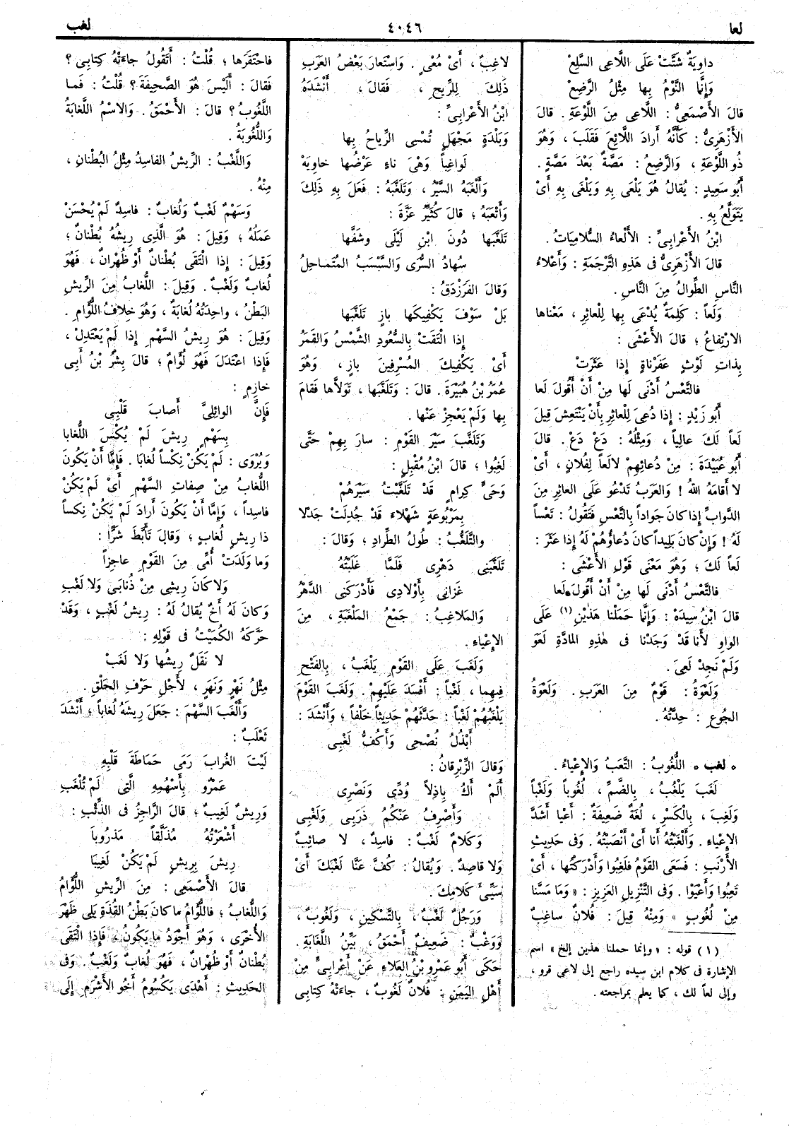 وكلامٌ لَغْبٌ فاسِدٌ لا صائِبٌ ولا قاصِدٌ ويقال كُفَّ عَنَّا لَغْبَك أَي سَيِّئَ كلامِك ورجلٌ لَغْبٌ بالتسكين ولَغُوبٌ ووَغْبٌ ضعيفٌ أَحمَقُ بيِّنُ اللَّغَابةِ حكى أَبو عمرو بنُ العَلاٍءِ عن أَعرابي من أَهل اليمن فلانٌ لَغُوبٌ جاءَته كتابي فاحْتَقَرَها قلتُ أَتقول جاءَته كتابي ؟ فقال أَليس هو الصحيفةَ ؟ قلتُ فما اللَّغُوبُ ؟ قال الأَحْمق والاسم اللَّغابة واللُّغُوبةُ واللَّغْبُ الرِّيش الفاسِدُ مثل البُطْنانِ منه [ ص 743 ] وسَهْمٌ لَغْبٌ ولُغابٌ فاسِدٌ لم يُحْسَنْ عَمَلُه وقيل هو الذي ريشُه بُطْنانٌ وقيل إِذا الْتَقَى بُطْنانٌ أَو ظُهْرانٌ فهو لُغابٌ ولَغْبٌ وقيل اللُّغابُ من الريش البَطْنُ واحدتُه لُغابةٌ وهو خلافُ اللُّؤَام وقيل هو ريشُ السَّهْم إِذا لم يَعْتَدِلْ فإِذا اعْتَدَلَ فهو لُؤَامٌ قال بِشْرُ بن أَبي خازم