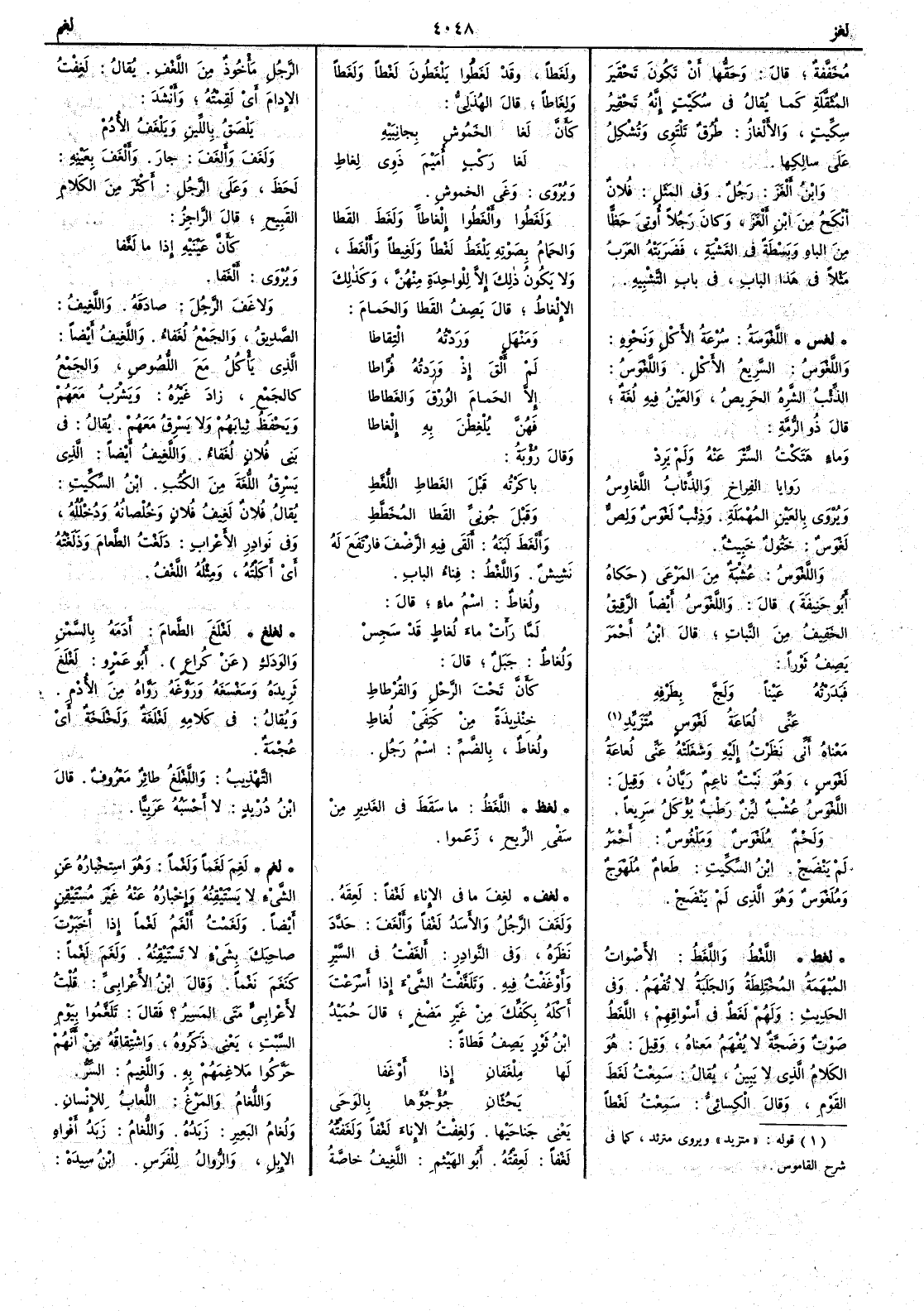 ( لغظ ) اللَّغَظ ما سقط في الغَدِير من سَفْيِ الرّيح زعموا ( لغف ) لغِف ما في الإناء لَغْفاً لَعِقَه ولَغَف الرجلُ والأَسد لغْفاً وأَلغَفَ حدَّد نظره وفي النوادر أَلغَفْت في السيْر وأَوْغَفْت فيه وتلغَّفْت الشيء إذا أَسرعت أَكله بكفك من غير مضْغ قال حميد بن ثور يصف قطاة لها ملْغفانِ إذا أَوْغَفا يَحُثَّان جُؤْجُؤَها بالوَحى يعني جناحيها ولغِفْت الإناء لَغْفاً ولغَفْته لَغْفاً لَعِقْته أَبو الهيثم اللَّغِيف خاصّةُ الرجل مأْخوذ من اللَّغْف يقال لَغِفْت الإدام أَي لَقِمْته وأَنشد يلعصق باللِّينِ ويَلْغَفُ الأُدُمْ ولغَفَ وأَلغَفَ جارَ وأَلغَف بعينه لَحَظ وعلى الرجل أَكثر من الكلام القبيح قال الراجز كأَنَّ عَيْنَيه إذا ما لَغَّفا ويروى أَلغفا ولاغَف الرجلَ صادَقه واللَّغيفُ الصَّدِيق والجمع لُغفاء واللغِيف أَيضاً الذي يأْكل مع اللُّصوص والجمع كالجمع زاد غيره ويشرب معهم ويحفظ ثيابهم ولا يسرق معهم يقال في بني فلان لُغَفاء واللغِيف أَيضاً الذي يسرق اللغة من الكتب ابن السكيت يقال فلان لغِيفُ فلان وخُلْصانه ودُخْلُلهُ وفي نوادر الأَعراب دَلَغْت الطعام وذَلَغْته أَي أَكلته ومثله اللَّغْف ( لغلغ ) لَغْلَغَ الطعامَ أَدَمَه بالسمن والوَدَك عن كراع أَبو عمرو لَغْلَغَ ثَرِيدَه وسَغْسَغَه ورَوَّغَه رَوّاه من الأُدْمِ ويقال في كلامه لَغْلغةٌ ولَخْلخةٌ أَي عُجْمة التهذيب واللَّغْلَغُ طائر معروف غيره اللَّغْلَغُ طائر معروف قال ابن دريد لا أَحسبه عربيّاً( لغم ) لَغِمَ لَغَماً ولَغْماً وهو استِخْبارُه عن الشيء لا يستيقنه وإِخبارُه عنه غير مستيقن أَيضاً ولَغَمْتُ أَلغَمُ لَغْماً إِذا أَخبَرْت صاحبك بشيء لا تستيقنه وَلَغَم لَغْماً كنَغَم نَغْماً وقال ابن الأَعرابي قلت لأَعرابي مَتى المَسِير ؟ فقال تَلَغَّموا بيومِ السبْت يعني ذكَروه واشتقاقه من أَنهم حرَّكوا مَلاغِمَهم به واللَّغِيمُ السِّرّ واللُّغامُ والمَرْغُ اللُّعاب للإِنسان ولُغام البعير زَبَدُه واللُّغامُ زَبَدُ أَفواهِ الإِبل والرُّوالُ للفرس ابن سيده