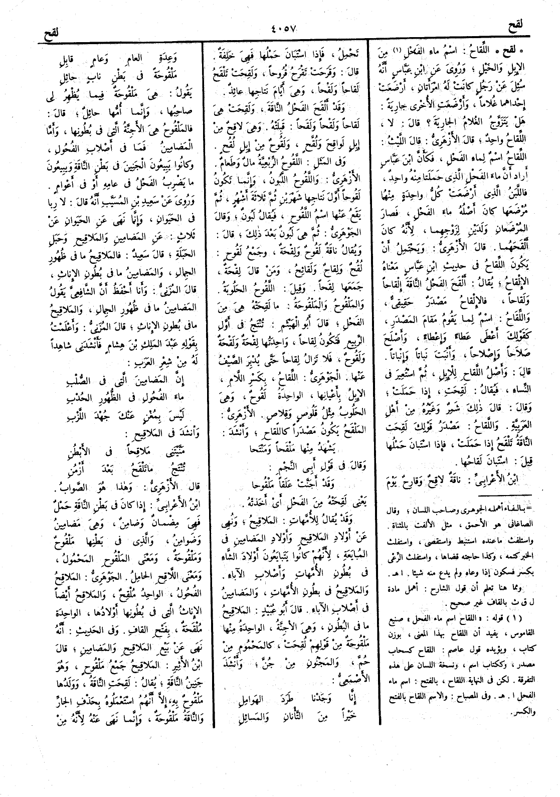 ( * قوله « اللقاح اسم ماء الفحل » صنيع القاموس يفيد أَن اللقاح بهذا المعنى بوزن كتاب ويؤيده قول عاصم اللقاح كسحاب مصدر وككتاب اسم ونسخة اللسان على هذه التفرقة لكن في النهاية اللقاح بالفتح اسم ماء الفحل اه وفي المصباح والاسم اللقاح بالفتح والكسر ) من الإِبل والخيل وروي عن ابن عباس أَنه سئل عن رجل كانت له امرأَتان أَرضعت إِحداهما غلاماً وأَرضعت الأُخرى جارية هل يتزوَّج الغلامُ الجارية ؟ قال لا اللِّقاح واحد قال الأَزهري قال الليث اللِّقاح اسم لماء الفحل فكأَنَّ ابن عباس أَراد أَن ماء الفحل الذي حملتا منه واحد فاللبن الذي أَرضعت كل واحدة منهما مُرْضَعَها كان أَصله ماء الفحل فصار المُرْضَعان ولدين لزوجهما لأَنه كان أَلْقَحهما قال الأزهري ويحتمل أَن يكون اللِّقاحُ في حديث ابن عباس معناه الإِلْقاحُ يقال أَلْقَح الفحل الناقة إِلقاحاً ولَقاحاً فالإِلقاح مصدر حقيقي واللِّقَاحُ اسم لما يقوم مقام المصدر كقولك أَعْطَى عَطاء وإِعطاء وأَصلح صَلاحاً وإِصلاحاً وأَنْبَت نَباتاً وإِنباتاً قال وأَصل اللِّقاح للإِبل ثم استعير في النساء فيقال لَقِحَتِ إِذا حَمَلَتْ وقال قال ذلك شمر وغيره من أَهل العربية واللِّقاحُ مصدر قولك لَقِحَتْ الناقة تَلْقَحُ إِذا حَمَلَتْ فإِذا استبان حملها قيل استبان لَقاحُها ابن الأَعرابي ناقة لاقِحٌ وقارِحٌ يوم تَحْمِلُ فإِذا استبان حملها فهي خَلِفَةٌ قال وقَرَحتْ تَقرَحُ قُرُوحاً ولَقِحَتْ تَلْقَح لَقاحاً ولَقْحاً وهي أَيام نَتاجِها عائذ وقد أَلقَح الفحلُ الناقةَ ولَقِحَتْ هي لَقاحاً ولَقْحاً ولَقَحاً قبلته وهي لاقِحٌ من إِبل لوَاقِح ولُقَّحٍ ولَقُوحٌ من إِبل لُقُحٍ وفي المثل اللَّقُوحُ الرِّبْعِيَّةُ مالٌ وطعامٌ الأَزهري واللَّقُوحُ اللَّبُونُ وإِنما تكون لَقُوحاً أَوّلَ نَتاجِها شهرين ثم ثلاثة أَشهر ثم يقع عنها اسم اللَّقوحِ فيقال لَبُونٌ وقال الجوهري ثم هي لبون بعد ذلك قال ويقال ناقة لَقُوحٌ ولِقْحَةٌ وجمع لَقُوحٍ لُقُحٌ ولِقاحٌ ولَقائِحُ ومن قال لِقْحةٌ جَمَعها لِقَحاً وقيل اللَّقُوحُ الحَلُوبة والمَلْقوح والملقوحة ما لَقِحَتْه هي من الفحلِ قال أَبو الهيثم تُنْتَجُ في أَوَّل الربيع فتكون لِقاحاً واحدتُها لِقْحة ولَقْحةٌ ولَقُوحٌ فلا تزال لِقاحاً حتى يُدْبِرَ الصيفُ عنها الجوهري اللِّقاحُ بكسر اللام الإِبلُ بأَعيانها الواحدة لَقُوح وهي الحَلُوبُ مثل قَلُوصٍ وقِلاصٍ الأَزهري المَلْقَحُ يكون مصدراً كاللَّقاحِ وأَنشد يَشْهَدُ منها مَلْقَحاً ومَنْتَحا وقال في قول أَبي النجم وقد أَجَنَّتْ عَلَقاً ملقوحا يعني لَقِحَتْه من الفَحل أَي أَخذته وقد يقال للأُمَّهات المَلاقِيحُ ونهى عن أَولادِ المَلاقِيح وأَولاد المَضامِين في المبايعة لأَنهم كانوا يتبايعون أَولاد الشاء في بطون الأُمهات وأَصلاب الآباء والمَلاقِيحُ في بطون الأُمهات والمَضامِينُ في أَصلاب الآباء قال أَبو عبيد الملاقيح ما في البطون وهي الأَجِنَّة الواحدة منها مَلْقُوحة من قولهم لُقِحَتْ كالمحموم من حُمَّ والمجنونِ من جُنَّ وأَنشد الأَصمعي إِنَّا وَجَدْنا طَرَدَ الهَوامِلِ خيراً من التَّأْنانِ والمَسائِلِ وعِدَةِ العامِ وعامٍ قابلِ مَلْقوحةً في بطنِ نابٍ حائِلِ يقول هي مَلْقوحةٌ فيما يُظْهِرُ لي صاحبُها وإِنما أُمُّها حائل قال فالمَلْقُوح هي الأَجِنَّة التي في بطونها وأَما المضامين فما في أَصلاب الفُحُول وكانوا يبيعون الجَنينَ في بطن الناقة ويبيعون ما يَضْرِبُ الفحلُ في عامه أَو في أَعوام وروي عن سعيد بن المسيب أَنه قال لا رِبا في الحيوان وإِنما نهى عن الحيوان عن ثلاث عن المَضامِين والمَلاقِيح وحَبَلِ الحَبَلَةِ قال سعيد فالملاقِيحُ ما في ظهور الجمال والمضامين ما في بطون الإِناث قال المُزَنِيُّ وأَنا أَحفظ أَن الشافعي يقول المضامين ما في ظهور الجمال والملاقيح ما في بطون الإِناث قال المزني وأَعلمت بقوله عبد الملك بن هشام فأَنشدني شاهداً له م