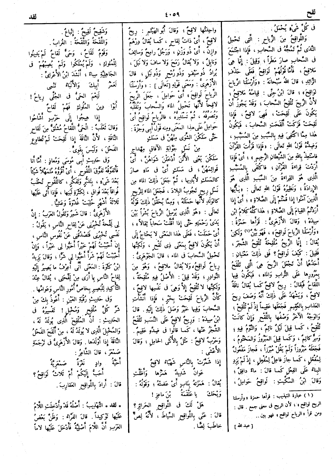 في كل شيء يحمل واللَّواقِحُ من الرياح التي تَحْمِلُ النَّدَى ثم تَمُجُّه في السحاب فإِذا اجتمع في السحاب صار مطراً وقيل إِنما هي مَلاقِحُ فأَما قولهم لواقِحُ فعلى حذف الزائد قال الله سبحانه وأَرسلنا الرياح لوَاقِحَ قال ابن جني قياسه مَلاقِح لأَن الريح تُلْقِحُ السحابَ وقد يجوز أَن يكون على لَقِحَت فهي لاقِح فإِذا لَقِحَت فَزَكَتْ أَلْقَحت السحابَ فيكون هذا مما اكتفي فيه بالسبب من المسبب وضِدُّه قول الله تعالى فإِذا قرأْتَ القرآن فاستعذ بالله من الشيطان الرجيم أَي فإِذا أَردت قراءة القرآن فاكتفِ بالمُسَبَّب الذي هو القراءة من السبب الذي هو الإِرادة ونظيره قول الله تعالى يا أَيها الذين آمنوا إِذا قمتم إِلى الصلاة أَي إِذا أَردتم القيام إِلى الصلاة هذا كله كلام ابن سيده وقال الأَزهري قرأَها حمزة وأرسلنا الرياحَ لَواقِحَ فهو بَيِّنٌ ولكن يقال إِنما الريح مُلْقِحَة تُلْقِحُ الشجر فقيل كيف لواقح ؟ ففي ذلك معنيان أَحدهما أَن تجعل الريح هي التي تَلْقَحُ بمرورها على التراب والماء فيكون فيها اللِّقاحُ فيقال ريح لاقِح كما يقال ناقة لاقح ويشهد على ذلك أَنه وصف ريح العذاب بالعقيم فجعلها عقيماً إِذ لم تُلْقِحْ والوجه الآخر وصفها باللَّقْح وإِن كانت تُلْقِح كما قيل ليلٌ نائمٌ والنوم فيه وسِرٌّ كاتم وكما قيل المَبْرُوز والمحتوم فجعله مبروزاً ولم يقل مُبْرِزاً فجاز مفعول لمُفْعِل كما جاز فاعل لمُفْعَل إِذا لم يَزِدِ البناءُ على الفعل كما قال ماء دافق وقال ابن السكيت لواقح حوامل واحدتها لاقح وقال أَبو الهيثم ريح لاقح أَي ذات لقاح كما يقال درهم وازن أَي ذو وَزْن ورجل رامح وسائف ونابل ولا يقال رَمَحَ ولا سافَ ولا نَبَلَ يُرادُ ذو سيف وذو رُمْح وذو نَبْلٍ قال الأَزهري ومعنى قوله أَرسلنا الرياح لواقح أَي حوامل جعل الريح لاقحاً لأَنها تحمل الماء والسحاب وتقلِّبه وتصرِّفه ثم تَسْتَدِرُّه فالرياح لواقح أَي حوامل على هذا المعنى ومنه قول أَبي وَجْزَةَ حتى سَلَكْنَ الشَّوَى منهنّ في مَسَكٍ من نَسْلِ جَوَّابةِ الآفاقِ مِهْداجِ سَلَكْنَ يعني الأُتُنَ أَدخلن شَوَاهُنَّ أَي قوائمهن في مَسَكٍ أَي فيما صار كالمَسَكِ لأَيديهما ثم جعل ذلك الماء من نسل ريح تجوب البلاد فجعل الماء للريح كالولد لأَنها حملته ومما يحقق ذلك قوله تعالى هو الذي يُرْسِلُ الرياحَ نُشْراً بين يَدَيْ رَحْمَتِه حتى إِذا أَقَلّتْ سَحاباً ثِقالاً أَي حَمَلَتْ فعلى هذا المعنى لا يحتاج إِلى أَن يكون لاقِحٌ بمعنى ذي لَقْحٍ ولكنها تَحْمِلُ السحاب في الماء قال الجوهري رياحٌ لَواقِحُ ولا يقال ملاقِحُ وهو من النوادر وقد قيل الأَصل فيه مُلْقِحَة ولكنها لا تُلْقِحُ إِلا وهي في نفسها لاقِحٌ كأَن الرياحَ لَقِحَت بخَيْرٍ فإِذا أَنشأَتِ السحابَ وفيها خيرٌ وصل ذلك إِليه قال ابن سيده وريح لاقحٌ على النسب تَلْقَحُ الشجرُ عنها كما قالوا في ضِدِّهِ عَقِيم وحَرْب لاقحٌ مثل بالأُنثى الحامل وقال الأَعشى إِذا شَمَّرَتْ بالناسِ شَهْبَاءُ لاقحٌ عَوانٌ شديدٌ هَمْزُها وأَظَلَّتِ يقال هَمَزَتْه بناب أَي عضَّتْه وقوله وَيْحَكَ يا عَلْقَمةُ بنَ ماعِزِ هل لك في اللَّواقِحِ الجَوائِزِ ؟ قال عنى باللَّواقح السِّياط لأَنه لصٌّ خاطب لِصَّاً وشَقِيحٌ لَقِيحٌ إِتباع واللِّقْحةُ واللَّقْحةُ الغُراب وقوم لَقَاحٌ وحَيٌّ لَقاحٌ لم يدِينُوا للملوك ولم يُمْلَكُوا ولم يُصِبهم في الجاهلية سِباءٌ أَنشد ابن الأَعرابي لَعَمْرُ أَبيكَ والأَنْبَاءُ تَنْمِي لَنِعْمَ الحَيُّ في الجُلَّى رِياحُ أَبَوْا دِينَ المُلُوكِ فهم لَقاحٌ إِذا هِيجُوا إِلى حَرْبٍ أَشاحوا وقال ثعلب الحيُّ اللَّقاحُ مشتق من لَقاحِ الناقةِ لأَن الناقة إِذا لَقِحتْ لم تُطاوِع الفَحْلَ وليس بقويّ وفي حديث أَبي موسى ومُعاذٍ أَما أَنا فأَتَفَوَّقُه تَفَوُّقَ اللَّقُوحِ أَي أَقرؤه مُتَمَهِّلاً شيئاً بعد شيء بتدبر وتفكر كاللَّقُوحِ تُحْلَبُ فُواقاً بعد فُواقٍ لك