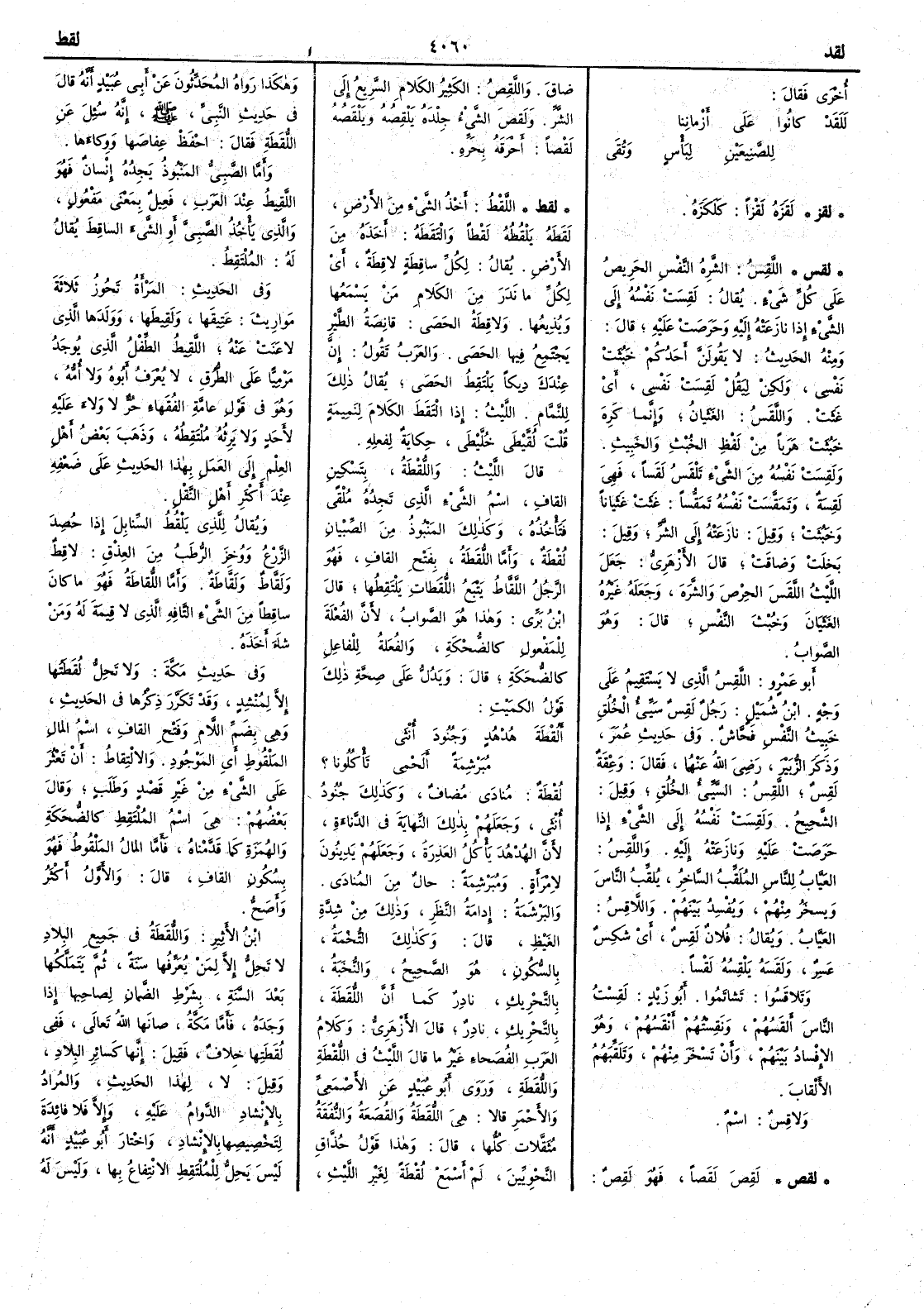 ( لقط ) اللَّقْطُ أَخْذُ الشيء من الأَرض لقَطَه يَلْقُطه لَقْطاً والتقَطَه أَخذه من الأَرض يقال لِكُلِّ ساقِطةٍ لاقِطةٌ أَي لكل ما نَدَر من الكلام مَن يَسْمَعُها ويُذِيعُها ولاقِطةُ الحَصى قانِصةُ الطير يجتمع فيها الحصى والعرب تقول إِنَّ عندك ديكاً يَلْتَقِط الحصى يقال ذلك للنّمّام الليث إِذا التقَط الكلامَ لنميمةٍ قلت لُقَّيْطَى خُلَّيْطَى حكاية لفعله قال الليث واللُّقْطةُ بتسكين القاف اسم الشيء الذي تجِدُه مُلْقىً فتأْخذه وكذلك المَنبوذ من الصبيان لُقْطةٌ وأَمّا اللُّقَطةُ بفتح القاف فهو الرجل اللّقّاطُ يتبع اللُّقْطات يَلْتَقِطُها قال ابن بري وهذا هو الصواب لأَنّ الفُعْلة للمفعول كالضُّحْكةِ والفُعَلةُ للفاعل كالضُّحَكةِ قال ويدل على صحة ذلك قول الكميت أَلُقْطَةَ هُدهدٍ وجُنُودَ أُنْثَى مُبَرْشِمةً أَلَحْمِي تأْكُلُونا ؟ لُقْطة منادى مضاف وكذلك جنود أُنثى وجعلهم بذلك النهايةَ في الدَّناءة لأَنّ الهُدْهد يأْكل العَذِرةَ وجعلهم يَدِينون لامرأَة ومُبَرْشِمة حال من المنادى والبَرْشَمةُ إِدامة النظر وذلك من شدّة الغيظ قال وكذلك التُّخْمةُ بالسكون هو الصحيح والنُّخَبةُ بالتحريك نادر كما أَن اللُّقَطة بالتحريك نادر قال الأَزهري وكلام العرب الفصحاء غير ما قال الليث في اللقْطة واللقَطة وروى أَبو عبيد عن الأَصمعي والأَحمر قالا هي اللُّقَطةُ والقُصَعةُ والنُّفَقةُ مثقّلات كلها قال وهذا قول حُذّاق النحويين لم أَسمع لُقْطة لغير الليث وهكذا رواه المحدّثون عن أَبي عبيد أَنه قال في حديث النبي صلّى اللّه عليه وسلّم إِنه سئل عن اللقَطة فقال احْفَظْ عِفاصَها ووِكاءها وأَما الصبيّ المنبوذ يَجِده إِنسان فهو اللقِيطُ عند العرب فعيل بمعنى مفعول والذي يأْخذ الصبي أَو الشيء الساقِط يقال له المُلْتَقِطُ وفي الحديث المرأَةُ تَحُوز ثلاثةَ مَوارِيثَ عَتِيقَها ولَقِيطَها وولدَها الذي لاعَنَت عنه اللَّقِيطُ الطِّفل الذي يوجَد مرْميّاً على الطُّرق لا يُعرف أَبوه ولا أُمّه وهو في قول عامة الفقهاء حُرّ لا وَلاء عليه لأَحد ولا يَرِثُه مُلْتَقِطه وذهب بعض أَهل العلم إِلى العمل بهذا الحديث على ضَعفه عند أَكثر أَهل النقل ويقال للذي يَلْقُط السَّنابِلَ إِذا حُصِدَ الزرعُ ووُخِزَ الرُّطَب من العِذْق لاقِطٌ ولَقّاطٌ ولَقَّاطةٌ وأَمَّا اللُّقاطةُ فهو ما كان ساقطاً من الشيء التَّافِه الذي لا قيمة له ومَن شاءَ أَخذه وفي حديث مكة ولا تَحِلُّ لُقَطَتُها إِلا لِمُنْشِد وقد تكرر ذكرها من الحديث وهي بضم اللام وفتح القاف اسم المالِ المَلْقُوط أَي الموجود والالتقاطُ أَن تَعْثُر على الشيء من غير قَصْد وطلَب وقال بعضهم هي اسم المُلْتَقِط كالضُّحَكةِ والهُمَزَةِ كما قدّمناه فأَما المالُ المَلْقُوط فهو بسكون القاف قال والأَول أَكثر وأَصح ابن الأَثير واللقَطة في جميع البلاد لا تحِل إِلا لمن يُعرِّفها سنة ثم يتملَّكها بعد السنة بشرط الضمان لصاحبها إِذا وجده فأَمّا مكةُ صانها اللّه تعالى ففي لُقَطتِها خِلاف فقيل إِنها كسائر البلاد وقيل لا لهذا الحديث والمراد بالإِنشاد الدَّوام عليه وإِلا فلا فائدة لتخصيصها بالإِنشاد واختار أَبو عبيد أَنه ليس يحلُّ للملتقِط الانتفاع بها وليس له