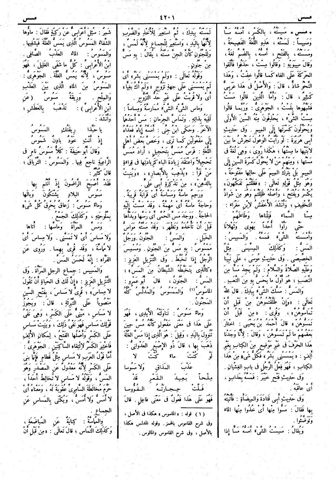 ( * قوله « الماسوس » هكذا في الأصل وفي شرح القاموس بالهمز وقوله المدلس هكذا بالأصل وفي شرح القاموس والمالوس ) والمَمْسُوس والمُدَلَّسُ كله المجنون وماءٌ مَسُوسٌ تََناولته الأَيدي فهو على هذا في معنى مفعول كأَنه مُسَّ حين تُنُووِل باليد وقيل هو الذي إِذا مَسَّ الغُلَّة ذَهَبَ بها قال ذو الإِصْبَع العَدْواني لوْ كُنْتَ ماءً كُنْتَ لا عَذْبَ المَذاقِ ولا مَسُوسا مِلْحاً بعِيدَ القَعْرِ قَدْ فَلَّتْ حِجارَتُهُ الفُؤُوسا فهو على هذا فعول في معنى فاعل قال شمر سئل أَعرابي عن رَكِيَّةٍ فقال ماؤها الشِّفاء المَسُوسُ الذي يَمسُّ الغُلَّة فيَشْفِيها والمَسُوس الماء العذب الصافي ابن الأَعرابي كل ما شفى الغَلِيلَ فهو مَسُوسٌ لأَنه يَمُسُّ الغُلَّةَ الجوهري المَسُوس من الماء الذي بين العذْبِ والمِلح وريقة مَسُوسٌ عن ابن الأَعرابي تذهب بالعطش وأَنشد يا حَبَّذا رِيقَتُكِ المَسُوسُ إِذْ أَنْتِ خَوْدٌ بادِنٌ شَمُوسُ وقال أَبو حنيفة كَلأ مسوسٌ نامٍ في الراعية ناجعٌ فيها والمَسُوسُ التِّرْياقُ قال كثيِّر فقَدْ أَصْبَحَ الرَّاضُونَ إِذ أَنْتُمُ بها مَسُوسُ البِلادِ يَشْتَكُونَ وبالَها وماء مَسُوسٌ زُعاقٌ يُحْرِق كل شيء بمُلوحته وكذلك الجمع ومَسَّ المرأَة وماسَّها أَتاها ولا مَساسَ أَي لا تَمَسَّني ولا مِساس أَي لا مُماسَّة وقد قرئ بهما وروي عن الفراء إِنه لَحَسَنُ المَسّ والمَسِيس جماع الرجلِ المرأَةَ وفي التنزيل العزيز إِنَّ لَك في الحَياةِ أَن تَقُولَ لا مِساس قرئ لا مَساسَ بفتح السين منصوباً على التَّبْرِئَة قال ويجوز لا مَساسِ مبني على الكسر وهي نفي قولك مَساسِ فهو نفي ذلك وبنيت مَساسِ