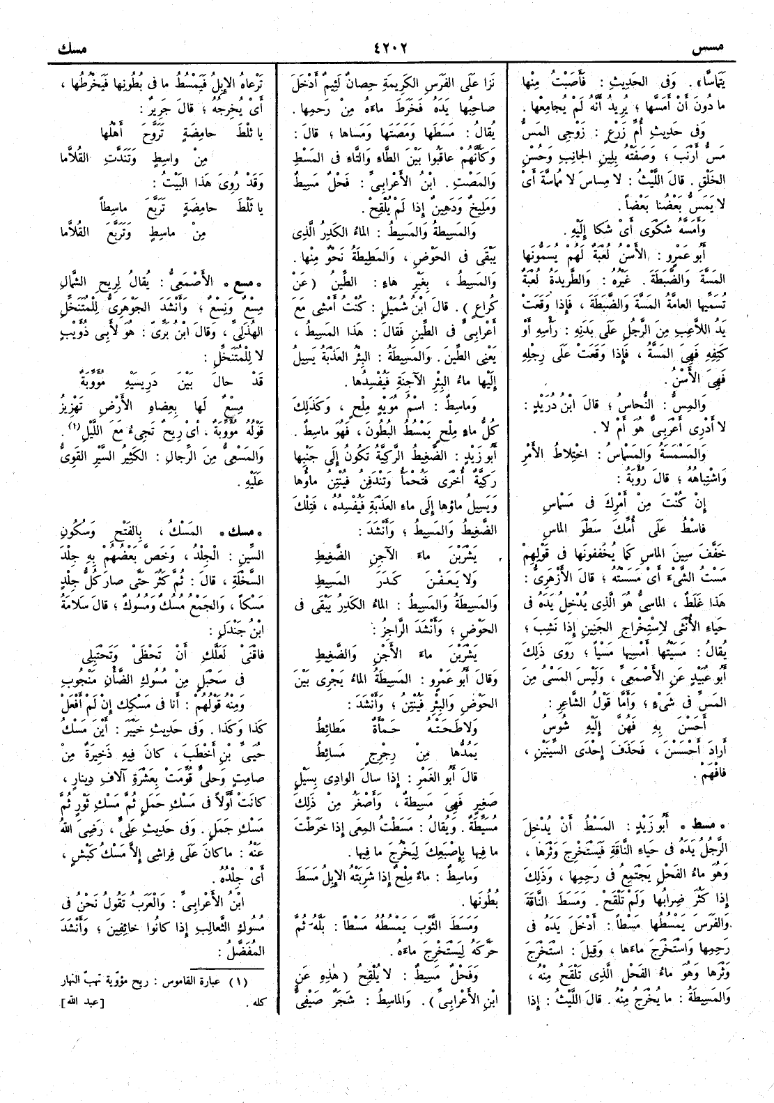 ( مسع ) الأَصمعي يقال لريح الشَّمالِ مِسْعٌ ونِسْعٌ وأَنشد الجوهري للمُتَنَخِّل الهُذَلي وقال ابن بري هو لأَبي ذؤيب لا للمتنخل قد حالَ بَيْنَ دَرِيسَيْه مُؤَوِّبةٌ مِسْعٌ لها عِضاهِ الأَرضِ تَهْزِيزُ قوله مُؤَوِّبةٌ أَي ريحٌ تجيءُ مع الليل والمَسْعِيُّ من الرجال الكثير السيْرِ القويُّ عليه( مسك ) المَسْكُ بالفتح وسكون السين الجلد وخَصَّ بعضهم به جلد السَّخْلة قال ثم كثر حتى صار كل جلد مَسْكاً والجمع مُسُكٌ ومُسُوك قال سلامة بن جَنْدل فاقْنَيْ لعلَّكِ أن تَحْظَيْ وتَحْتَبِلي في سَحْبَلٍ من مُسُوك الضأْن مَنْجُوب ومنه قولهم أنا في مَسْكِك إن لم أفعل كذا وكذا وفي حديث خيبر أَين مَسْكُ حُيَيِّ بن أَخْطَب كان فيه ذخيرة من صامِتٍ وحُليّ قُوِّمت بعشرة آلاف دينار كانت أَوَّلاً في مَسْك جَمَل ثم مَسْك ثور ثم مَسْك جَمَل وفي حديث علي رضي الله عنه ما كان على فِراشي إلاّ مَسْكُ كَبْشٍ أي جلده ابن الأعرابي والعرب تقول نحن في مُسُوك الثعالب إذا كانوا خائفين وأنشد المُفَضَّل