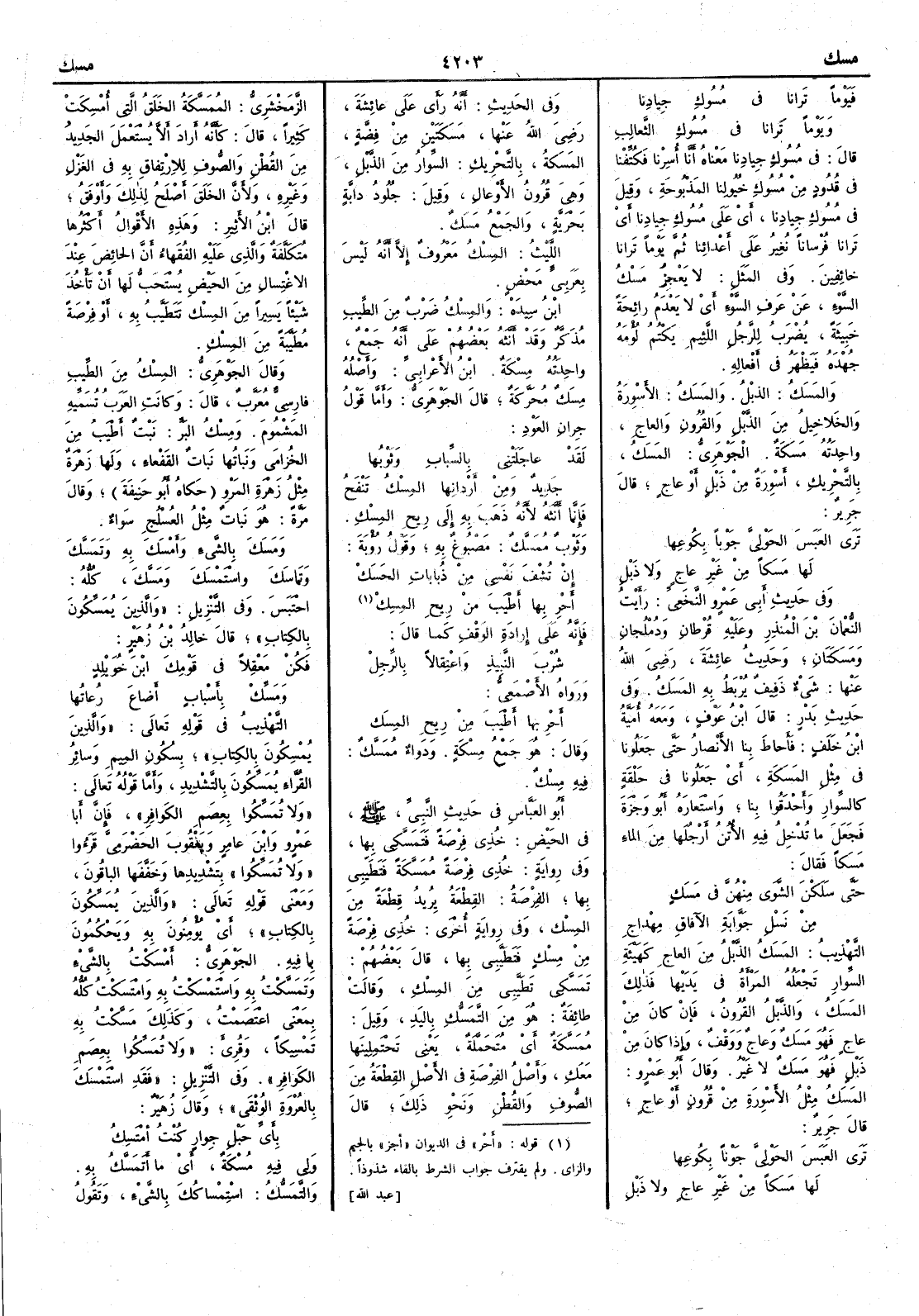 فيوماً تَرانا في مُسُوك جِيادنا ويوماً تَرانا في مُسُوك الثعالِبِ قال في مسوك جيادنا معناه أنَّا أُسِرْنا فكُتِّفْنا في قُدودٍ من مُسُوك خيولنا المذبوحة وقيل في مُسُوك أي على مسوك جيادنا أي ترانا فرساناً نُغِير على أَعدائنا ثم يوماً ترانا خائفين وفي المثل لا يَعْجِزُ مَسْكُ السَّوْءِ عن عَرْفِ السَّوْءِ أي لا يَعْدَم رائحة خبيثة يضرب للرجل اللئيم يكتم لؤمه جُهْدَه فيظهر في أفعاله والمَسَكُ الذَّبْلُ والمَسَكُ الأَسْوِرَة والخلاخيل من الذَّبْلِ والقرون والعاج واحدته مَسَكة الجوهري المَسَك بالتحريك أَسْوِرة من ذَبْلٍ أو عاج قال جرير تَرَى العَبَسَ الحَوْليَّ جَوْباً بكُوعِها لها مسَكاً من غير عاجٍ ولا ذَبْلِ وفي حديث أبي عمرو النَّخَعيّ رأَيت النعمان بن المنذر وعليه قُرْطان ودُمْلُجانِ ومَسَكتَان وحديث عائشة رضي الله عنها شيء ذَفِيفٌ يُرْبَطُ به المَسَكُ وفي حديث بدر قال ابن عوف ومعه أُمية بن خلف فأحاط بنا الأنصار حتى جعلونا في مثل المَسَكَةِ أي جعلونا في حَلْقةٍ كالسِّوارِ وأحدقوا بنا واستعاره أَبو وَجْزَة فجعل ما تُدخِلُ فيه الأُتُنُ أَرجلَها من الماء مَسَكاً فقال حتى سَلَكْنَ الشَّوى منهنَّ في مَسَكٍ من نَسْلِ جدَّابةِ الآفاقِ مِهْداجِ التهذيب المَسَكُ الذَّبْلُ من العاج كهيئة السِّوار تجعله المرأَة في يديها فذلك المَسَكُ والذَّبْلُ القُرون فإن كان من عاج فهو مَسَك وعاج ووَقْفٌ وإذا كان من ذَبْلٍ فهو مَسَكٌ لا غير وقال أَبو عمرو المَسَكُ مثل الأَسْوِرة من قُرون أو عاج قال جرير ترى العبس الحوليّ جوناً بكوعها لها مسكاً من غير عاج ولا ذبل وفي الحديث أنه رأى على عائشة رضي الله عنها مَسَكَتَيْن من فضة المَسَكةُ بالتحريك الوسار من الذَّبْلِ وهي قُرون الأَوْعال وقيل جلود دابة بحرية والجمع مَسَكٌ الليث المِسْكُ معروف إلا أَنه ليس بعربي محض ابن سيده والمِسْكُ ضرب من الطيب مذكر وقد أَنثه بعضهم على أنه جمع واحدته مِسْكة ابن الأعرابي وأصله مِسَكٌ محرّكة قال الجوهري وأما قول جِرانِ العَوْدِ لقد عاجَلَتْني بالسِّبابِ وثوبُها جديدٌ ومن أَرْدانها المِسْكُ تَنْفَحُ فإنما أَنثه لأنه ذهب به إلى ريح المسك وثوب مُمَسَّك مصبوغ به وقول رؤبة إن تُشْفَ نَفْسي من ذُباباتِ الحَسَكْ أَحْرِ بها أَطْيَبَ من ريحِ المِسِكْ فإنه على إرادة الوقف كما قال شُرْبَ النبيذ واعْتِقالاً بالرِّجِلْ ورواه الأصمعي أَحْرِ بها أَطيب من ريح المِسَك وقال هو جمع مِسْكة ودواء مُمَسَّك فيه مِسك أَبو العباس في حديث النبي صلى الله عليه وسلم في الحيض خُذِي فِرْصةً فَتَمَسَّكي بها وفي رواية خذي فَرِصَة مُمَسّكة فَتَطَيَّبي بها الفِرصَةُ القِطْعة يريد قطعة من المسك وفي رواية أُخرى خذي فِرْصَةً من مِسْكٍ فتطيبي بها قال بعضهم تَمَسَّكي تَطَيَّبي من المِسْك وقالت طائفة هو من التَّمَسُّك باليد وقيل مُمَسَّكة أي مُتَحَمَّلة يعني تحتملينها معك وأَصل الفِرْصة في الأصل القطعة من الصوف والقطن ونحو ذلك قال الزمخشري المُمَسَّكة الخَلَقُ التي اُمْسِكَتْ كثيراً قال كأنه أراد أن لا يستعمل الجديد من القطن والصوف للارْتِفاق به في الغزل وغيره ولأن الخَلَقَ أصلح لذلك وأَوفق قال ابن الأثير وهذه الأقوال أكثرها مُتَكَلَّفَة والذي عليه الفقهاء أنا الحائض عند الاغتسال من الحيض يستحب لها أن تأْخذ شيئاً يسيراً من المِسْك تتطيب به أو فِرصةً مطيَّبة من المسك وقال الجوهري المِسْك من الطيب فارسي معرب قال وكانت العرب تسميه المَشْمُومَ ومِسْكُ البَرِّ نبت أطيب من الخُزامى ونباتها نبات القَفْعاء ولها زَهْرة مثل زهرة المَرْوِ حكاه أَبو حنيفة وقال مرة هو نبات مثل العُسْلُج سواء ومَسَكَ بالشيءِ وأَمْسَكَ به وتَمَسَّكَ وتَماسك واسْتمسك ومَسَّك كُلُّه احْتَبَس وفي التنزيل والذي يُمَسِّكون بالكتاب قال خالد بن زهير فكُنْ مَعْقِلاً في قَوْمِكَ ابنَ خُوَيْلدٍ ومَسِّكْ بأَسْبابٍ أَضاعَ رُعاتُها التهذيب ف