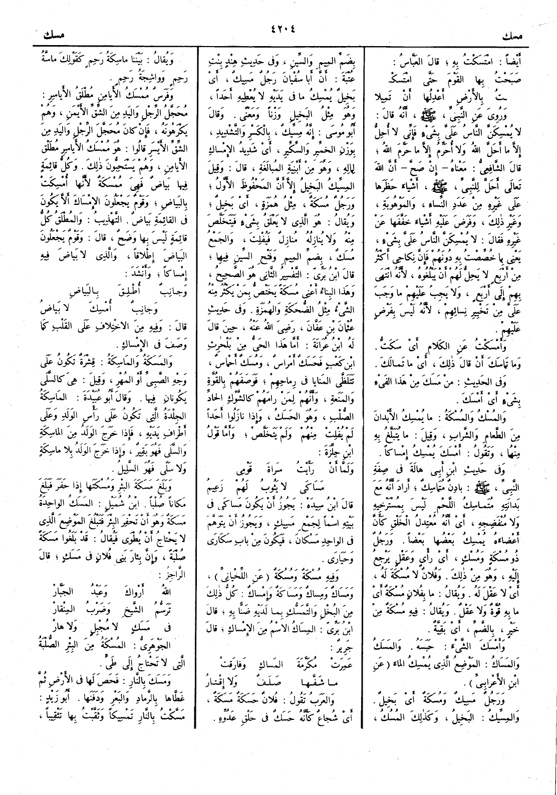 أَيضاً امْتَسَكْت به قال العباس صَبَحْتُ بها القومَ حتى امْتَسكْ تُ بالأرْضِ أَعْدِلُها أَن تَمِيلا وروي عن النبي صلى الله عليه وسلم أنه قال لا يُمْسِكَنَّ الناسُ عليَّ بشيءِ فإني لا أُحِلُّ إلا ما أَحَلَّ الله ولا أُحرِّم إلاّ ما حَرَّم الله قال الشافعي معناه إن صحَّ أنَّ الله تعالى أَحل للنبي صلى الله عليه وسلم أَشياء حَظَرَها على غيره من عدد النساء والموهوبة وغير ذلك وفرض عليه أَشياء خففها عن غيره فقال لا يُمْسِكَنَّ الناسُ عليَّ بشيء يعني بما خصِّصْتُ به دونهم فإن نكاحي أَكثر من أَربع لا يحل لهم أَن يبلغوه لأنه انتهى بهم إلى أَربع ولا يجب عليهم ما وجب عليَّ من تخيير نسائهم لأنه ليس بفرض عليهم وأَمْسَكْتُ عن الكلام أي سكت وما تَماسَكَ أن قال ذلك أي ما تمالك وفي الحديث من مَسَّك من هذا الفَيْءِ بشيءٍ أي أَمسَك والمُسْكُ والمُسْكةُ ما يُمْسِكُ الأبدانَ من الطعام والشراب وقيل ما يتبلغ به منهما وتقول أَمْسَك يُمْسِكُ إمْساكاً وفي حديث ابن أَبي هالَة في صفة النبي صلى الله عليه وسلم بادنٌ مُتَماسك أراد أَنه مع بدانته مُتَماسك اللحم ليس بمسترخيه ولا مُنْفَضِجه أي أنه معتدل الخلق كأَن أعضاءَه يُمْسِك بعضها بعضاً ورجل ذو مُسْكةٍ ومُسْكٍ أي رأْي وعقل يرجع إليه وهو من ذلك وفلان لا مِسُكة له أي لا عقل له ويقال ما بفلان مُسْكة أي ما به قوَّة ولا عقل ويقال فيه مُسْكَةٌ من خير بالضم أي بقية وأَمْسَكَ الشيءَ حبسه والمَسَكُ والمَسَاكُ الموضع الذي يُمْسِك الماءَ عن ابن الأعرابي ورجل مَسِيكٌ ومُسَكَةٌ أي بخيل والمِسِّيك البخيل وكذلك المُسُك بضم الميم والسين وفي حديث هند بنت عُتْبة أن أَبا سفيان رجل مَسِيكٌ أي بخيل يُمْسِكُ ما في يديه لا يعطيه أَحداً وهو مثل البخيل وزناً ومعنى وقال أَبو موسى إنه مِسِّيكٌ بالكسر والتشديد بوزن الخِمَّير والسِّكِّير أي شديد الإمْساك لماله وهو من أَبنية المبالغة قال وقيل المِسِّيك البخيل إلاَّ أن المحفوظ الأول ورجل مُسَكَةٌ مثل هُمَزَة أي بخيل ويقال هو الذي لا يَعْلَقُ بشيء فيتخلص منه ولا يُنازِله مُنازِلٌ فيُفْلِتَ والجمع مُسَكٌ بضم الميم وفتح السين فيهما قال ابن بري التفسير الثاني هو الصحيح وهذا البناء أعني مُسَكة يختص بمن يكثر منه الشيء مثل الضُّحكة والهُمَزَة وفي حديث عثمان بن عفان رضي الله عنه حين قال له ابن عُرَانَةَ أَما هذا الحَيُّ من بَلْحرث بن كعب فَحَسَكٌ أَمْراسٌ ومُسَكٌ أَحْماس تَتَلَظَّى المَنايا في رِماحِهِم فوصفهم بالقوَّة والمَنَعةِ وأَنهم لِمَنْ رامهم كالشوك الحادِّ الصُّلْب وهو الحَسَك وإذا نازَلوا أَحداً لم يُفْلِتْ منهم ولم يتخلص وأما قول ابن حِلِّزة ولما أَن رأَيتُ سَراةَ قَوْمِي مَسَاكَى لا يَثُوبُ لهم زَعِيمُ قال ابن سيده يجوز أَن يكون مساكى في بيته اسماً لجمع مَسِيك ويجوز أن يتوهم في الواحد مَسْكان فيكون من باب سَكَارَى وحَيَارَى وفيه مُسْكةٌ ومُسُكةٌ عن اللحياني ومَسَاكٌ ومِساك ومَسَاكة وإمْساك كل ذلك من البخل والتَّمَسُّكِ بما لديه ضَنّاً به قال ابن بري المِسَاك الاسم من الإمْساك قال جرير عَمِرَتْ مُكَرَّمةَ المَساكِ وفارَقَتْ ما شَفَّها صَلَفٌ ولا إقْتارُ والعرب تقول فلان حَسَكة مَسَكة أي شجاع كأَنه حَسَكٌ في حَلْق عدوِّه ويقال بيننا ماسِكة رحِم كقولك ماسَّة رحم وواشِجَة رحم وفرس مُمْسَك الأَيامِن مُطْلَقُ الأياسر مُحَجَّلُ الرجل واليد من الشِّقِّ الأيمن وهم يكرهونه فإن كان مُحَجَّل الرجل واليد من الشِّقِّ الأيسر قالوا هو مُمْسَكُ الأياسر مُطْلَق الأيامن وهم يستحبون ذلك وكل قائمة فيها بياض فهي مُمْسَكة لأنها أُمسِكت بالبياض وقوم يجعلون الإمْسَاك أن لا يكون في القائمة بياض التهذيب والمُطْلَق كل قائمة ليس بها وَضَحٌ قال وقوم يجعلون البياض إطلاقاً والذي لا بياض فيه إمساكاً وأَنشد وجانب أُطْلِقَ بالبَياضِ وجانب أُمْسك لا بَياض وقال وفيه من الاختلاف على القلب كما وصف في الإمْساك والمَسَك