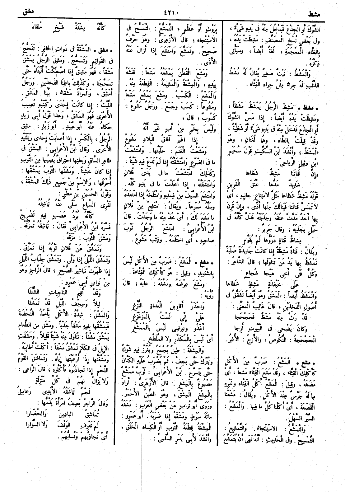 ( مشظ ) مَشِظَ الرجلُ يَمْشَظُ مَشَظاً ومَشِظَتْ يَدُه أَيضاً إِذا مَسَّ الشوْكَ أَو الجِذْعَ فدخل منه في يده شيء أَو شَظِيّةٌ وقد قِيلت بالطاء وهما لغتان وهو المَشَظُ وأَنشد ابن السكِّيت قول سُحَيم بن وُثَيْلٍ الرياحي وإِنَّ قَناتَنا مَشِظٌ شَظاها شَدِيدٌ مَدُّها عُنُقَ القَرِينِ قوله مَشِظٌ شَظاها مَثل لامْتِناع جانِبه أَي لا تَمَسَّ قَناتَنا فيَنالَك منها أَذىً وإِن قُرن بها أَحد مدّت عنُقَه وجَذَبَتْه فذَلَّ كأَنه في حبْل يجْذِبه وقال جرير مِشاظ قَناةٍ درْؤُها لم يُقَوَّمِ ويقال قَناة مَشِظةٌ إِذا كانت جديدة صُلْبة تَمْشَظُ بها يَدُ من تَناوَلها قال الشاعر وكلّ فَتىً أَخِي هَيْجا شُجاعٍ على خَيْفانةٍ مَشِظٍ شَظاها والمَشَظ أَيضاً المَشَقُ وهو أَيضاً تشقُّق في أُصول الفَخِذينِ قال غالب المعنى قد رَثَّ منه مَشَظٌ فَحَجْحَجا وكان يَضْحَى في البُيوتِ أَزِجا الحَجْحَجةُ النُّكوص والأَزِجُ الأَشِرُ ( مشع ) المَشْعُ ضرْبٌ من الأَكل كأَكلِكَ القِثّاء وقد مَشَعَ القِثّاءَ مَشْعاً أَي مَضَغَه وقيل المَشْعُ أَكلُ القِثّاء وغيره مما له جَرْسٌ عند الأَكل ويقال مَشَعْنا القَصْعةَ أَي أَكلنا كلّ ما فيها والمَشْعُ السير السهل والتمشُّعُ الاستنجاءُ والتمْشِيعُ التمْسِيح وفي الحديث أَنه نهى أَن يُتَمَشَّعَ برَوْثٍ أَو عَظْمٍ التمشُّعُ التمسُّحُ في الاستنجاء قال الأَزهري وهو حرف صحيح وتَمَشَّعَ وامْتَشَعَ إِذا أَزال عنه الأَذى ومَشَعَ القُطْنَ يَمْشَعُه مَشْعاً نَفَشَه بيده والمِشْعةُ والمَشِيعةُ القِطْعةُ منه والمَشْعُ الكَسَبُ ومَشَعَ يَمْشَعُ مَشْعاً ومُشُوعاً كَسَبَ وجَمَع ورجل مَشُوعٌ كَسُوبٌ قال وليس بخَيْرٍ من أَبٍ غيرَ أَنه إِذا اغْبَرّ آفاقُ البلادِ مَشُوعُ ومَشَعْتُ الغنَمَ حَلَبْتُها وامْتَشَعْتُ ما في الضّرْعِ وامْتَشَقْتُه إِذا لم تدَع فيه شيئاً وكذلك امْتَشَعْتُ ما في يَدَيْ فلان وامْتَشَقْته إِذا أَخذت ما في يده كله وامتشع السفَ من غِمْدِه وامْتَلَخه إِذا امْتَعَدَه وسلَّه مُسْرِعاً ويقال امْتَشِعْ من فلان ما مَشَعَ لك أَي خُذْ منه ما وجدْت قال ابن الأَعرابي امْتَشَعَ الرجل ثوب صاحبه أَي اخْتَلَسَه وذنبٌ مَشُوعٌ ( مشغ ) المَشْغُ ضَرْب من الأَكل ليس بالشديد وقيل هو كأَكْلِكَ القِثَّاءَة ومَشَغَ عِرْضَه ومَشَّغَه عابَه قال رؤبة واحْذَرْ أَقاوِيلَ العُداةِ النُّزَّغِ عَليَّ إني لَسْتُ بالمُزَغْزَغِ أَغْدُو وعِرْضِي ليسَ بالمُمَشَّغِ أَي ليس بالمُكَدَّرِ ولا المُلَطَّخ والمِشْغةُ طين يُجْمَعُ ويُغْرَزُ فيه شوْكٌ ويُترك حتى يَجِفَّ ثم يُضْرَب عليه الكَتّانُ حتى يَتَسرَّح ابن الأَعرابي ثوب ممَشَّغٌ مَصْبوغ بالمِشْغ قال الأَزهري أَراد بالمِشْغِ المِشْقَ وهو الطين الأَحمر وروى أَبو تراب عن بعض العرب مَشْغَه مائةَ سَوْطٍ ومَشَقَه إِذا ضربه أَبو عمرو المِشْغة قِطعة الثوب أَو الكساء الخَلَق وأَنشد لأَبي بدر السلمي كأَنَّه مِشْغةُ شَيْخ مُلْقاهْ( مشق ) المشقة في ذوات الحافر تَفَحُّجٌ في القوائم وتشَحُّج ومَشِقَ الرجلُ يَمْشَقُ مَشَقاً فهو مَشِقٌ إذا اصطَكَّت أَلْيتاه حتى تشَحَّجتا وكذلك باطنا الفخذين ورجل أَمْشَقُ والمرأة مَشْقاءُ بيِّنا المَشَقِ الليث إذا كانت إحدى ركبتيه تصيب الأُخرى فهو المَشَق وهذا قول أَبي زيد حكاه عنه أَبو عبيد أَبو زيد مَشِقَ الرجل بالكسر إذا أَصابت إحدى ربَلتَيْه الأُخرى وقال ابن الأَعرابي المَشْقُ في ظاهر الساق وباطنها احْتِراقٌ يصبيها من الثوبِ إذا كان خشناً ومَشَقَها الثوب يَمْشُقُها أَحرقها والاسم من جميع ذلك المُشْقة وقول الحسين بن مطير تَفْرِي السِّباعُ سَلىً عنه تُماشِقُهُ كأَنه بُرْدُ عَصْبٍ فيه تَضْرِيجُ فسره ابن الأَعرابي فقال تُماشِقُه تُمزِّقه ومَشَقَ الثوبَ مَزَقه وتَمَشَّق عن فلان ثوبُه إذا تمزق وتَمَشَّقَ الليل إذا وَلَّى وتَمَشَّق جِلْبَابُ الليل إذا ظهرت تعباشير