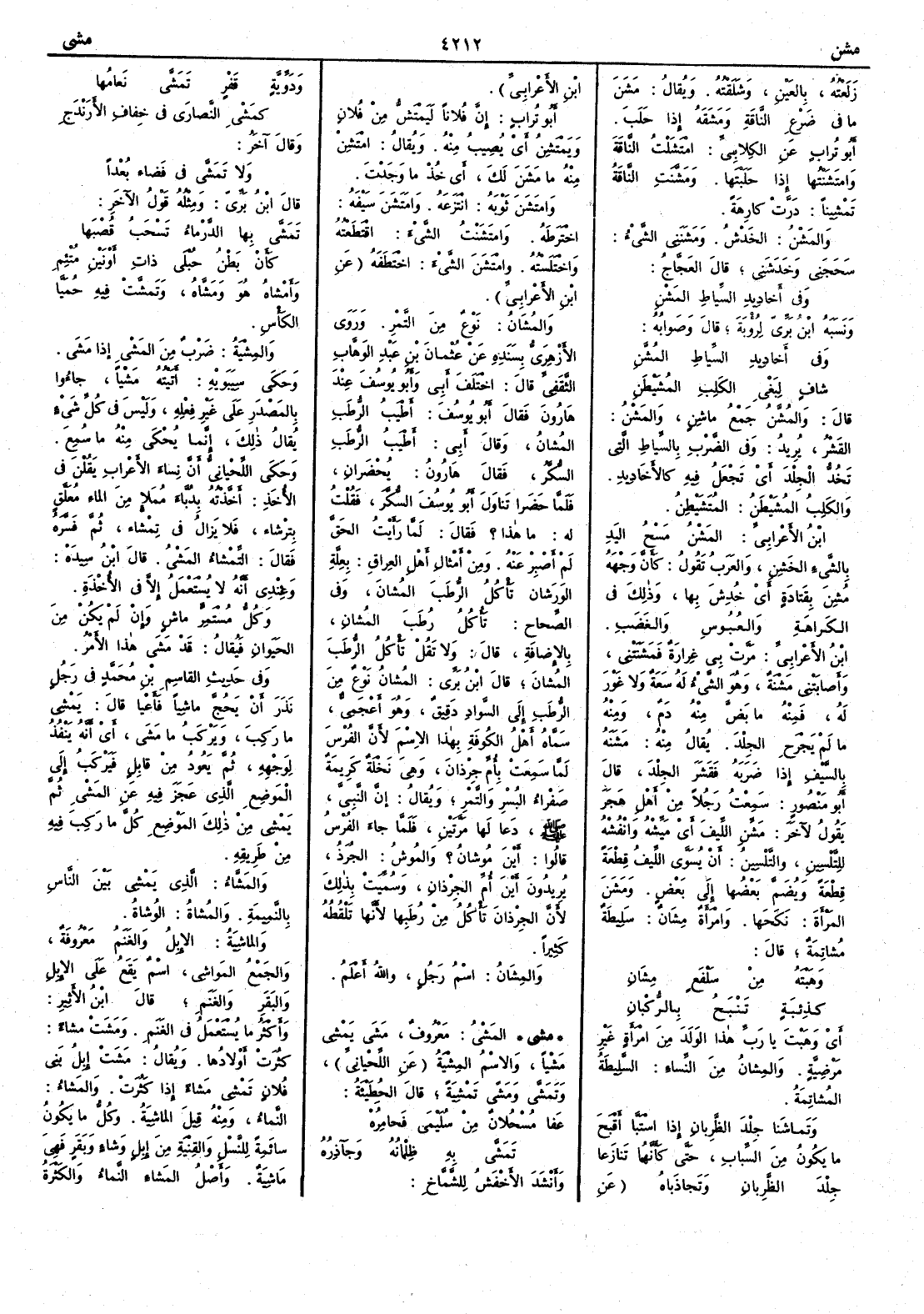 ( مشي ) المَشي معروف مَشى يَمْشي مَشْياً والاسم المِشْية عن اللحياني وتَمَشَّى ومَشَى تَمْشِيةً قال الحطيئة عَفا مُسْحُلانٌ من سُلَيْمى فحامِرُهْ تَمَشَّى به ظِلْمانُه وجَآذِرُهْ وأَنشد الأَخفش للشماخ ودَوِّيَّةٍ قَفْرٍ تَمَشَّى نَعامُها كمَشْيِ النَّصارى في خِفافِ الأَرَنْدَجِ وقال آخر ولا تَمَشَّى في فضاءٍ بُعْداً قال ابن بري ومثله قول الآخر تَمَشَّى بها الدَّرْماءُ تَسْحَبُ قُصْبَها كأَنْ بَطْنُ حُبْلى ذاتِ أَوْنَين مُتْئِمِ وأَمْشاهُ هو ومَشَّاهُ وتَمشَّتْ فيه حُمَيَّا الكأْس والمِشْيةُ ضَرْب من المَشْي إِذا مَشى وحكى سيبويه أَتيته مَشْياً جاؤوا بالمصدر على غير فِعْله وليس في كل شيءٍ يقال ذلك إِنما يحكى منه ما سُمع وحكى اللحياني أَن نساءَ الأَعراب يقلن في الأُخَذ أَخَّذْته بدُبَّاءِ مُمَلإٍ من الماءِ مُعَلَّقٍ بتِرْشاءٍ فلا يزال في تِمْشاءٍ ثم فسره فقال التِّمْشاءُ المَشي قال ابن سيده وعندي أَنه لا يستعمل إِلا في الأُخْذة وكل مستمرٍّ ماشٍ وإِن لم يكن من الحيوان فيقال قد مشى هذا الأَمر وفي حديث القاسم بن محمد في رجل نَذَرَ أَن يَحُجَّ ماشِياً فأَعْيا قال يَمْشِي ما رَكِب ويركَبُ ما مَشى أَي أَنه يَنْفُذُ لوجهه ثم يعُود من قابل فيركب إِلى الموضع الذي عَجَز فيه عن المَشْي ثم يَمْشي من ذلك الموضع كلَّ ما ركِب فيه من طريقه والمَشَّاءُ الذي يَمْشِي بين الناس بالنَّمِيمة والمُشاةُ الوُشاة والماشِيةُ الإِبل والغنم معروفة والجمع المَواشي اسم يقع على الإِبل والبقر والغنم قال ابن الأَثير وأَكثر ما يستعمل في الغنم ومَشَتْ مَشاء كثُرت أَولادُها ويقال مَشَتْ إِبل بني فلان تَمْشي مشاء إِذا كثرت والمَشاء النَّماء ومنه قيل الماشيةُ وكلُّ ما يكون سائمةً للنسل والقِنْية من إِبل وشاءٍ وبقر فهي ماشِيةٌ وأَصل المَشاء النَّماء والكثرة