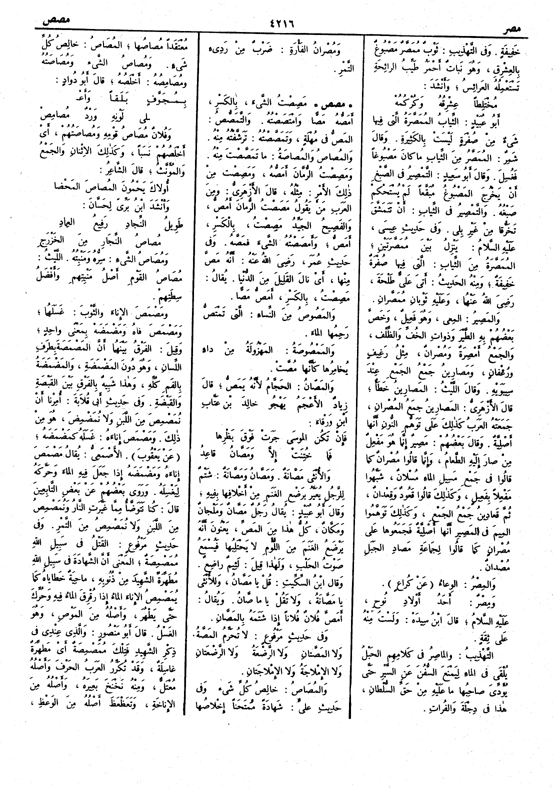 خفيفة وفي التهذيب ثَوْب مُمَصَّرٌ مصبوغ بالعِشْرِقِ وهو نبات أَحْمَرُ طيِّبُ الرائِحَةِ تستعمله العرائس وأَنشد مُخْتلِطاً عِشْرِقُه وكُرْكُمُهْ أَبو عبيد الثياب المُمَصَّرَةُ التي فيها شيء من صفرة ليست بالكثيرة وقال شمر المُمَصَّرُ من الثياب ما كان مصبوغاً فغسل وقال أَبو سعيد التَّمْصِيرُ في الصَّبْغِ أَن يخرج المَصْبُوغُ مُبَقَّعاً لم يُسْتَحْكْم صَبْغُه والتمصير في الثياب أَن تَتَمَشَّقَ تَخَرُّقاً من غيرِ بلى وفي حديث عيسى عليه السلام ينزل بين مُمَصَّرَتَيْن المُمَصَّرَةُ من الثياب التي فيها صُفْرة خفيفة ومنه الحديث أَتى عليٌّ طَلْحَةَ رضي الله عنهما وعليه ثَوْبانِ مُمَصَّرانِ والمَصِيرُ المِعى وهو فَعِيلٌ وخص بعضُهم به الطيرَ وذواتِ الخُفِّ والظِّلْف والجمع أَمْصِرَة ومُصْرانٌ مثل رَغِيفٍ ورُغْفانٍ ومَصارِينُ جمع الجمع عند سيبويه وقال الليث المَصارِينُ خطأٌ قال الأَزهري المصارين جمع المُصْران جمعته العرب كذلك على توهُّم النونِ أَنها أَصلية وقال بعضهم مَصِير إِنما هو مَفْعِلٌ من صار إِليه الطعام وإِنما قالوا مُصران كما قالوا في جمع مَسِيل الماء مُسْلان شبهوا مَفْعِلاً بفَعِيل وكذلك قالوا قَعود وقِعْدانٌ ثم قَعادِينُ جمع الجمع وكذلك توهموا الميم في المصير أَنها أَصلية فجمعوها على مُصْران كما قالوا لجماعة مَصادِ الجَبَل مُصْدانٌ والمِصْرُ الوعاء عن كراع ومِصْرٌ أَحدُ أَولاد نوح عليه السلام قال ابن سيده ولست منه على ثقة التهذيب والماصِرُ في كلامهم الحَبْل يلقى في الماءِ لِيَمْنَعَ السفُنَ عن السير حتى يُؤدِّيَ صاحبُها ما عليه من حق السلطان هذا في دجلة والفرات ومُصْرانُ الفارةِ ضرب من رديءِ التمر