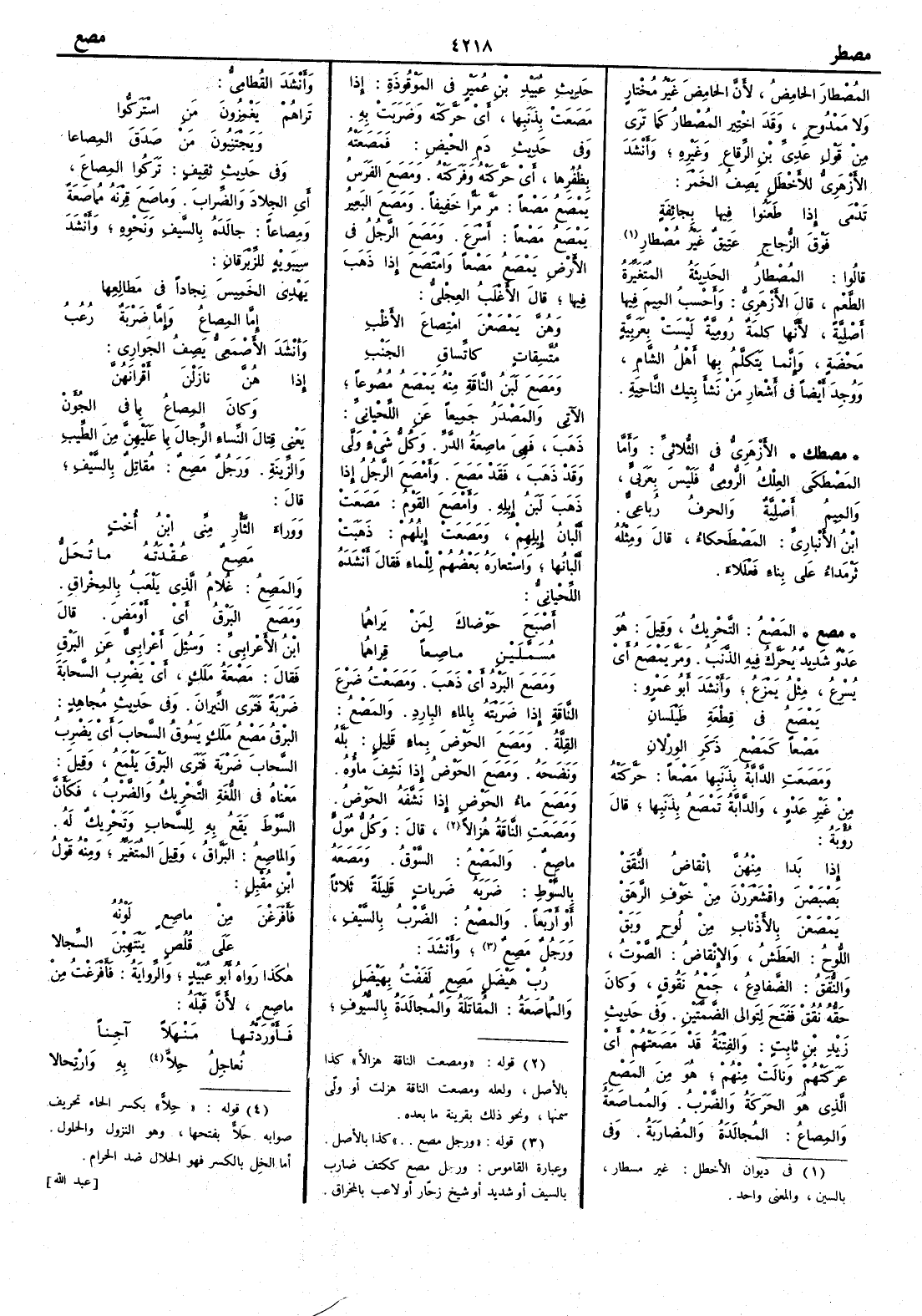 ( مصطك ) الأزهري في الثلاثي وأما المَصْطَكا العِلْكُ الرومي فليس بعربي والميم أَصلية والحرف رباعي ابن الأنباري المَصْطَكاءُ قال ومثله ثَرْمَداءُ على بناء فَعْلَلاء( مصع ) المَصْع التحريك وقيل هو عَدْوٌ شديد يحرك فيه الذنب ومرّ يَمْصَعُ أَي يُسْرِعُ مثل يَمْزَعُ وأَنشد أَبو عمرو يَمْصَع في قِطْعةِ طَيْلَسانِ مَصْعاً كَمَصْعِ ذكَرِ الوِرْلانِ ومَصَعَتِ الدابةُ بذَنَبِها مَصْعاً حركته من غير عَدْوٍ والدابة تَمْصَعُ بذنبها قال رؤبة إِذا بَدا مِنْهُنّ إِنْقاضُ النُّقَقْ بَصْبَصْنَ واقْشَعْرَوْنَ من خوْفِ الرَّهَقْ يَمْصَعْنَ بالأَذْنابِ من لُوحٍ وَبَقْ اللوح العطش والإِنْقاض الصوتُ والنُّقَقُ الضَّفادِعُ جمع نَقُوقٍ وكان حقه نُقُقٌ ففتح لتوالي الضمتين وفي حديث زيد بن ثابت والفتنةُ قد مَصَعَتْهم أَي عَرَكَتْهم ونالت منهم هو من المَصْعِ الذي هو الحركة والضرْبُ والمُماصَعةُ والمِصاعُ المُجالدَة والمُضارَبةُ وفي حديث عبيد ابن عمير في الموقوذة إِذا مَصَعَتْ بذَنبها أَي حرّكَتْه وضربَتْ به وفي حديث دم الحيض فَمَصَعَتْه بظُفُرِها أَي حرّكته وفَرَكَتْه ومَصَعَ الفرسُ يَمْصَعُ مَصْعاً مَرَّ مَرًّا خفيفاً ومَصَع البعيرُ يَمْصَعُ مَصْعاً أَسْرَعَ ومَصَعَ الرجُلُ في الأَرض يَمْصَعُ مَصْعاً وامْتَصَعَ إِذا ذهب فيها قال الأَغلب العجلي وهُنَّ يَمْصَعْنَ امْتِصاعَ الأَظْبِ مُتَّسِقاتٍ كاتِّساقِ الجَنْبِ ومَصَعَ لبنُ الناقة منه يَمْصَعُ مُصُوعاً الآتي والمصدر جميعاً عن اللحياني ذهب فهي ماصِعةُ الدَّرِّ وكلّ شيء ولَّى وقد ذهَب فقد مَصَعَ وأَمْصَعَ الرجلُ إِذا ذهَب لبَنُ إِبِلِه وأَمْصَعَ القومُ مَصَعَتْ أَلْبانُ إِبِلِهم ومَصَعَت إِبلهم ذهَبَت أَلبانُها واستعاره بعضهم للماء فقال أَنشده اللحياني أَصْبَحَ حوْضاكَ لِمَنْ يَراهما مُسَمِّلَيْنِ ماصِعاً قِراهُما ومَصَعَ البردُ أَي ذهَب ومَصَعْتُ ضَرْعَ الناقةِ إِذا ضَرَبْتَه بالماءِ البارِدِ والمَصْعُ القِلّةُ ومَصَعَ الحوْضَ بماء قليل بَلَّه ونضحَه ومَصَعَ الحوضُ إِذا نَشِفَ ماؤه ومَصَعَ ماءُ الحوض إِذا نَشَّفَه الحوضُ ومَصَعَت الناقةُ هُزالاً قال وكلُّ مُولٍّ ماصِعٌ والمَصْعُ السوْقُ ومَصَعَه بالسوط ضرَبه ضرَباتٍ قليلةً ثلاثاً أَو أَربعاً والمصْع الضرْبُ بالسيف ورجل مَصِعٌ وأَنشد رُبْ هَيْضَلٍ مَصِعٍ لَفَفْتُ بِهَيْضَلِ والمُماصَعةُ المُقاتَلةُ والمُجالَدة بالسيوف وأَنشد القُطامي تَراهُم يَغْمِزُونَ مَنِ اسْتَرَكُّوا ويَجْتَنِبُونَ مَنْ صَدَقَ المِصاعا وفي حديث ثقِيفٍ تركوا المِصاعَ أَي الجِلادَ والضِّرابَ وماصَعَ قِرْنَه مُماصَعةً ومِصاعاً جالَده بالسيف ونحوه وأَنشد سيبويه للزبرقان يَهْدِي الخَمِيسَ نِجاداً في مَطالِعِها إِمّا المِصاعُ وإِمّا ضَرْبةٌ رُعبُ وأَنشد الأَصمعي يصف الجواري إِذا هُنَّ نازَلْنَ أَقْرانَهُنَّ وكان المِصاع في الجُؤَنْ يعني قتال النساءِ الرجالَ بما عليهن من الطيب والزينة ورجل مَصِعٌ مقاتل بالسيف قال ووراء الثَّأْرِ مِنِّي ابن أُخْتٍ مَصِعٌ عُقْدَتُه ما تُحَلُّ والمَصِعُ الغلامُ الذي يَلْعَب بالمِخْراقِ ومَصَعَ البرْعقُ أَي أَوْمَضَ قال ابن الأَعرابي وسئل أَعرابي عن البرق فقال مَصْعةُ مَلَكٍ أَي يَضْرِبُ السحابةَ ضَرْبةً فَتَرى النِّيرانَ وفي حديث مجاهد البرْقُ مَصْعُ مَلَكٍ يسُوقُ السحابَ أَي يضرب السحاب ضربة فتَرى البرْقَ يَلْمَعُ وقيل معناه في اللغة التحريك والضرب فكأَن السوط يقع به للسحاب وتحريك له والماصِعُ البَرَّاقُ وقيل المُتَغيرُ ومنه قول ابن مقبل فأَفْرَغْنَ من ماصِعٍ لوْنُه على قُلُصٍ يَنْتَهِبْنَ السِّجالا هكذا رواه أَبو عبيد والرواية فأَفْرَغْتُ من ماصِعٍ لأَن قبله فأَوْرَدْتُها مَنْهَلاً آجِناً نُعاجِلُ حِلاًّ به وارْتِحالا