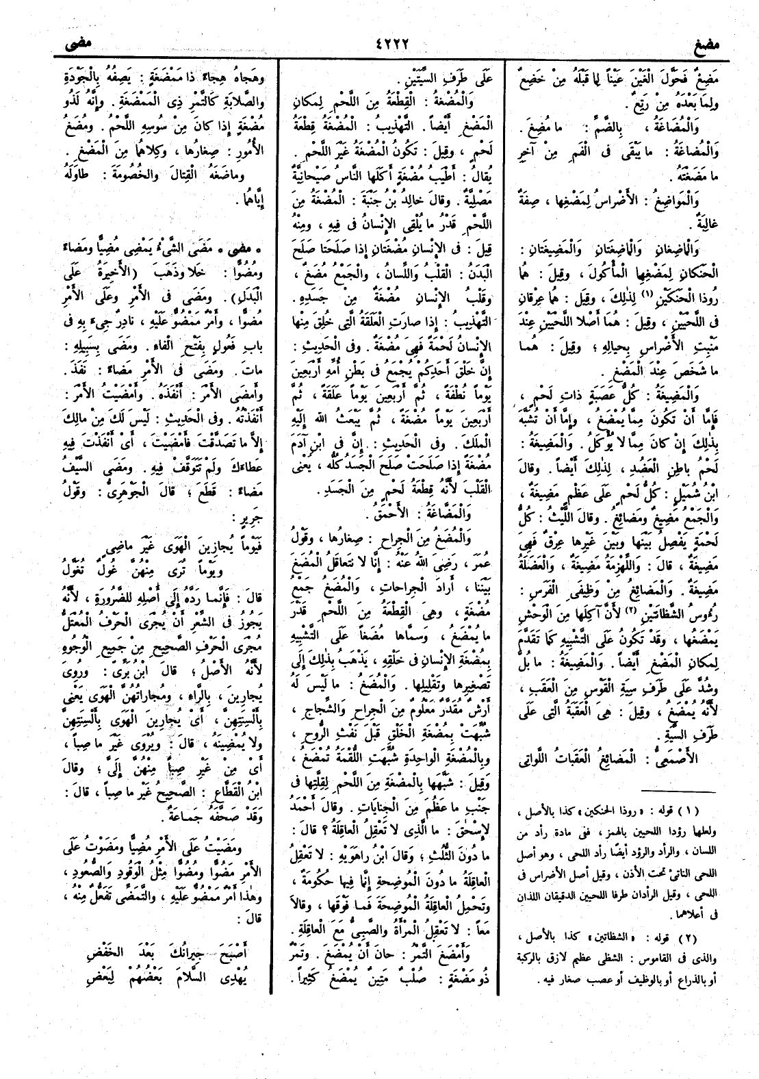 ( * قوله « روذا الحنكين » كذا بالأصل ولعلهما رؤدا اللحيين بالهمز ففي مادة رأد من اللسان والرأد والرؤد أيضاَ رأد اللحي وهو اصل اللحي التاتئ تحت الاذن وقيل أَصل الاضراس في اللحي وقيل الرأدان طرفا اللحيين الدقيقان اللذان في اعلاهما ) لذلك وقيل هما عِرْقان في اللِّحْيَين وقيل هما أَصْلا اللَّحْيَين عند مَنْبِت الأَضراس بِحياله وقيل هما ما شَخَصَ عند المَضْغِ والمَضِيغةُ كل عَصبةٍ ذاتِ لحْم فإِما أَن تكون مما يُمْضَغُ وإِما أَن تشبه بذلك إن كان مما لا يؤكل والمَضِيغَةُ لحم باطِن العَضُد لذلك أَيضاً وقال ابن شميل كل لحم على عظم مَضِيغةٌ والجمع مَضِيغٌ ومَضائِغُ وقال الليث كل لحمَة يَفْصِلُ بينها وبين غيرها عِرْقٌ فهي مَضِيغةٌ قال واللِّهْزِمةُ مَضِيغةٌ والعَضَلةُ مَضِيغة والمَضائِغ من وَظيفَي الفرس رؤوسُ الشّظايتين