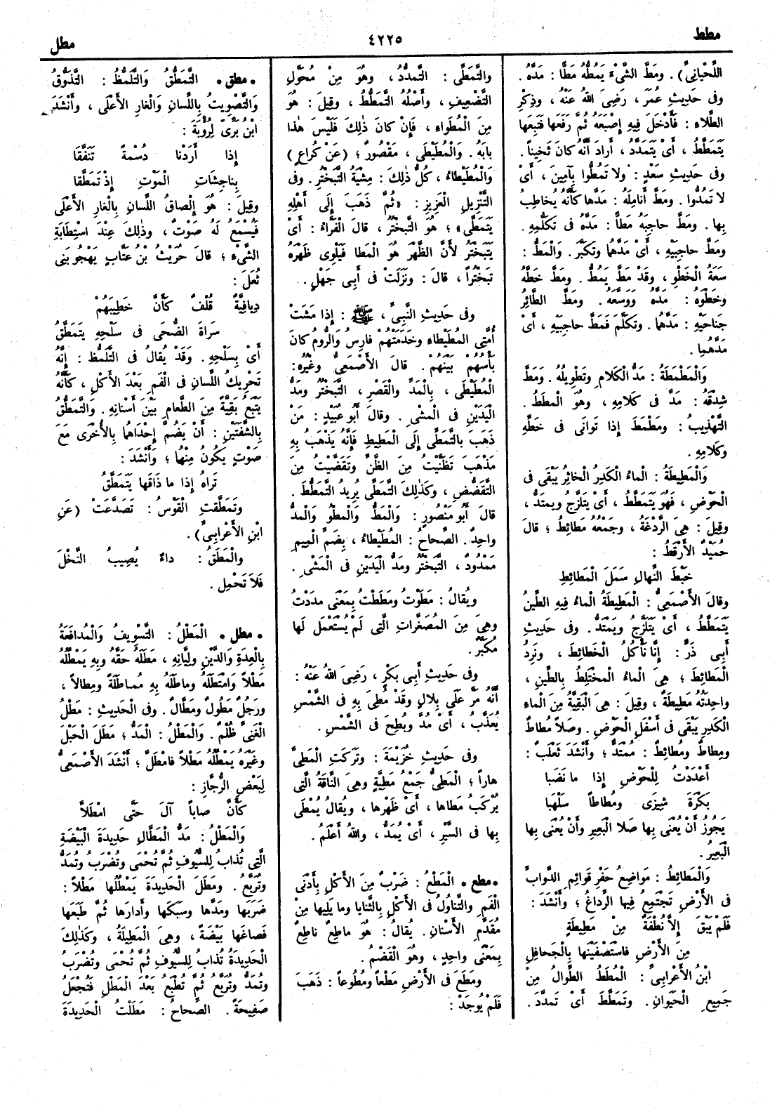 اللحياني ومَطَّ الشيءَ يَمُطُّه مَطّاً مدّه وفي حديث عمر رضي اللّه عنه وذِكْر الطَّلاء فأَدخل فيه إِصبعه ثم رفعها فتَبِعَها يَتَمَطَّطُ أَي يتمدّد أَراد أَنه كان ثخيناً وفي حديث سعد ولا تَمُطُّوا بآمين أَي لا تَمُدُّوا ومَطَّ أَنامله مدّها كأَنه يخاطب بها ومَطَّ حاجبه مطّاً مده في تكلمه ومطَّ حاجبيه أَي مدّهما وتكبَّر والمَطُّ سعة الخَطْوِ وقد مَطَّ يَمُطُّ ومَطَّ خَطَّه وخَطْوه مدّه ووسّعه ومَطَّ الطائرُ جناحيه مَدّهما وتكلم فمطّ حاجبيه أَي مدّهما والمَطْمَطةُ مدّ الكلام وتطويله ومَطَّ شِدقَه مدّ في كلامه وهو المطَطُ التهذيب ومَطْمَطَ إِذا تَوانَى في خَطِّه وكلامه والمَطِيطةُ الماء الكَدِرُ الخاثر يَبقى في الحَوْضِ فهو يَتَمَطَّطُ أَي يتَلزَّج ويمْتَدُّ وقيل هي الرَّدْغةُ وجمعه مطائط قال حميد الأَرقط خبْطَ النِّهالِ سَمَلَ المَطائطِ وقال الأَصمعي المَطِيطة الماء فيه الطين يتمطَّطُ أَي يتلَزّج ويمتدّ وفي حديث أَبي ذر إِنا نأْكل الخَطائط ونَرِد المَطائط هي الماء المختلط بالطين واحدته مَطيطة وقيل هي البقيّة من الماء الكَدِر يبقى في أَسفل الحوض وصَلاً مُطاطٌ ومِطاطٌ ومُطائطٌ مُمتدّ وأَنشد ثعلب أَعْدَدْتُ لِلحَوْضِ إِذا ما نَضَبا بَكْرَةَ شِيزَى ومُطاطاً سَلْهَبا يجوز أَن يُعنى بها صَلا البعير وأَن يعنى بها البعير والمَطائطُ مواضعُ حَفْرِ قَوائمِ الدّوابِّ في الأَرض تجتمع فيها الرِّداغُ وأَنشد فلم يَبْقَ إِلاَّ نُطفةٌ من مَطِيطةٍ مِن الأَرض فاسْتَصْفَيْنَها بالجَحافِل ابن الأَعرابي المُططُ الطّوالُ من جميع الحيوان وتَمطَّطَ أَي تمدَّد والتمطِّي التَّمدُّد وهو من محوّل التضعيف وأَصله التمطط وقيل هو من المُطَواء فإِن كان ذلك فليس هذا بابَه والمُطَيطى مقصور عن كراع والمُطَيْطاء كل ذلك مِشْيةُ التبختر وفي التنزيل العزيز ثم ذهب إِلى أَهله يتَمَطَّى هو التبختر قال الفرَّاء أَي يتبختر لأَن الظهر هو المَطا فيلْوي ظهره تبَخْتُراً قال ونزلت في أَبي جهل وفي حديث النبي صلّى اللّه عليه وسلّم إِذا مشت أُمتي المُطَيْطاء وخدمَتْهم فارِسُ والرُّومُ كان بأْسُهم بينهم قال الأَصمعي وغيره المُطيطى بالمَدِّ والقصر التبختر ومدُّ اليدين في المشي وقال أَبو عبيد من ذهب بالتمطِّي إِلى المَطِيطِ فإِنه يذهب به مذهب تَظَنَّيْت من الظَّنِّ وتَقَضَّيْت من التقَضُّض وكذلك التَّمَطِّي يريد التمطط قال أَبو منصور والمَطُّ والمطْوُ والمدُّ واحد الصحاح المُطَيْطاء بضم الميم ممدود التبختر ومدّ اليدين في المشي ويقال مَطَوْت ومَطَطْت بمعنى مدَدْت وهي من المُصَغّرات التي لم يستعمل لها مُكَبّر وفي حديث أَبي بكر رضي اللّه عنه أَنه مرَّ على بلال وقد مُطِي به في الشمس يُعذَّب أَي مُدَّ وبُطِح في الشمس وفي حديث خُزَيمةَ وتَرَكَتِ المَطِيّ هاراً المَطِيُّ جمع مَطِيّة وهي الناقة التي يُركب مَطاها أَي ظهرها ويقال يُمطى بها في السير أَي يُمدُّ واللّه أَعلم ( مطع ) المَطْعُ ضربٌ من الأَكل بأَدنى الفَمِ والتناوُلُ في الأَكل بالثنايا وما يليها من مُقَدّمِ الأَسنان يقال هو ماطِعٌ ناطِعٌ بمعنى واحد وهو القَضْمُ ومَطَعَ في الأَرض مَطْعاً ومُطُوعاً ذهَب فلم يوجد ( مطق ) التَّمطُّق والتّلَمُّظ التَّذَوُّق والتصويت باللسان والغار الأَعلى وأَنشد ابن بري لرؤبة إذا أَردنا دُسْمةً تَنَفَّقَا بناجِشَاتِ الموتِ إذ تَمَطَّقا وقيل هو إلْصاقُ اللسان بالغَارِِ الأعلى فيسمع له صوت وذلك عند استطابة الشيء قال حُرَيْثُ بن عَتَّاب يهجو بني ثُعَل دِيافِيّةٌ قُلُفٌ كأَنَّ خَطِيبَهُمْ سَراة الضُّحَى في سَلْحِهِ يتَمَطَّقُ أَي بسلحه وقد يقال في التَّلَمُّظ إنه تحريك اللسان في الفم بعد الأكل كأَنه يتبع بقية الطعام بين أسنانه والتَّمَطُّق بالشفتين أن يضم إحداهما بالأُخرى مع صوت يكون منهما وأَنشد تراهُ إذا ما ذَاقَها يَتَمطَّق وتَمَطَّقت القوس تصدعت عن ابن الأَعرابي والمَطَقُ داء يصيب 