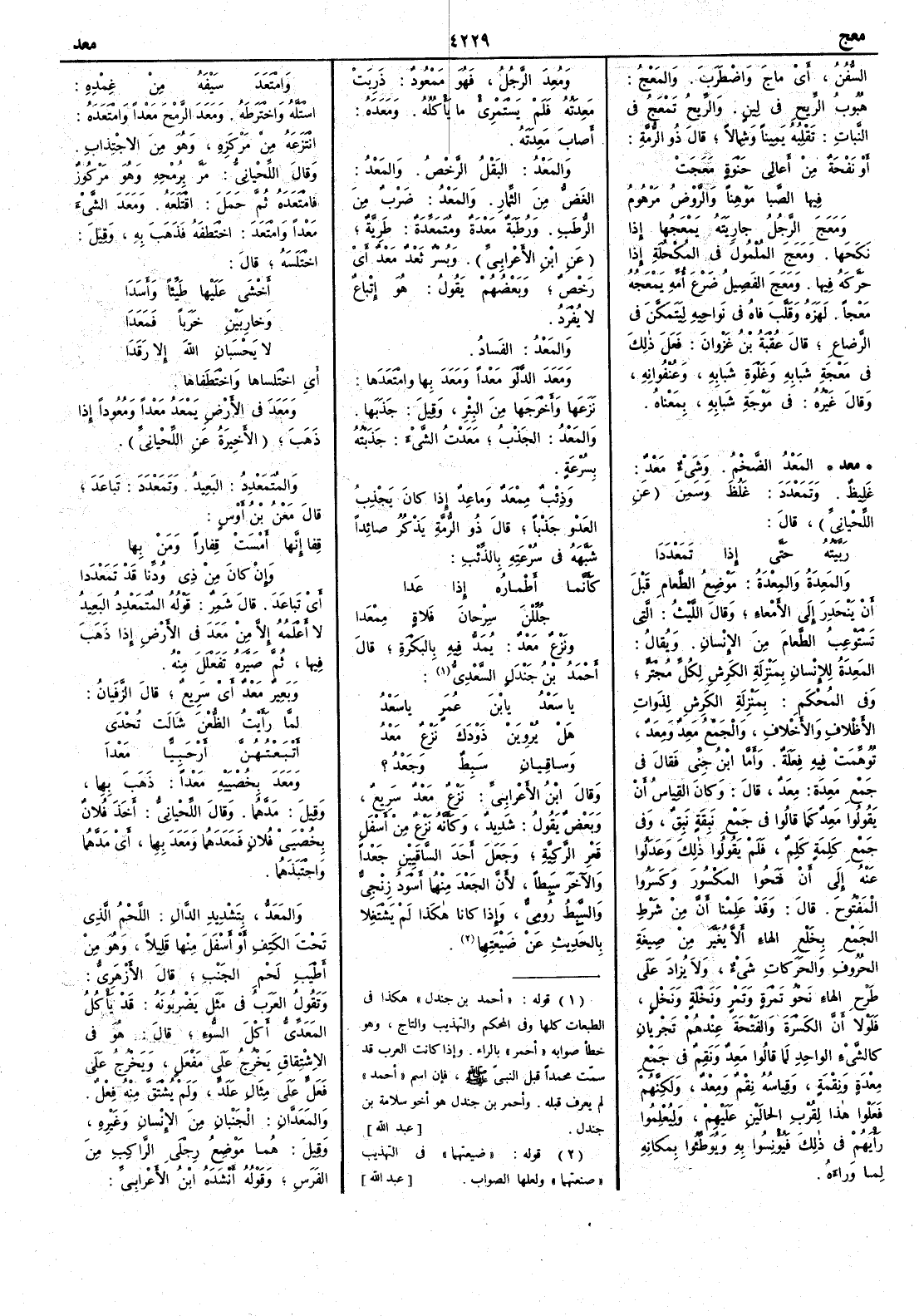 ( معد ) المَعْدُ الضَّخْم وشيء مَعْدٌ غليظ وتَمَعْدَدَ غَلُظ وسَمِن عن اللحياني قال رَبَبْتُه حتى إِذا تمَدَدَا والمَعِدَةُ والمَِعْدَةُ موضع الطعام قبل أَن يَنحدر إِلى الأَمعاء وقال الليث التي تَسْتَوْعِبُ الطعامَ من الإِنسان ويقال المَعِدةُ للإِنسان بمنزلة الكرشة لكل مُجْتَرٍّ وفي المحكم بمنزلة الكرِش لذوات الأَظْلافِ والأَخْلافِ والجمع مَعِدٌ ومِعَدٌ توهمت فيه فِعَلَة وأَما ابن جني فقال في جمع مَعِدَة مِعَدٌ قال وكان القِياس أَن يقولوا مَعِدٌ كما قالوا في جمع نَبِقة نَبِقٌ وفي جمع كلِمةٍ كَلِمٌ فلم يقولوا ذلك وعدلوا عنه إِلى أَن فتحوا المكسور وكسروا المفتوح قال وقد علمنا أَن من شرط الجمع بخلع الهاءِ أَن لا يغير من صيغة الحروف والحركات شيء ولا يزاد على طرح الهاء نحو تمرة وتمر ونخلة ونخل فلولا أَن الكسرة والفتحة عندهم تجريان كالشيء الواحد لما قالوا مَعِدٌ ولكنهم فعلوا هذا لقرب الحالين عليهم ولِيُعْلِموا رأْيهم في ذلك فيؤنسوا به ويوطِّئوا بمكانه لما وراء هومُعِدَ الرجلُ فهو مَمْعودٌ ذَرِبت مَعِدَتُه فلم يَسْتَمْرِئْ ما يأْكله ومَعَدَه أَصاب مَعِدتَه والمَعْدُ ضَرْب من الرُّطَب ورُطَبَة مَعْدَة ومُتَمَعِّدة طرية عن ابن الأَعرابي وبسر ثَعْدٌ مَعْدٌ أَي رخْص وبعضهم يقول هو إِتباع لا يفرد والمَعْدُ الفسادُ ومَعَدَ الدَّلْوَ مَعْداً ومَعَدَ بها وامْتَعَدَها نزعها وأَخرجها من البئر وقيل جدبها والمَعْدُ الجَذْبُ مَعَدْتُ الشيء جَذَبْتُه بسرعة وذِئْبٌ مِمْعَدٌ وماعِدٌ إِذا كان يَجْذِبُ العَدْو جَذْباً قال ذو الرمة يذكر صائداً شبهه في سرعته بالذئب كأَنَّما أَطْمارُه إِذا عدا جُلِّلْنَ سِرحانَ فَلاةٍ مِمْعَدا ونَزْعٌ مَعْدٌ يُمَدُّ فيه بالبكْرة قال أَحمد بن جندل السعدي يا سَعْدُ يا ابنَ عُمَرٍ يا سعدُ هل يُرْوِيَنْ ذَوْدَكَ نَزْعٌ مَعْدُ وساقِيانِ سَبِطٌ وجَعْدُ ؟ وقال ابن الأَعرابي نَزْعٌ مَعْدٌ سَريع وبعض يقول شديد وكأَنه نَزْعٌ من أَسفل قعر الركية وجعل أَحد الساقيين جَعْداً والآخر سَبطاً لأَن الجعد منهما أَسودُ زنْجِيٌّ والسبط رُوميّ وإِذا كانا هكذا لم يشغلا بالحديث عن ضيعتهما وامْتَعَدَ سَيْفَه من غِمْدَه اسْتَلَّه واخْتَرَطَه ومَعَدَ الرمْحَ مَعْداً وامْتَعَدَه انتزعه من مركزه وهو من الاجتذاب وقال اللحياني مَرَّ بِرُمْحِهِ وهو مَرْكُوز فامْتَعَدَه ثم حَمَل اقتلعه ومَعَدَ الشيءَ مَعْداً وامْتَعَدَ اخْتَطَفَه فَذَهَبَ به وقيل اختلسه قال أَخْشَى عليها طَيِّئاً وأَسَدَا وخارِبَيْنِ خَرَباً فَمَعَدَا لا يَحْسَبَانِ اللهَ إِلا رَقَدَا أَي اخْتَلساها واخْتَطفاها ومَعَدَ في الأَرض يَمْعَدُ مَعْداً ومُعُوداً إِذا ذَهب الأَخيرة عن اللحياني والمُتَمَعْدِدُ البَعِيدُ وتَمَعْدَدَ تباعَد قال مَعْنُ بن أَوس قِفا إِنَّها أمْسَتْ قِفاراً ومَنْ بِها وإِن كانَ مِنْ ذي ودِّنا قد تَعَمْدَدا أَي تَباعَدَ قال شمر قوله المُتَمَعْدِدُ البعيد لا أَعلمه إِلا من مَعَدَ في الأَرض إِذا ذهب فيها ثم صيره تَفَعْلَلَ منه وبعير مَعْد أَي سريع قال الزَّفَيانُ لمَّا رأَيتُ الظُّعْنَ شَالَتْ تُحْدَى أَتْبَعْتُهُنَّ أَرْحَبِيًّا مَعْدا ومَعَدَ بِخُصْيَيه مَعْداً ذهب بهما وقيل مدّهما وقال اللحياني أَخذ فلان بِخُصْيَيْ فلان فمعدهما ومعد بهما أَي مدّهما واجتبذهما والمَعَدّ بتشديد الدال اللحم الذي تحت الكتف أَو أَسفل منها قليلاً وهو من أَطيب لحم الجنب قال الأَزهري وتقول العرب في مثل يضربونه قَدْ يَأْكُلُ المَعَدِّيُّ أَكلَ السُّوءِ قال هو في الاشتقاق يخرج على مَفْعَل ويخرج على فَعَلٍّ على مثال عَلَدٍّ ولم يشتقُّ منه فِعْل والمَعَدّان الجنبان من الإِنسان وغيره وقيل هما موضع رِجْلَي الراكب من الفرس وقوله أَنشده ابن الأَعرابي