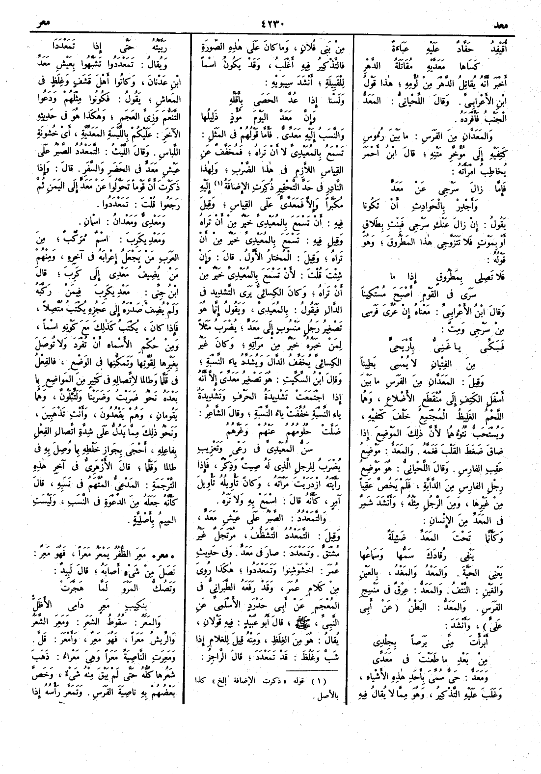 ( * قوله « ذكرت الاضافة إلخ » كذا بالأصل ) إِليه مكبراً وإِلا فَمَعَدِّي على القياس وقيل فيه أَن تَسْمَعَ بالمُعَيْدي خير من أَن تراه وقيل فيه تسمع بالمعيدي خير من أَن تراه وقيل المختار الأَول قال وإِن شئت قلت لأَنْ تسمعَ بالمعيدي خير من أَن تراه وكان الكسائي يرى التشديد في الدال فيقول بالمُعَيدِّيِّ ويقول إِنما هو تصغير رجل منسوب إِلى معدّ يضرب مثلاً لمن خَبَرُه خير من مَرْآتِه وكان غير الكسائي يخفف الدال ويشدد ياء النسبة وقال ابن السكيت هو تصغير معدّي إِلا أَنه إِذا اجتمعت تشديدة الحرف وتشديدة ياء النسبة خفت ياء النسبة وقال الشاعر ضَلَّتْ حُلُومُهُمُ عنهمْ وغَرَّهُمُ سَنُّ المُعَيديِّ في رَعْيٍ وتَعْزِيبِ يضرب للرجل الذي له صيت وذكر فإذا رأَيته ازدريت مَرْآتَه وكان تأْويلُه تأْويلَ آمر كأَنه قال اسمع به ولا تره والتَّمَعْدُدُ الصبر على عيش معدّ وقيل التمعدد التشَظُّف مُرْتَجَل غير مشتق وتَمَعْدَدَ صار في مَعَدّ وفي حديث عمر اخْشَوْشِنُوا وتَمَعْدَدُوا هكذا روي من كلام عمر وقد رفعه الطبراني في المعجم عن أَبي حدرد الأَسلمي عن النبي صلى الله عليه وسلم قال أَبو عبيد فيه قولان يقال هو من الغلظ ومنه قيل للغلام إِذا شب وغلظ قد تمعدد قال الراجز رَبَّيْتُه حتى إِذا تَمَعْدَدا ويقال تمعددوا تشبهوا بعيش مَعَدّ بن عدنان وكانوا أَهل قَشَف وغِلَظ في المَعاش يقول فكونوا مثلهم ودَعُوا التَّنَعُّمَ وزِيَّ العجم وهكذا هو في حديث الآخر عليكم باللِّبْسةِ المَعَدِّية أَي خُشُونةِ اللِّباس وقال الليث التمعدد الصبر على عيش مَعَدّ في الحضر والسفر قال وإِذا ذكرت أَن قوماً تحولوا عن معدٍّ إِلى اليمن ثم رجعوا قلت تَمَعْدَدُوا ومَعْدِيٌّ ومَعْدانُ اسمان ومَعْديكَرِبَ اسم مركب من العرب من يجعل إِعرابه في آخره ومنهم من يضيف مَعْدِي إِلى كَرِبَ قال ابن جني معديكرب فيمن ركبه ولم يضف صدره إِلى عجزه يكتب متصلاً فإِذا كان يكتب كذلك مع كونه اسماً ومن حكم الأَسماء أَنْ تُفْرَد ولا توصل بغيرها لقوتها وتمكنها في الوضع فالفِعْلُ في قَلَّما وطالما لاتصاله في كثير من المواضع بما بعده نحو ضربت وضربنا ولتُبلَوُنَّ وهما يقومان وهم يقعدون وأَنتِ تذهبين ونحو ذلك مما يدل على شدة اتصال الفعل بفاعله أَحْجَى بجواز خلطه بما وُصِلَ به في طالما وقلما قال الأَزهري في آخر هذه الترجمة المَدْعِيُّ المُتَّهَمُ في نسبه قال كأَنه جعله من الدِّعْوة في النسب وليست الميم بأَصلية ( معر ) مَعِرَ الظُّفُرُ يَمْعَرُ مَعَراً فهو مَعِرٌ نَصَلَ من شيء أَصابه قال لبيد وتَصُكُّ المَرْوَ لَمَّا هَجَّرَتْ بِنَكِيبٍ مَعِرٍ دَامِي الأَظَل والمَعَرُ سُقوطُ الشَعر ومَعِرَ الشعَرُ والرِّيشُ مَعَراً فهو مَعِرٌ وأَمْعَرَ قَلَّ ومَعِرَت الناصِيةُ مَعَراً وهي مَعْراء ذهب شعَرُها كلُّه حتى لم يبق منه شيء وخص بعضهم به ناصية الفرس وتَمَعَّر رأْسُه إِذا
