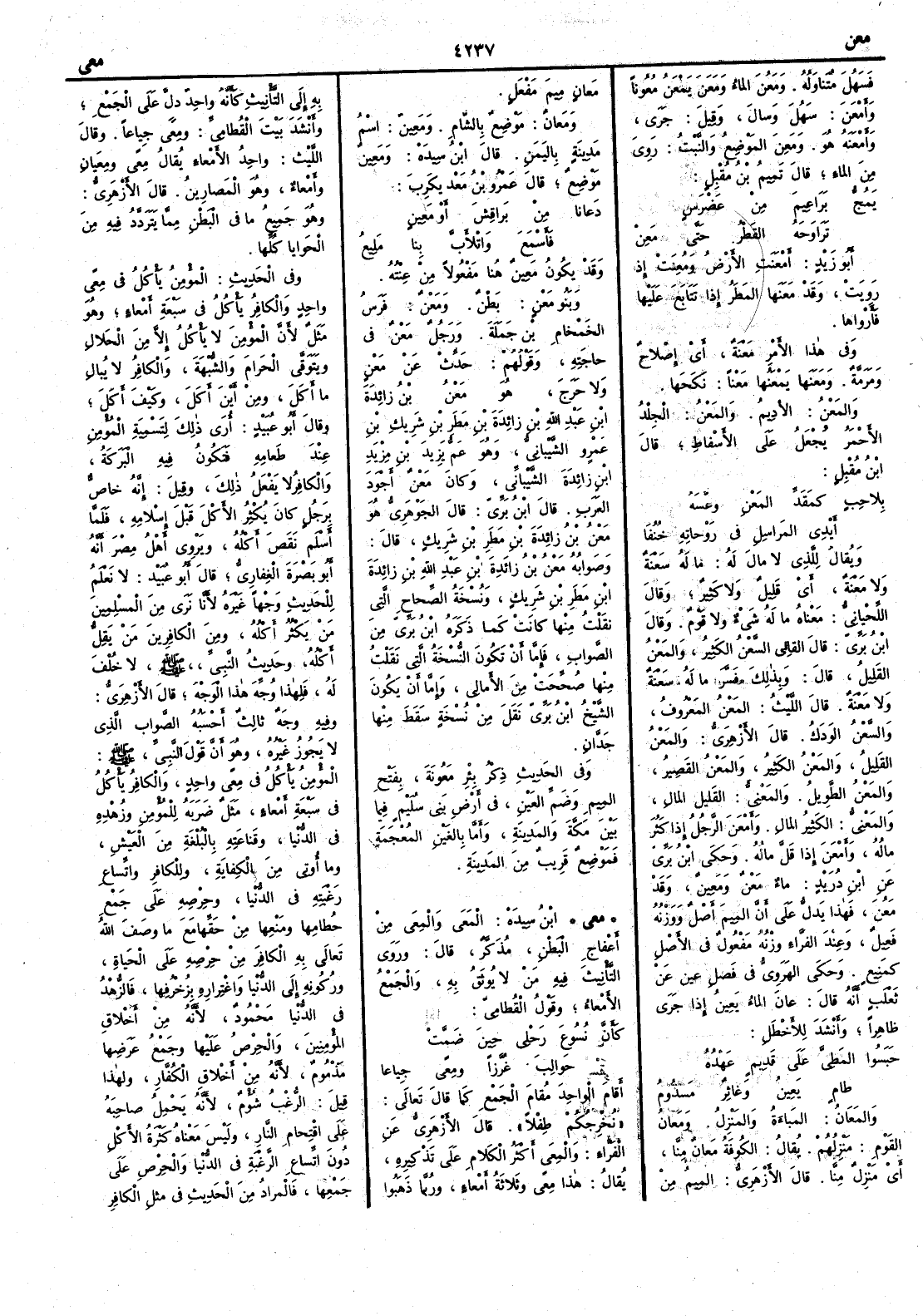 ( معي ) : ابن سيده : المَعَى و المِعَى من أَعْفاج البطن مذكر قال : وروى التأْنيث فيه من لا يوثق به والجمع الأَمعاءُ : وقول القطامي : كأَنَّ نُسُوعَ رَحْلي حين ضمَّتْ حَوالِبَ غُرَّزاً ومِعًى جِياعاأقام الواحد مقام الجمع كما قال تعالى : { نُخْرِجكم طِفْلاً } قال الأَزهري عن الفراء : و المِعَى أَكثر الكلام على تذكيره يقال : هذا مِعًى وثلاثة أَمعاء وربما ذهبوا به إِلى التأْنيث كأَنه واحد دلَّ على الجمع وأَنشد بيت القطامي : و مَعًى جِياعاً . وقال الليث : واحد الأَمْعاءِ يقال مِعًى و مِعَيانِ و أَمْعاء وهو المَصارين . قال الأَزهري : وهو جميع ما في البطن مما يتردد فيه من الحَوايا كلها . وفي الحديث : المؤمنُ يأْكل في مِعًى واحد والكافر يأْكل في سبعة أَمْعاءٍ وهو مَثَل لأَن المؤمن لا يأْكل إلا من الحلال ويتوقى الحرام والشبهة والكافر لا يبالي ما أَكل ومن أَين أَكل وكيف أَكل وقال أَبو عبيد : أُرى ذلك لتَسمية المؤمن عند طَعامه فتكون فيه البركة والكافر لا يَفعل ذلك وقيل : إِنه خاص برجل كان يُكثر الأَكل قبل إِسلامه فلما أَسلم نقص أَكله ويروي أَهل مصر أَنه أَبو بَصْرة الغِفاريّ قال أَبو عبيد : لا نعلم للحديث وجهاً غيره لأَنا نرى من المسلمين من يكْثُر أَكله ومن الكافرين مَن يقلّ أَكله وحديث النبي لا خُلْفَ له فلهذا وُجِّه هذا الوجه قال الأَزهري : وفيه وجه ثالث أَحسَبه الصواب الذي لا يجوز غيره وهو أَن قول النبي : المؤمن يأْكل في مَعًى واحد والكافر يأْكل في سبعة أَمعاءٍ مَثَلٌ ضربه للمؤمن وزُهْدِه في الدنيا وقَناعَته بالبُلْغة من العيش وما أُوتي من الكِفاية وللكافر واتساع رَغبته في الدنيا وحِرْصِه على جَمْع حُطامها ومَنْعها من حقها مع ما وصَف اللَّهُ تعالى به الكافرَ من حِرْصه على الحياة ورُكونه إِلى الدنيا واغْتِراره بزُخْرُفِها فالزُّهد في الدنيا محمود لأَنه من أَخلاق المؤمنين والحِرْص عليها وجَمْعُ عَرَضِها مذموم لأَنه من أَخلاق الكفار ولهذا قيل : الرُّغْبُ شُؤْمٌ لأَنه يحمل صاحبه على اقتحام النار وليس معناه كثرة الأَكل دون اتساع الرغبة في الدنيا والحِرْص على جمعها فالمراد من الحديث في مثل الكافر