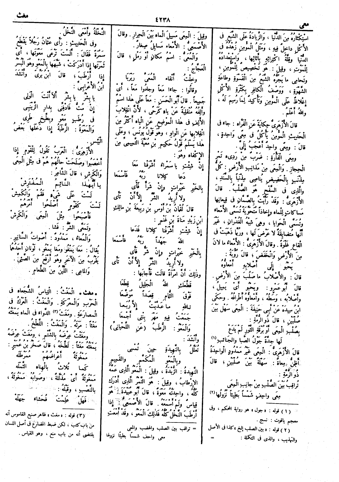 استكثاره من الدنيا والزيادة على الشبع في الأَكل داخل فيه ومثل المؤمن زهدهُ في الدنيا وقلة اكتراثه بأَثاثِها واستعدادُه للموت وقيل : هو تخصيص للمؤمن وتَحامِي ما يجرُّه الشبع من القَسْوة وطاعةِ الشهوة ووَصْفُ الكافر بكَثرة الأَكل إِغلاظٌ على المؤمن وتأْكيد لما رُسِمَ له واللَّه أعلم . قال الأَزهري حكاية عن الفراء : جاء في الحديث المؤمن يأْكل في مِعًى واحِدةٍ قال : و مِعًى واحدٌ أَعْجَبُ إِليَّ . و مِعَى الفأْرة : ضَرْبٌ من رَدِيءِ تَمْرِ الحجاز . و المِعَى مِن مَذانِب الأَرض : كلُّ مِذْنَب بالحَضِيض يُناصِي مِذْنَباً بالسَّنَدِ والذي في السَّفْح هو الصُّلْبُ . قال الأَزهري : وقد رأَيت بالصَّمَّان في قِيعانها مَساكاتٍ للماء وإِخاذاً مُتَحَوِّية تسمى الأَمْعاء وتسمى الحَوايا وهي شبه الغُدْران غير أَنها مُتضايِقةٌ لا عَرْضَ لها ورُبما ذَهَبَتْ في القاع غَلْوةً . وقال الأَزهري : الأَمْعاء ما لانَ من الأَرض وانْخَفض قال رؤبة : يَحْبُو إِلى أَصلابه أَمْعاؤه قال : والأَصْلاب ما صَلُبَ من الأَرض . قال أَبو عمرو : ويَحْبُو أَي يَميلُ وأَصْلابُه وَسَطُه و أَمْعاؤه أَطْرافُه . وحكى ابن سيده عن أَبي حنيفة : المِعَى سَهْل بين صُلْبَيْنِ قال ذو الرمة : بِصُلبِ المِعَى أَبو بُرْقةِ الثَّوْرِ لم يَدَعْ لها جِدَّةً جَوْلُ الصَّبا والجَنائبِ قال الأَزهري : المِعَى غير ممدود الواحدة أَظن مِعاةٌ سَهْلة بين صُلْبَيْن قال ذو الرمة : تراقِبُ بَيْنَ الصُّلْبِ مِنْ جانِبِ المِعَى مِعَى واحِفٍ شَمْساً بطيئاً نُزُولُها وقيل : المِعَى مَسِيل الماء بين الحِرار . وقال الأَصمعي : الأَمْعاء مَسايلُ صغار . و المُعَيُّ : اسم مكان أَو رَمْل قال العجاج : وخِلْتُ أَنْقاء المُعَيِّ رَبْرَبا وقالوا : جاءا مَعاً وجاؤوا مَعاً أَي جميعاً . قال أَبو الحسن : معاً على هذا اسم وأَلفه مُنقلبة عن ياء كرَحًى لأَن انقلاب الأَلف في هذا الموضع عن الياء أَكثر من انقلابها عن الواو وهو قول يونس وعلى هذا يسلم قول حَكِيم بن مُعَيَّة التَّمِيمِي من الإِكْفاء وهو : إِنْ شِئْتِ يا سَمْراء أَشْرَفْنا مَعَا دَعا كِلانا رَبَّه فأَسْمْعا ... بالخَيْرِ خَيْراتٍ وإِنْ شَرًّا فأَى ولا أُرِيدُ الشرَّ إِلا أَنْ تَأَى قال لُقمان بن أَوْس بن ربيعة بن مالك بن زيد مناة بن غنم : إِن شئت أَشرفْنا كِلانا فدَعا اللَّهَ جَهْداً رَبَّه فأسْمَعا ... بالخَيرِ خَيراتٍ وإِن شَرٌّ فأَى ولا أُريدُ الشرَّ إِلاَّ أَن تَأى وذلك أَن امرأَة قالت فأَجابها : قَطَّعَكِ اللَّهُ الجَلِيلُ قِطَعَا فَوْقَ الثُّمامِ قِصَداً مُوَضَّعَا تاللَّهِ ما عَدَّيْتُ إِلاَّ رُبعا جَمَعْتُ فيه مَهْرَ بِنْتي أَجْمَعا و المَعْوُ : الرُّطب عن اللحياني وأَنشد : تُعَلَّلُ بالنَّهِيدَةِ حينَ تُمْسِي وبالمَعْوِ المُكَمَّمِ والقَمِيمِ النَّهِيدةُ : الزُّبْدة وقيل : المَعْو الذي عَمَّه الإِرْطابُ وقيل : هو التمر الذي أَدَرك كله واحدته مَعْوةٌ قال أَبو عبيدة : هو قياس ولم أَسمعه . قال الأَصمعي : إِذا أَرطب النخل كله فذلك المَعْوُ وقد أَمْعَتِ النخلة و أَمْعَى النخل . وفي الحديث : رأَى عثمانُ رجُلاً يَقطع سَمُرَةً فقال : أَلَسْتَ تَرْعَى مَعْوَتَها أَي ثَمَرَتها إِذا أَدْرَكَتْ شبَّهها بالمَعْو وهو البُسْرُ إِذا أَرْطَب قال ابن بري وأَنشد ابن الأَعرابي : يا بِشْرُ يا بشْرُ أَلا أَنتَ الوَلي إِن مُتُّ فادْفِنِّي بدارِ الزَّيْنَبي في رُطَبٍ مَعْوً وبِطِّيخٍ طَرِي و المَعْوة : الرُّطَبة إِذا دَخلها بعض اليبس . الأَزهري : العرب تقول للقوم إِذا أَخصبوا وصَلَحت حالُهم هم في مِثْلِ المِعَى والكَرِش قال الراجز : يا أَيُّهذا النائمُ المُفْتَرِشْ لستَ على شيءٍ فَقُمْ وانْكَمِشْ لستَ كقَوْم أَصْلَحُوا أَمرَهم فأَصْبَحُوا مِثْلَ المِعَى والكَرِشْ و تَمَعَّى الشرُّ : فَشا . و المُعاء ممدود أَصواتُ السَّنانير . يقال : مَعَا يَمْعُو ومغا يَمْغُو لونان أَحدهما يقرب من الآخر وهو أَر