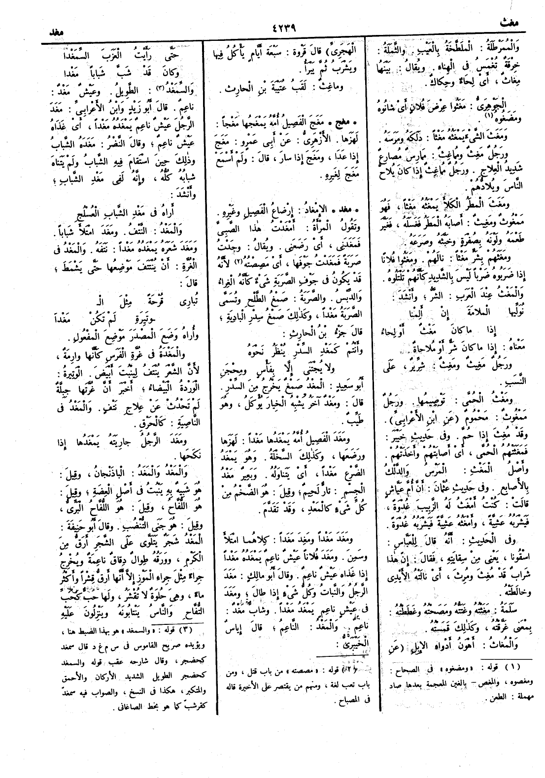 والمُمَرْطَلة الملطخة بالعيب والثَّملة خرقة تُغْمَس في الهِناء ويقال بينهما مِغاثٌ أَي لحاءٌ وحِكاكٌ الجوهري مَغَثُوا عِرْض فلان أَي شانوه ومضَغُوه ومغَثَ الشيءَ يَمْغَثه مَغْثاً دَلَكَه ومَرَسه ورجل مَغْثٌ ومُماغِثٌ مُمارِسُ مُصارع شديدُ العلاج ورجل مُماغِثٌ إِذا كان يُلاحُّ الناس ويُلادُّهم ومغثَ المطرُ الكَلأَ يَمْغَثُه مَغْثاً فهو مَمْغُوثٌ ومَغِيثٌ أَصابه المطر فغسله فغيَّر طعمه ولونه بصُفرة وخَبَّثَه وصرعه ومَغَثَهم بشَرٍّ مَغْثاً نالهم ومغثوا فلاناً إِذا ضربوه ضرباً ليس بالشديد كأَنهم تَلْتَلُوه والمَغْثُ عِند العرب الشَّرُّ وأَنشد نُوَلِّيها الملامةَ إِن أَلِمْنا إِذا ما كان مَغْثٌ أَو لِحاءُ معناه إِذا ما كان شر أَو مُلاحاة ورجل مَغِيثٌ ومَغِثٌ شِرِّيرٌ على النسب ومَغْثُ الحُمَّى تَوْصِيمُها ورجل مَمْغُوثٌ محموم عن ابن الأَعرابي وقد مُغِثَ إِذا حُمَّ وفي حديث خيبر فمَغَثَتْهم الحُمَّى أَي أَصابتهم وأَخذتهم وأَصل المَغْثِ المَرْسُ والدَّلْكُ بالأَصابع وفي حديث عثمان أَنَّ أُمَّ عَيَّاشٍ قالت كنتُ أَمْغَثُ له الزبيبَ غُدْوَةً فيشربه عَشِيَّةً وأَمْغَثُه عَشيَّةً فيشربه غُدْوَةً وفي الحديث أَنه قال للعباس اسقونا يعني من سِقايتِه فقال إِنَّ هذا شرابٌ قد مُغِث ومُرِث أَي نالته الأَيدي وخالَطَتْه سَلمَة مَغَثْتُه وغَتَتُّه ومَصَحْتُه وغَطَطْتُه بمعنى غرَّقته وكذلك قَمَسْتُه والمُغاثُ أَهونُ أَدواء الإِبل عن الهَجَريّ قال قروة سبعة أَيام يأْكل فيها ويشرب ثم يبرأُ وماغِثٌ لقبُ عُتَيْبَة بن الحارث ( مغج ) مَغَجَ الفَصِيلُ أُمَّه يَمْغَجُها مَغْجاً لَهَزَها الأَزهري عن أَبي عمرو مَغَجَ إِذا عَدَا ومَغَجَ إِذا سارَ قال ولم أَسمع مَغَجَ لغيره( مغد ) الإِمْغادُ إِرْضاعُ الفصيل وغيره وتقول المرأَة أَمْغَدْتُ هذا الصبيَّ فَمَغَدَني أَي رَضَعَني ويقال وجَدْتُ صَرَبَةً فَمَغَدْتُ جَوْفَها أَي مَصِصْتُه لأَنه قد يكون في جوف الصرَبَة شيء كأَنه الغِراءُ والدِّبْسُ والصرَبَةُ صَمْغُ الطلْحِ وتسمى الصربةُ مَغْداً وكذلك صَمْغُ سِدْرِ البادية قال جزء بن الحرث وأَنْتُمْ كَمَغْدِ السدْرِ يُنْظَرُ نحوَه ولا يُجْتَنَى إِلا بِفأْسٍ ومِحْجَنِ أَبو سعيد المغْدُ صمغ يخرج من السِّدْرِ قال ومَغْدٌ آخر يشبه الخيار يؤْكل وهو طيب ومَغَدَ الفَصِيلُ أُمَّه يَمْغَدُها مَغْداً لَهَزَها ورَضَعَها وكذلك السخلة وهو يَمْغَدُ الضرْعَ مَغْداً أَي يتناوله وبعير مَغْدُ الجِسْمِ تارٌّ لَحِيم وقيل هو الضَّخْم من كل شيءٍ كالمَعْدِ وقد تقدم ومَغَدَ مَغْداً ومَغِدَ مَغَداً كلاهما امتَلأَ وسَمِنَ ومَغَدَ فلاناً عيشٌ ناعمٌ يَمْغَدُه مَغْداً إِذا غَذاه عَيْشٌ ناعم وقال أَبو مالك مَغَدَ الرجلُ والنباتُ وكلُّ شيءٍ إِذا طال ومَغَدَ في عَيْشٍ ناعمٍ يَمْغَدُ مَغْداً وشابٌّ مَغْدٌ ناعمٌ والمَغْدُ الناعِمُ قال إِياس الخيبري حتى رَأَيْتُ العَزَبَ السِّمَغْدا وكان قَدْ شَبَّ شَباباً مَغْدا والسِّمَغْد