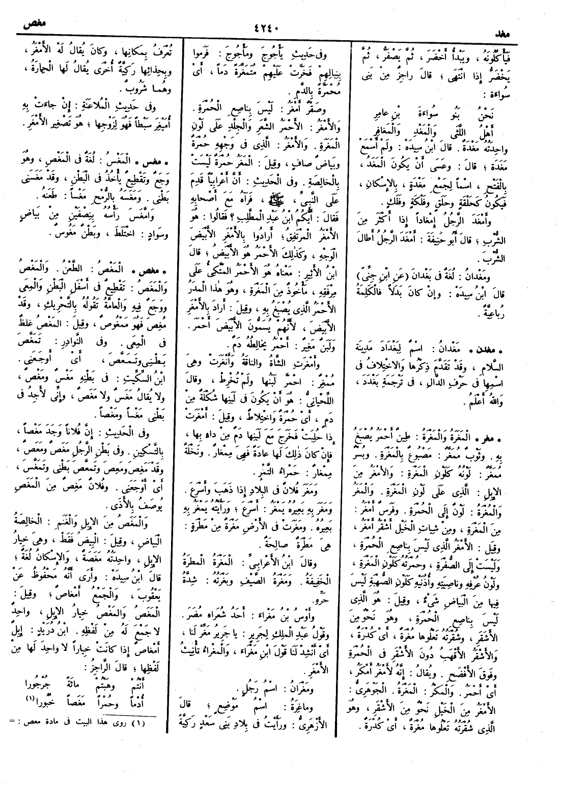 ( مغدن ) مَغْدانُ اسم لبَغْدادَ مدينة السَّلام وقد تقدم ذكرها والاختلاف في اسمها في حرف الدال في ترجمة بغدد والله أَعلم ( مغر ) المَغَرَةُ والمَغْرَةُ طِينٌ أَحمرُ يُصْبَغُ به وثوبٌ مُمَغَّرٌ مصبوغ بالمغرة وبُسْرٌ مُمَغَّر لونُه كلونِ المَغْرَةِ والأَمْغَرُ من الإِبل الذي على لون المَغْرَةِ والمَغَرُ والمُغْرَةُ لونٌ إِلى الحُمْرَةِ وفرس أَمْغَرُ من المَغْرَةِ ومن شِياتِ الخيل أَشْقَرُ أَمْغَرُ وقيل الأَمْغَرُ الذي ليس بناصِع الحُمرَة وليست إِلى الصفرة وحمرته كلَوْن المَغْرَةِ ولون عُرْفِهِ وناصيتِه وأُذنَيه كلون الصُّهْبة ليس فيها من البياض شيء وقيل هو الذي ليس بناصع الحمرة وهو نحوٌ من الأَشقَرِ وشُقْرَتُهُ تَعلوها مُغْرَةٌ أَي كُدْرَةٌ والأَشقَرُ الأَقْهَبُ دون الأَشقَرِ في الحُمْرَة وفوق الأَفْضَحِ ويقال إِنه لأَمْغَرُ أَمْكَرُ أَي أَحمر والمَكْرُ المَغْرَةُ الجوهري الأَمْغَرُ من الخيل نحوٌ من الأَشقَرِ وهو الذي شُقْرته تعلوها مُغْرَة أَي كدرةٌ وفي حديث يأْجوج ومأْجوج فَرَمَوْا بِنِبالِهِمْ فخرّت عليهم مُتَمَغِّرَةً دماً أَي مُحْمرَّة بالدَّم وصقر أَمْغَرُ ليس بناصِع الحمرة والأَمغرُ الأَحمرُ الشعَرِ والجِلدِ على لونِ المَغَرَةِ والأَمغرُ الذي في وجهه حمرةٌ وبياضٌ صافٍ وقيل المَغَرُ حمرة ليست بالخالصة وفي الحديث أَن أَعرابيّاً قدِم على النبي صلى الله عليه وسلم فرآه مع أَصحابه فقال أَيُّكُم ابنُ عبد المطلب ؟ فقالوا هو الأَمغرُ المرتَفِقُ أَرادوا بالأَمغرِ الأَبيضَ الوجهِ وكذلك الأَحمرُ هو الأَبيضُ قال ابن الأَثير معناه هو الأَحمرُ المتَّكِئُ على مِرْفَقِه مأْخوذ من المَغْرَةِ وهو هذا المدَرُ الأَحمرُ الذي يُصْبَغُ به وقيل أَراد بالأَمغرِ الأَبيضَ لأَنهم يسمُّون الأَبيضَ أَحمرَ ولبنٌ مَغِيرٌ أَحمرُ يخالِطه دمٌ وأَمْغَرتِ الشاةُ والناقةُ وأَنْغَرَتْ وهي مُمْغِرٌ احمرَّ لبنُها ولم تُخْرِطْ وقال اللحياني هو أَن يكون في لبنها شُكْلَةُ من دم أَي حمرة واختلاط وقيل أَمغرَتْ إِذا حُلِبت فخرج مع لبنها دم من داءٍ بها فإِن كان ذلك لها عادةً فهي مِمْغارٌ ونخلة مِمْغارٌ حمراء التَّمرِ ومغَرَ فلان في البلاد إِذا ذهب وأَسرع ومغَرَ به بعيره يَمْغَرُ أَسرع ورأَيته يَمْغَرُ به بعيره ومغَرَتْ في الأَرض مَغْرَةٌ من مطَرَةٍ هي مطرة صالحة وقال ابن الأَعرابي المَغْرَةُ المطَرة الخفيفة ومَغْرَةُ الصيف وبَغْرَتُه شدة حره وأَوْسُ بن مَغْراء أَحد شعراء مُضَر وقول عبد الملك لجرير يا جرير مَغِّرْ لنا أَي أَنشِدْ لنا قولَ ابن مَغْرَاء والمغراء تأْنيث الأَمغرِ ومَغْرَانُ اسم رجل وماغِرَةُ اسم موضع قال الأَزهري ورأَيت في بلاد بني سعد رَكِيَّةً تعرف بمكانها وكان يقال له الأَمغرُ وبحذائها ركيةٌ أُخرى يقال لها الحِمارَةُ وهما شَرُوبٌ وفي حديث الملاعنة إِنْ جاءت به أُمَيْغِرَ سَبِطاً فهو لزوجها هو تصغير الأَمغرِ