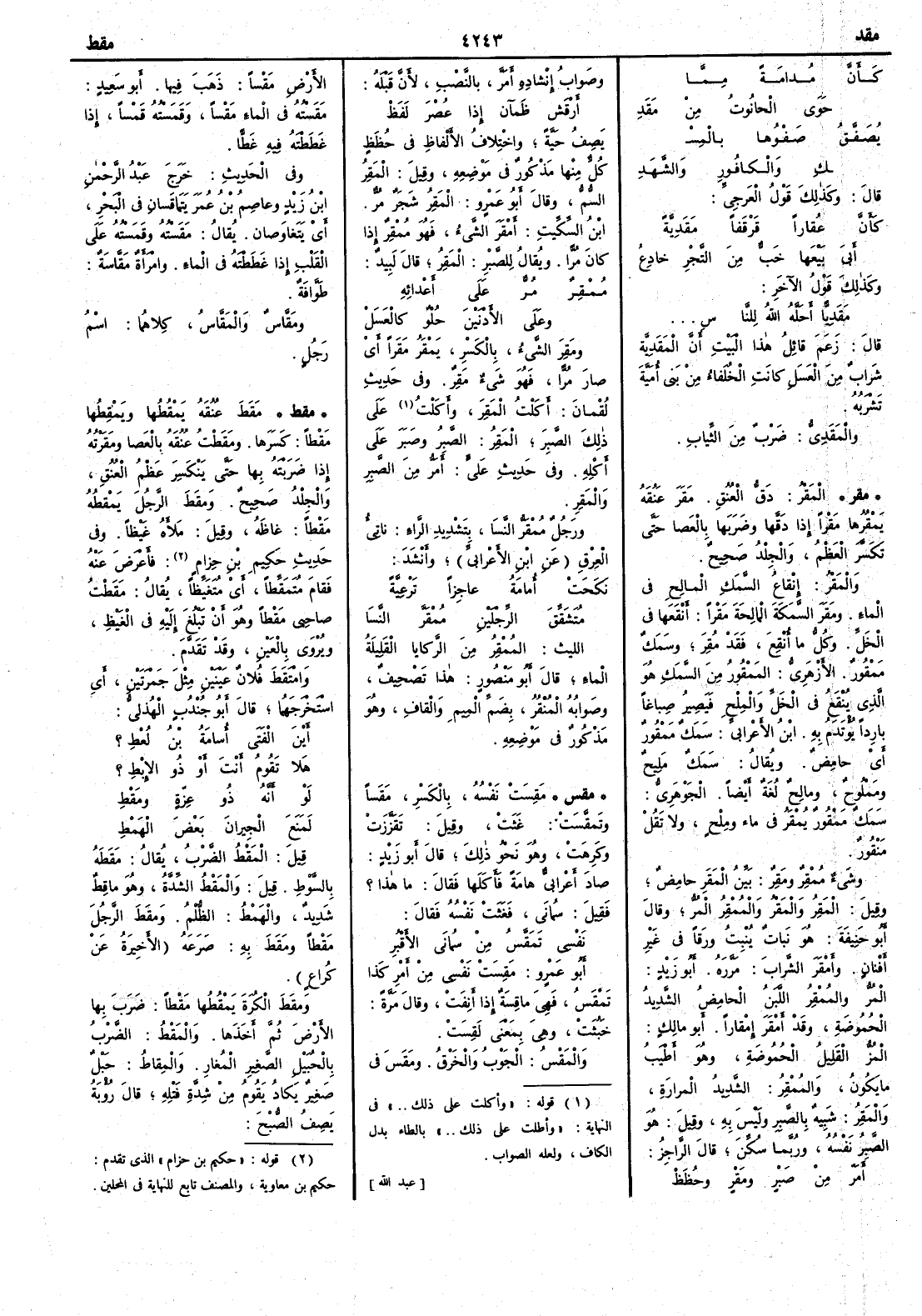 ( مقس ) مَقِسَتْ نفسُه بالكسر مقَساً وتمقَّست غَثَت وقيل تَقَزَّزَت وكَرِهَت وهو نحو ذلك قال أَبو زيد صادَ أَعرابيٌّ هامَةً فأَكلها فقال ما هذا ؟ فقيل سُمانى ففَثَتْ نفسُه فقال نَفْسي تَمَقَّسُ من سُماني الأَقْبُرِ أَبو عمرو مَقِسَتْ نفسي من أَمر كذا تَمْقَس فهي ماقِسَة إِذا أَنِفَت وقال مرة خَبُثَتْ وهي بمعنى لَقِسَتْ والمَقْس الجَوْب والخَرْق ومَقَس في الأَرض مَقْساً ذهب فيها أَبو سعيد مَقَسْتُه في الماء مَقْساً وَقَمَسْتُه قَمْساً إِذا غَطَطْتَه فيه غَطّاً وفي الحديث خرج عبد الرحمن بن زيد وعاصم بن عمر يَتَماقَسان في البحر أَي يَتَغاوَصان يقال مَقَسْتُه وقَمَسْتُه على القلب إِذا غَطَطْته في الماء امرأَة مَقَّاسَة طَوَّافة ومَقَّاس والمَقَّاس كلاهما اسم رجل( مقط ) مَقَطَ عُنقَه يَمْقُطها ويَمْقِطها مَقْطاً كسرها ومَقَطْتُ عُنُقه بالعَصا ومَقَرْتُه إِذا ضربتَه بها حتى ينكسر عظم العنق والجلد صحيح ومقَط الرجلَ يَمْقطه مَقْطاً غاظَه وقيل ملأَه غَيْظاً وفي حديث حَكيم بن حِزام