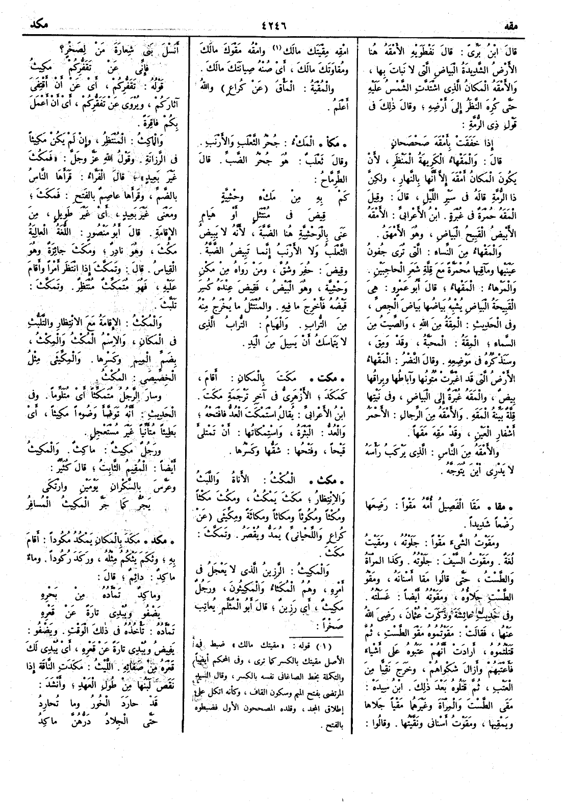 قال ابن بري قال نَفْطَويه الأَمْقَه هنا الأَرضُ الشديدة البياض التي لا نبات بها والأَمْقَهُ المكان الذي اشتدّت الشمسُ عليه حتى كُرِهَ النظرُ إلى أَرْضِه وقال ذلك في قول ذي الرمة إذا خَفَقَتْ بأَمْقَهَ صَحْصَحانٍ قال والمَقْهاءُ الكريهةُ المَنْظَرِ لأَنْ يكونَ المكانُ أَمْقَهَ إلا أَنها بالنهار ولكن ذا الرمة قاله في سَيْر الليل قال وقيل المَقَهُ حُمْرة في غُبْرة ابن الأَعرابي الأَمْقَهُ الأَبْيضُ القبيحُ البياضِ وهو الأَمْهَقُ والمَقْهاء من النِّساء التي تُرَى جُفونُ عينيها ومَآقِيها مْحْمرَّةً مع قلَّة شعرِ الحاجبين والمَرْهاءُ المَقْهاءُ قال أَبو عمرو هي القبيحةُ البياضِ يُشْبِه بياضُها الجِصِّ وفي الحديث المِقَةُ من الله والصِّيتُ من السماء المِقة المحبَّة وقد وَمِقَ وسنذكره في موضعه وقال النضر المَقْهاءُ الأَرضُ التي قد اغْبَرَّتْ مُتونُها وآباطُها وبِراقُها بيضٌ والمَقَهُ غُبْرةٌ إلى البياض وفي نَبْتِها قِلَّةٌ بَيِّنة المَقَهِ والأَمْقَهُ من الرجالِ الأَحْمرُ أَشْفارِ العينِ وقد مَقِهَ مَقَهاً والأَمْقَهُ من الناس الذي يركبُ رأْسَه لا يدري أَين يتوجه ( مقا ) مَقا الفَصيلُ أُمَّه مَقْواً رَضِعَها رَضْعاً شديداً ومَقَوْتُ الشيءَ مَقْواً جَلَوْتُه ومَقَيْتُ لغة ومقوت السيف جلوته وكذا المرآة والطَّسْت حتى قالوا مَقا أَسنانه ومَقْو الطست جَلاؤه ومَقَوْتُه أَيضاً غسلته وفي حديث عائشة وذكرت عثمان رضي الله عنهما فقالت مَقَوْتُمُوه مَقْوَ الطست ثم قتلتموه أَرادت أَنهم عَتَبُوه على أَشياء فأَعتبهم وأَزال شَكْواهم وخرج نقِيّاً من العَتْب ثم قتلوه بعد ذلك ابن سيده مَقَى الطسْتَ والمِرآة وغيرهما مَقْياً جَلاها ويَمْقِيها ومَقَوْت أَسناني ونَقَّيتها وقالوا امْقِه مِقْيَتَك مالك وامْقُه مَقْوَكَ مالَك ومُقاوَتَك مالَك أَي صُنْه صِيانَتَك مالَكَ والمُقْيَةُ المَأْقُ عن كراع والله أَعلم ( مكأ ) المَكْءُ جُحْر الثَّعْلَب والأَرْنَب وقال ثعلب هو جُحْر الضب قال الطِّرِمَّاح