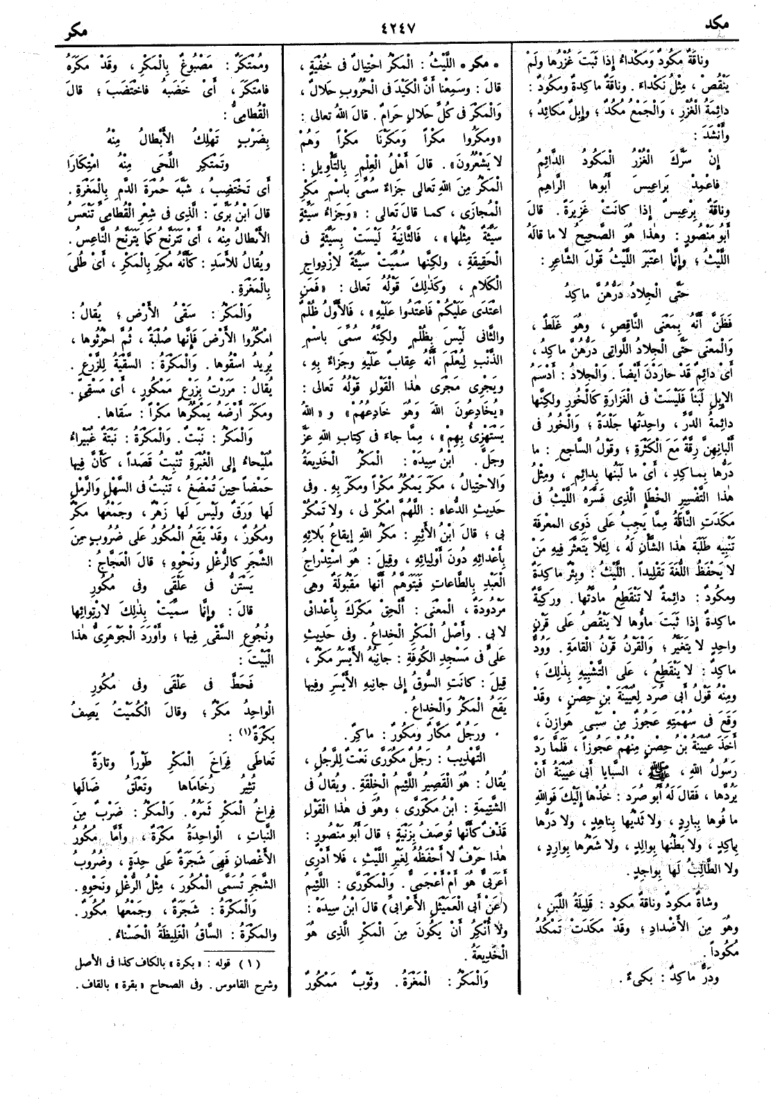 ( مكر ) الليث المَكْرُ احتيال في خُفية قال وسمعنا أَن الكيد في الحروف حلال والمكر في كل حلال حرام قال الله تعالى ومكروا مكراً ومكرنا مكراً وهم لا يشعرون قال أَهل العلم بالتأْويل المكر من الله تعالى جزاء سُمي باسم مكر المُجازَى كما قال تعالى وجزاء سيئة سيئة منها فالثانية ليست بسيئة في الحقيقة ولكنها سميت سيئة لازدواج الكلام وكذلك قوله تعالى فمن اعتدى عليكم فاعتدوا عليه فالأَول ظلم والثاني ليس بظلم ولكنه سمي باسم الذنب ليُعلم أَنه عِقاب عليه وجزاءٌ به ويجري مَجْرَى هذا القول قوله تعالى يخادعون الله وهو خادعهم والله يستهزئ بهم مما جاء في كتاب الله عز وجل ابن سيده المَكْرُ الخَدِيعَة والاحتيال مَكَرَ يَمْكُرُ مَكْراً ومَكَرَ به وفي حديث الدعاء اللهم امْكُرْ لي ولا تَمْكُرْ بي قال ابن الأَثير مَكْرُ الله إِيقاعُ بلائه بأَعدائه دون أَوليائه وقيل هو استدراج العبد بالطاعات فَيُتَوَهَّمُ أَنها مقبولة وهي مردودة المعنى أَلْحِقْ مَكْرَكَ بِأَعْدائي لا بي وأَصل المَكْر الخِداع وفي حديث عليّ في مسجد الكوفة جانِبُهُ الأَيْسَرُ مَكْرٌ قيل كانت السوق إِلى جانبه الأَيسر وفيها يقع المكر والخداع ورجل مَكَّارٌ ومَكُورٌ ماكِرٌ التهذيب رجل مَكْوَرَّى نعت للرجل يقال هو القصير اللئيم الخلقة ويقال في الشتيمة ابنُ مَكْوَرَّى وهو في هذا القول قذف كأَنها توصف بِزَنْيَةٍ قال أَبو منصور هذا حرف لا أَحفظه لغير الليث فلا أَدري أَعربي هو أَم أَعجمي والمَكْوَرَّى اللئيم عن أَبي العَمَيْثَلِ الأَعرابي قال ابن سيده ولا أُنكِر أَن يكون من المكر الذي هو الخديعة والمَكْرُ المَغْرَةُ وثوب مَمْكُورٌ ومُمْتَكَرٌ مصبوغ بالمَكْرِ وقد مَكَرَه فامْتَكَرَ أَي خَضَبَه فاخْتَضَبَ قال القُطامي بِضَرْبٍ تَهْلِكُ الأَبْطالُ مِنهُ وتَمْتَكِرُ اللِّحَى منه امْتِكَارَا أَي تَخْتَضِبُ شبَّه حمرة الدم بالمَغْرَةِ قال ابن بري الذي في شعر القُطامي تَنْعسُ الأَبطالُ منه أَي تَتَرَنَّحُ كما يَتَرَنَّحُ الناعِسُ ويقال للأَسد كأَنه مُكِرَ بالمَكْرِ أَي طُليَ بالمَغْرَةِ والمَكْرُ سَقْيُ الأَرض يقال امْكُرُوا الأَرض فإِنها صُلْبَةٌ ثم احرثوها يريد اسقوها والمَكْرَةُ السقْية للزرع يقال مررت بزرع مَمْكُورٍ أَي مَسْقِيٍّ ومَكَرَ أَرضه يَمْكُرُها مَكْراً سقاها والمَكْرُ نَبْتٌ والمَكْرَةُ نبتة غُبَيْراءُ مُلَيْحاءُ إِلى الغُبرة تُنْبِت قَصَداً كأَن فيها حَمْضاً حين تمضغ تَنْبُتُ في السهل والرمل لها ورق وليس لها زهر وجمعها مَكْرٌ ومُكُورٌ وقد يقع المُكُورُ على ضروب من الشجر كالرُّغْل ونحوه قال العجاج يَسْتَنُّ في عَلْقَى وفي مُكُورِ قال وإِنما سميت بذلك لارتوائها ونُجُوع السَّقْي فيها وأَورد الجوهري هذا البيت فَحَطَّ في عَلْقَى وفي مُكُورِ الواحد مَكْرٌ وقال الكميت يصف بكرة تَعاطَى فِرَاخَ المَكْرِ طَوْراً وتارَةً تُثِيرُ رُخَامَاها وتَعْلَقُ ضَالَها فراخ المَكْرِ ثمره والمَكْرُ ضرْب من النبات الواحدة مَكْرَة وأَما مُكور الأَغْصان فهي شجرة على حدة وضُرُوبُ الشجر تسمى المُكورَ مثل الرُّغْل ونحوه والمَكْرَة شجرة وجمعها مُكور والمَكْرَةُ الساقُ الغليظة الحسناء