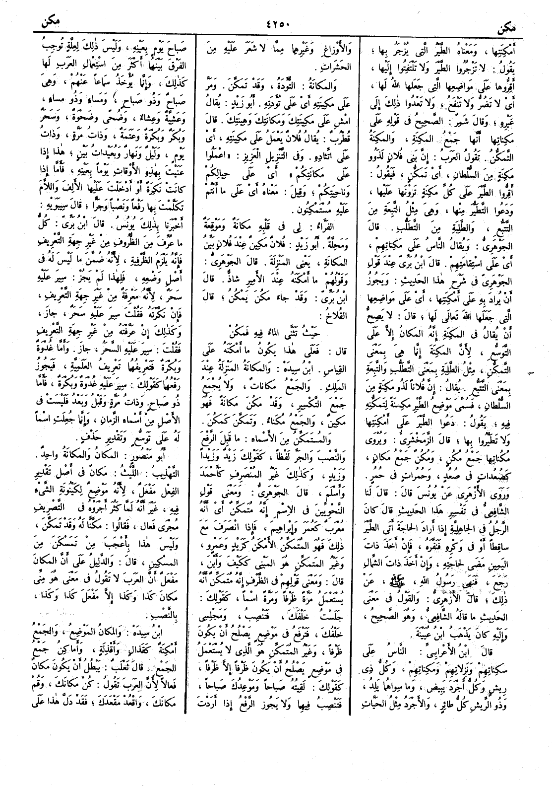 أَمْكِنتها ومعناه الطير التي يزجر بها يقول لا تَزْجُرُوا الطير ولا تلتفتوا إليها أَقِرُّوها على مواضعها التي جعلها الله لها أَي لا تضر ولا تنفع ولا تَعْدُوا ذلك إلى غيره وقال شمر الصحيح في قوله على مَكِناتِها أَنها جمع المَكِنَة والمَكِنةُ التمكن تقول العرب إن بني فلان لذوو مَكِنةٍ من السلطان أي تَمكُّنٍ فيقول أَقِرُّوا الطير على كل مَكِنةٍ ترَوْنَها عليها ودَعُوا التطير منها وهي مثل التَّبِعةِ مِنَ التَّتبُّعِ والطَّلِبةِ من التَّطلُّب قال الجوهري ويقال الناس على مَكِناتِهم أَي على استقامتهم قال ابن بري عند قول الجوهري في شرح هذا الحديث ويجوز أَن يراد به على أَمْكِنتها أَي على مواضعها التي جعلها الله تعالى لها قال لا يصح أَن يقال في المَكِنة إنه المكان إلا على التَّوَسُّعِ لأَن المَكِنة إنما هي بمعنى التَّمكُّنِ مثل الطَّلِبَة بمعنى التَّطَلُّبِ والتَّبِعَةِ بمعنى التَّتبُّع يقال إنَّ فلاناً لذو مَكِنةٍ من السلطان فسمي موضع الطير مَكِنةً لتمَكُّنه فيه يقول دَعُوا الطير على أَمْكِنتها ولا تَطَيَّرُوا بها قال الزمخشري ويروى مُكُناتها جمع مُكُنٍ ومُكُنٍ ومُكُنٌ جمع مَكانٍ كصُعُداتٍ في صُعُدٍ وحُمُراتٍ في حُمُرٍ وروى الأَزهري عن يونس قال قال لنا الشافعي في تفسير هذا الحديث قال كان الرجل في الجاهلية إذا أَراد الحاجة أَتى الطير َ ساقطاً أَو في وَكْرِه فنَفَّرَهُ فإن أَخذ ذات اليمين مضى لحاجته وإن أَخذ ذات الشمال رجع فنَهى رسولُ الله صلى الله عليه وسلم عن ذلك قال الأَزهري والقول في معنى الحديث ما قاله الشافعي وهو الصحيح وإليه كان يذهب ابن عُيَيْنةَ قال ابن الأَعرابي الناس على سَكِناتِهم ونَزِلاتِهم ومَكِناتِهم وكلُّ ذي ريشٍ وكلُّ أَجْرَدَ يبيض وما سواهما يلد وذو الريش كل طائر والأَجْرَدُ مثل الحيات والأَوْزاغ وغيرهما مما لا شعر عليه من الحشرات والمَكانةُ التُّؤدَةُ وقد تَمَكَّنَ ومَرَّ على مَكِينته أَي على تُؤدَتِه أَبو زيد يقال امْشِ على مَكِينتِكَ ومَكانتك وهِينَتِكَ قال قطرب يقال فلان يعمل على مَكِينتِه أَي على اتِّئاده وفي التنزيل العزيز اعْمَلُوا على مَكانَتِكم أَي على حيالِكم وناحيتكم وقيل معناه أَي على ما أَنتم عليه مستمكنون الفراء لي في قلبه مَكانَةٌ ومَوْقِعة ومَحِلَّةٌ أَبو زيد فلان مَكين عند فلان بَيِّنُ المَكانَةِ يعني المنزلة قال الجوهري وقولهم ما أَمكنه عند الأَمير شاذ قال ابن بري وقد جاء مَكُنَ يَمْكُنُ قال القُلاخُ حيث تَثَنَّى الماءُ فيه فمَكُنْ قال فعلى هذا يكون ما أَمْكَنَه على القياس ابن سيده والمَكانةُ المَنْزلة عند الملك والجمع مَكاناتٌ ولا يجمع جمع التكسير وقد مَكُنَ مَكانَةً فهو مَكِينٌ والجمع مُكَناء وتَمَكَّنَ كَمَكُنَ والمُتَمَكِّنُ من الأَسماء ما قَبِلَ الرفع والنصب والجر لفظاً كقولك زيدٌ وزيداً وزيدٍ وكذلك غير المنصرف كأَحمدَ وأَسْلَمَ قال الجوهري ومعنى قول النحويين في الاسم إنه متمكن أَي أَنه معرب كعمر وإبراهيم فإذا انصرف مع ذلك فهو المُتَمَكِّنُ الأَمْكَنُ كزيد وعمرو وغير المتمكن هو المبني ككَيْفَ وأَيْنَ قال ومعنى قولهم في الظرف إنه مُتَمَكِّنٌ أَنه يستعمل مرة ظرفاً ومرة اسماً كقولك جلست خلْفَكَ فتنصب ومجلسي خَلْفُكَ فترفع في موضع يصلح أَن يكون ظَرْفاً وغير المُتَمَكِّن هو الذي لا يستعمل في موضع يصلح أَن يكون ظَرْفاً إلا ظرفاً كقولك لقيته صباحاً وموعدك صباحاً فتنصب فيهما ولا يجوز الرفع إذا أَردت صباح يوم بعينه وليس ذلك لعلة توجب الفرق بينهما أَكثر من استعمال العرب لها كذلك وإنما يؤْخذ سماعاً عنهم وهي صباحٌ وذو صباحٍ ومَساء وذو مَساء وعَشِيّة وعِشاءٌ وضُحىً وضَحْوَة وسَحَرٌ وبُكَرٌ وبُكْرَةٌ وعَتَمَةٌ وذاتُ مَرَّةٍ وذاتُ يَوْمٍ وليلٌ ونهارٌ وبُعَيْداتُ بَيْنٍ هذا إذا عَنَيْتَ بهذه الأَوقات يوماً بعينه فأَما إذا كانت نكرة أَو أَدخلت عليها الأَلف واللام تكلمت بها رفعاً ونصباً وجرّاً قال س